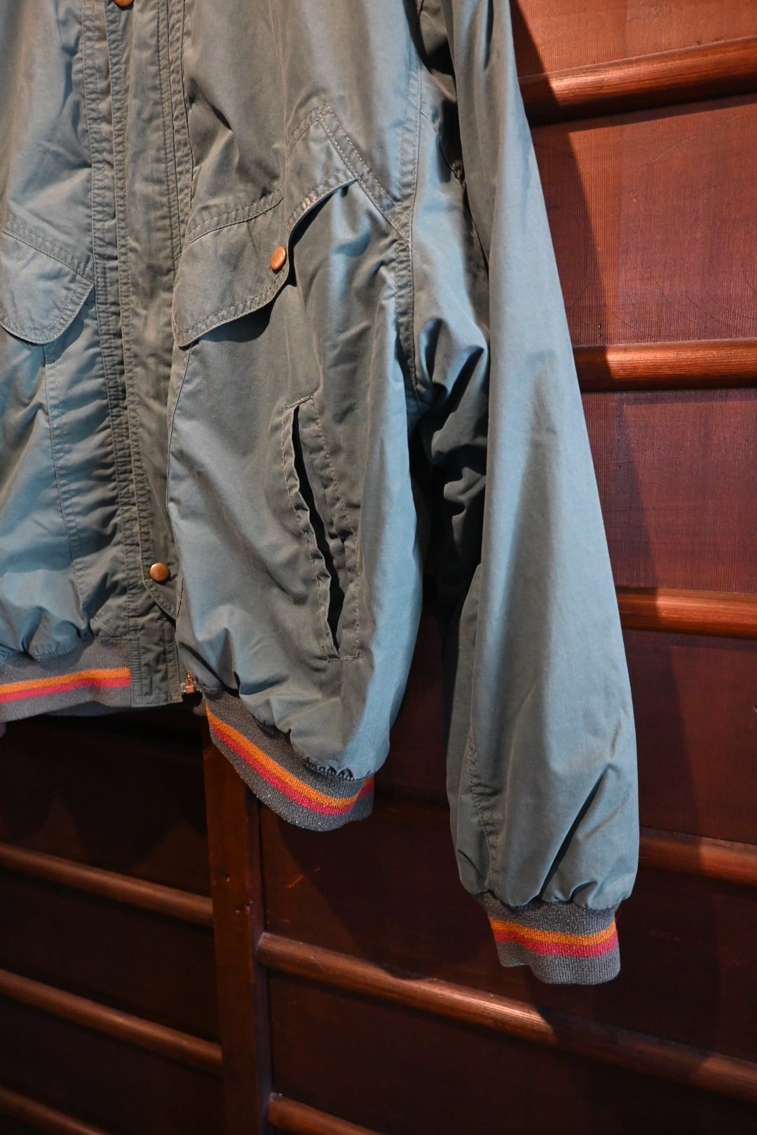 深みのあるブルーグリーンのボディに、リブ部分のレッド × オレンジがアクセントとなった一着です。
