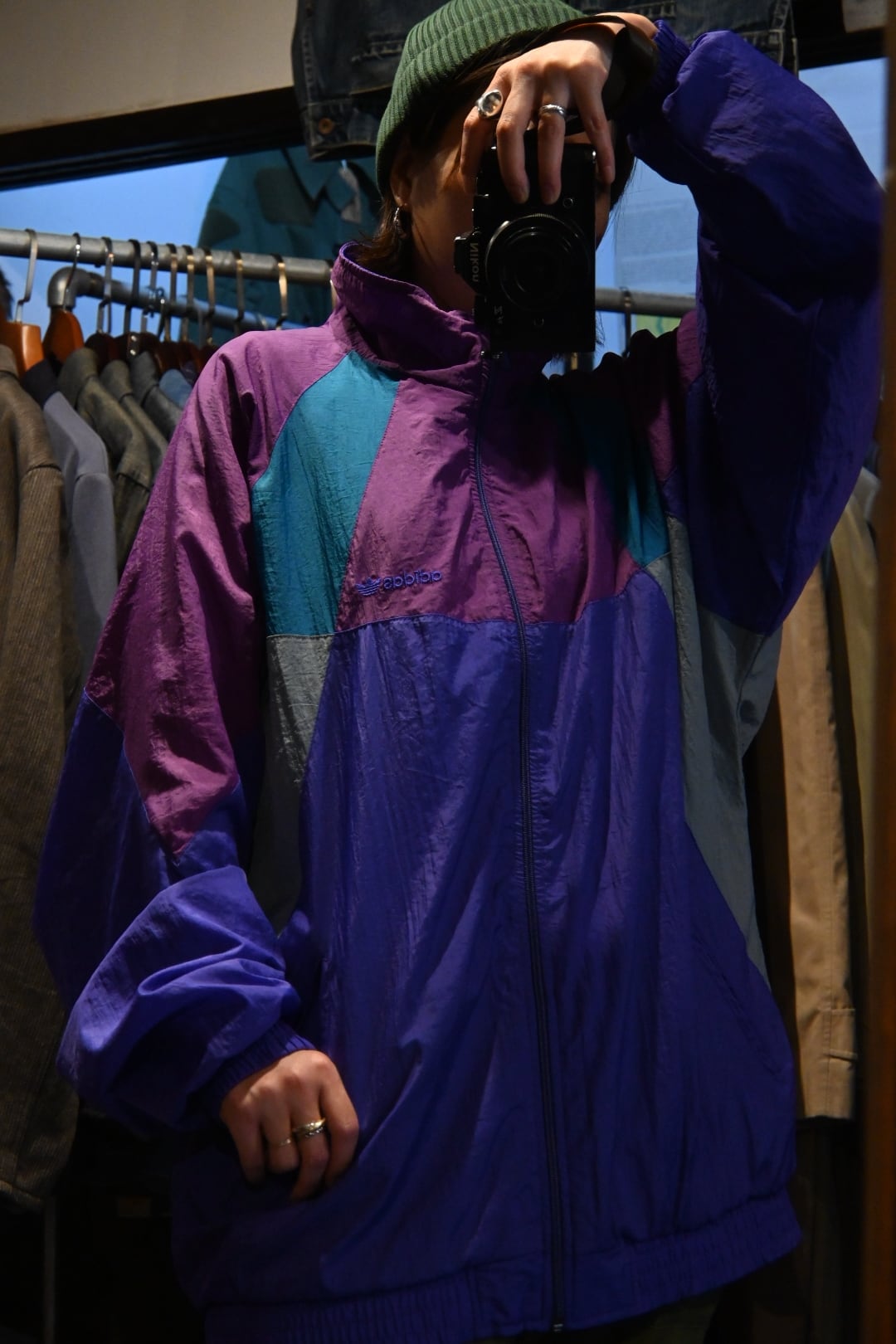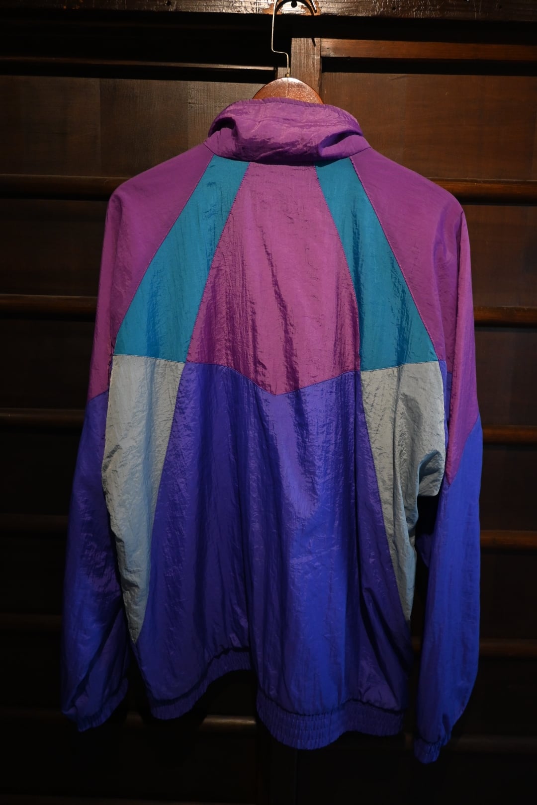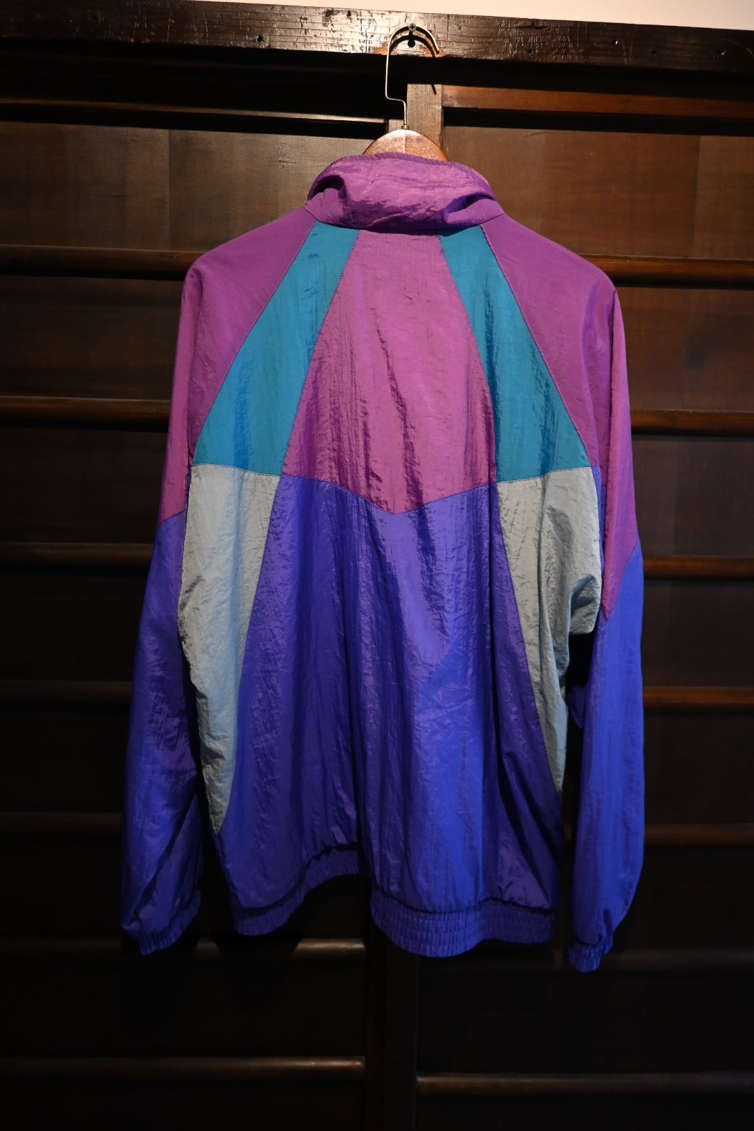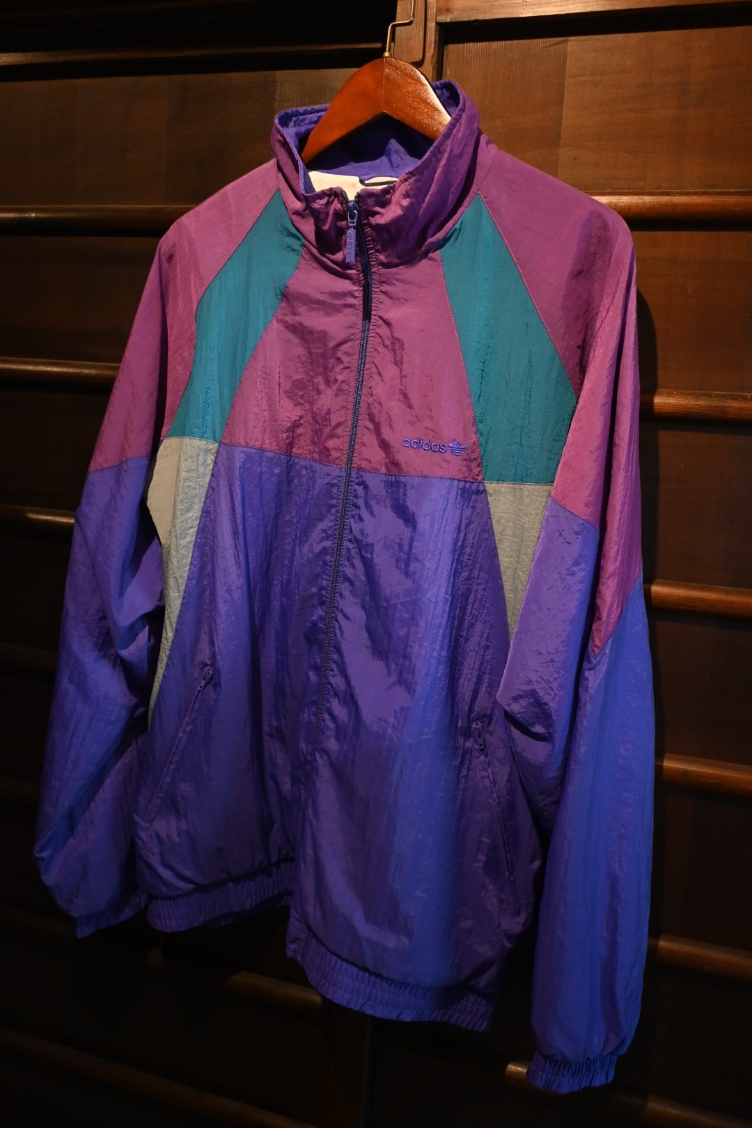 1990年代のadidasのヴィンテージナイロンジャケット。パープル、薄いパープル、ティールグリーン、ライトグレーの4色を大胆に切り替えた、レトロな雰囲気漂う一着です。左胸には同系色で控えめにあしらわれたトレフォイルロゴの刺繍が入り、ブランドらしいディテールが光ります。