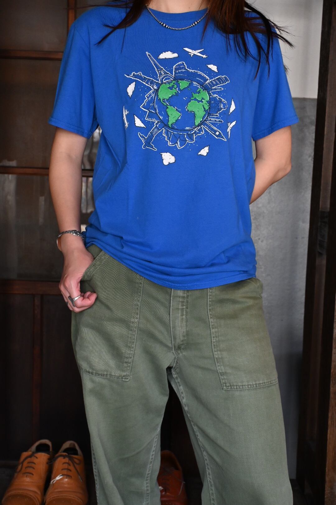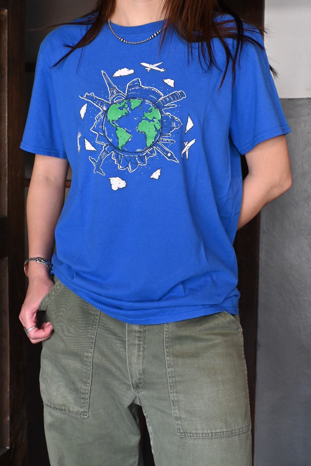 地球を囲む飛行機・建造物・雲が描かれた、トラベルテーマのグラフィックTシャツ。ビビッドなブルー地に、手書き風のデザインがポップでおしゃれ。1枚で着てもインナーとしても存在感のあるアイテムです。