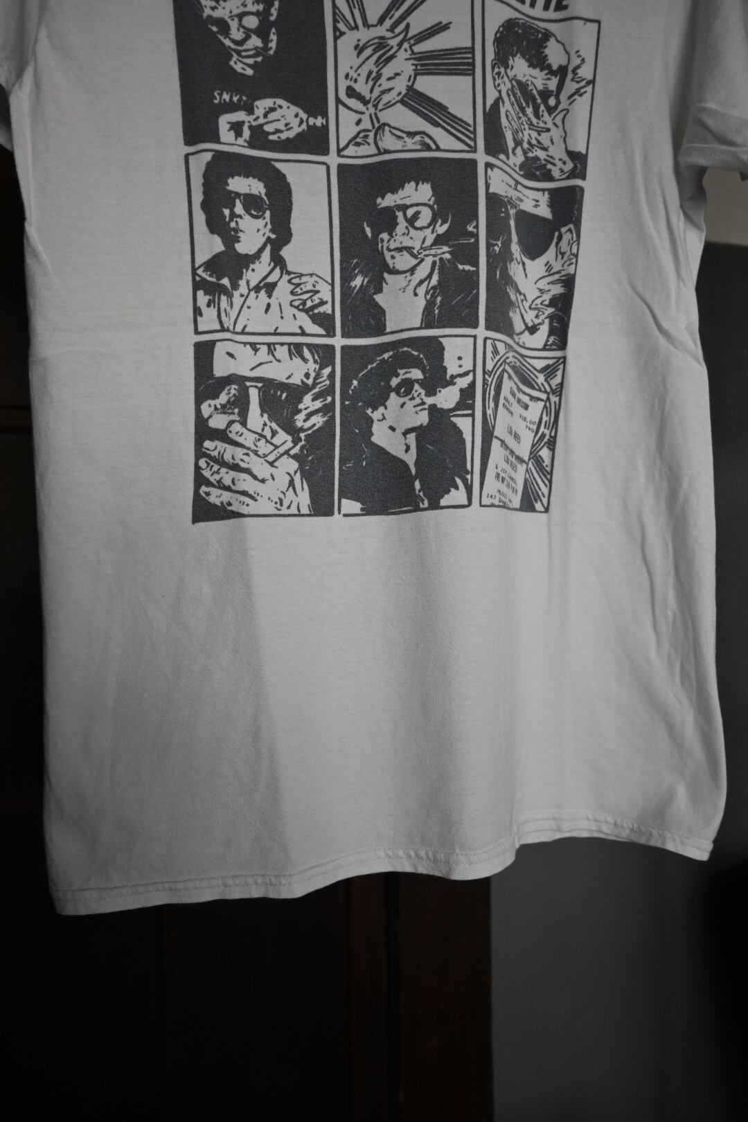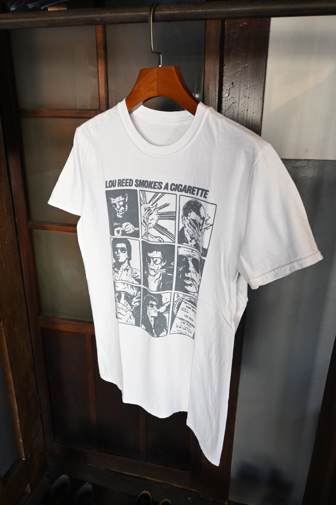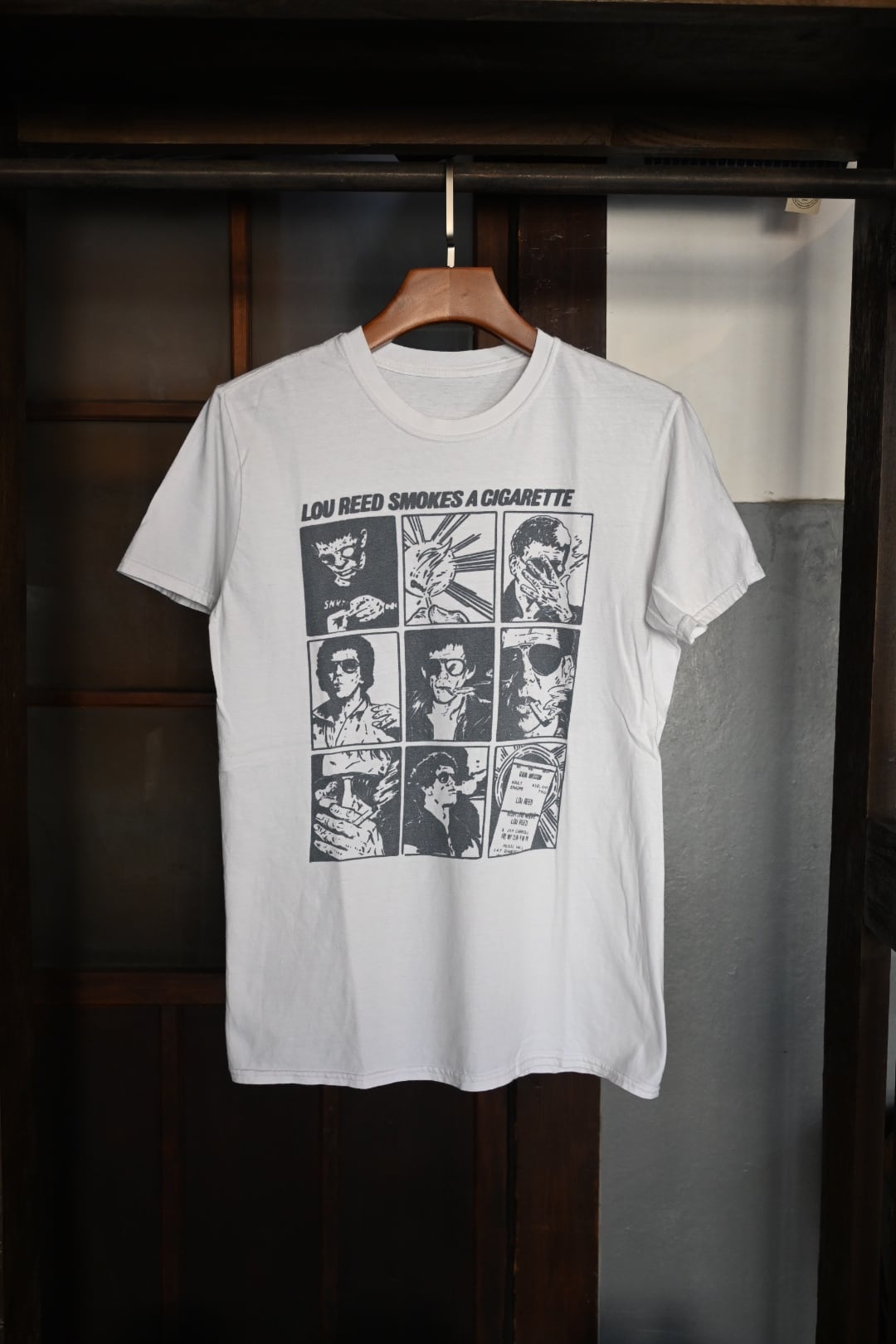 伝説的ミュージシャン Lou Reed(ルー・リード) を題材にした、アート性の高いプリントTシャツ。フロントには「LOU REED SMOKES A CIGARETTE」の文字とともに、漫画調のコマ割りでタバコを吸う彼の様子が描かれた、インパクト抜群のデザイン。