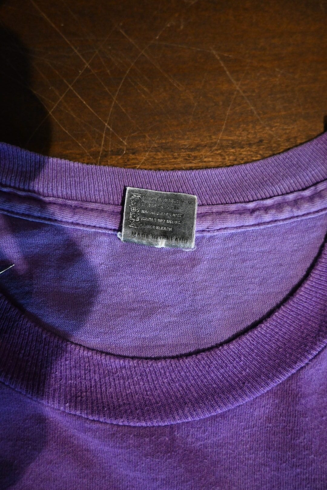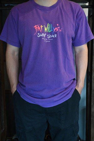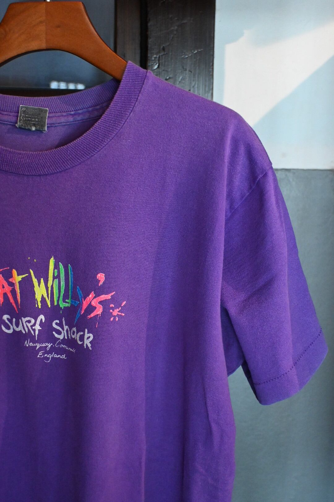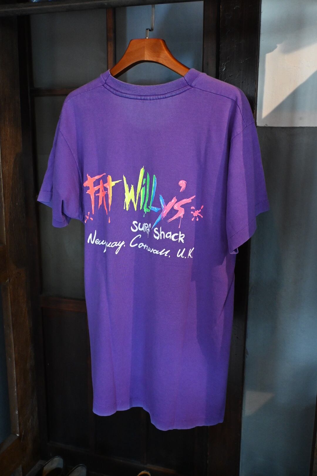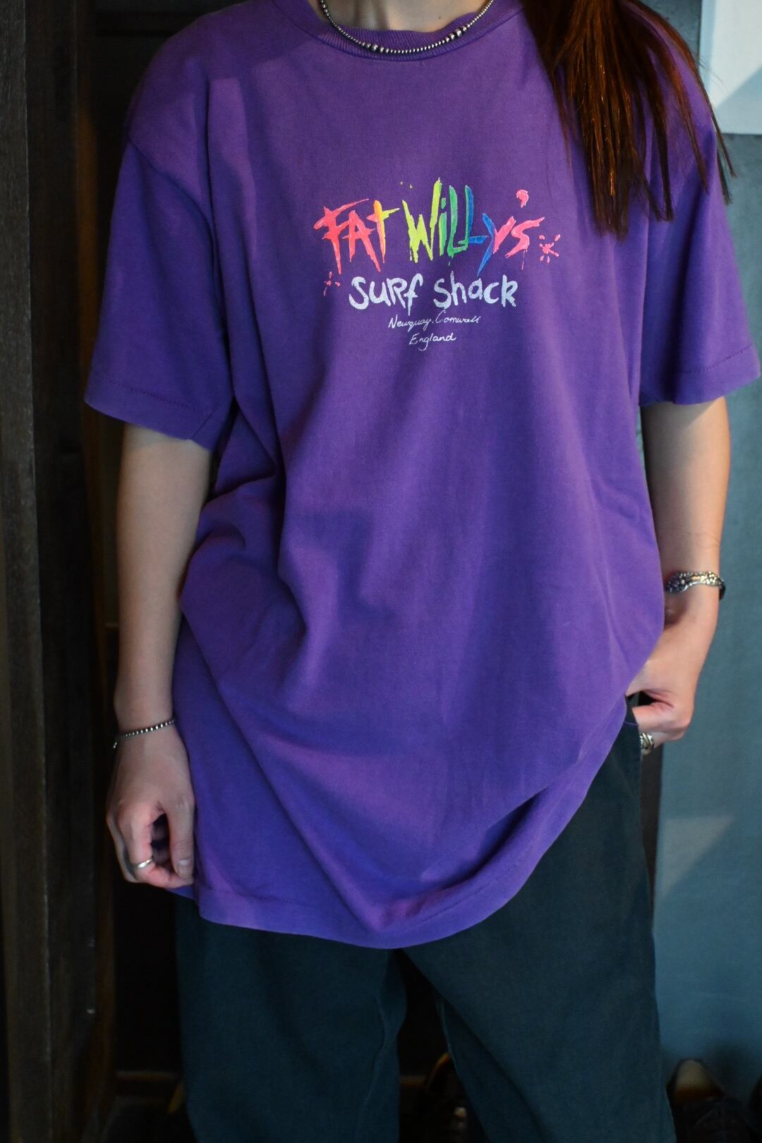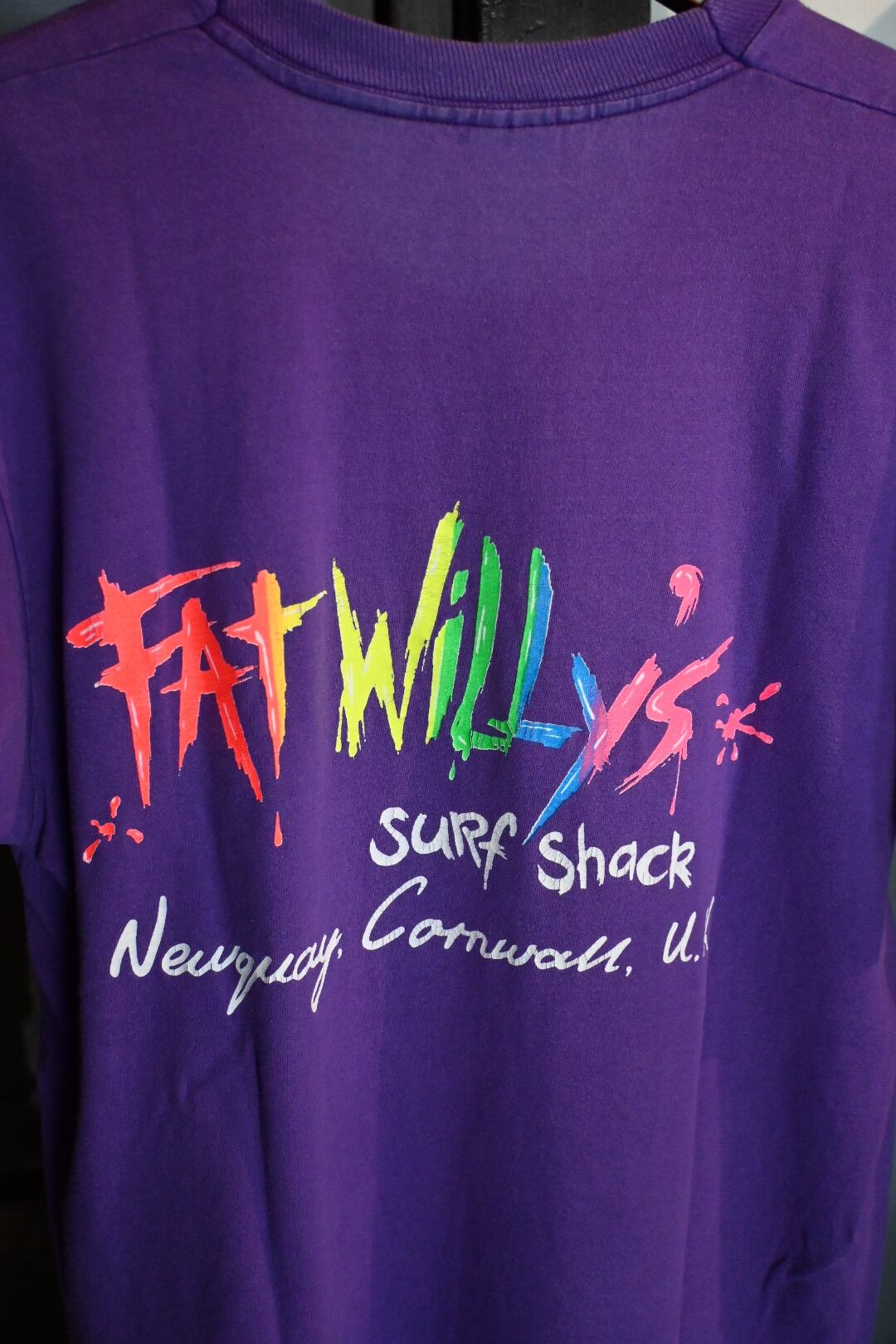イギリス・コーンウォール州ニューキーにある有名サーフショップ「Fat Willy’s Surf Shack」のオリジナルTシャツです。パープルのボディに、レインボーカラーのポップな筆記体ロゴが背面に大きくプリントされており、サーフカルチャーと90sレトロ感を演出するデザインとなっています。