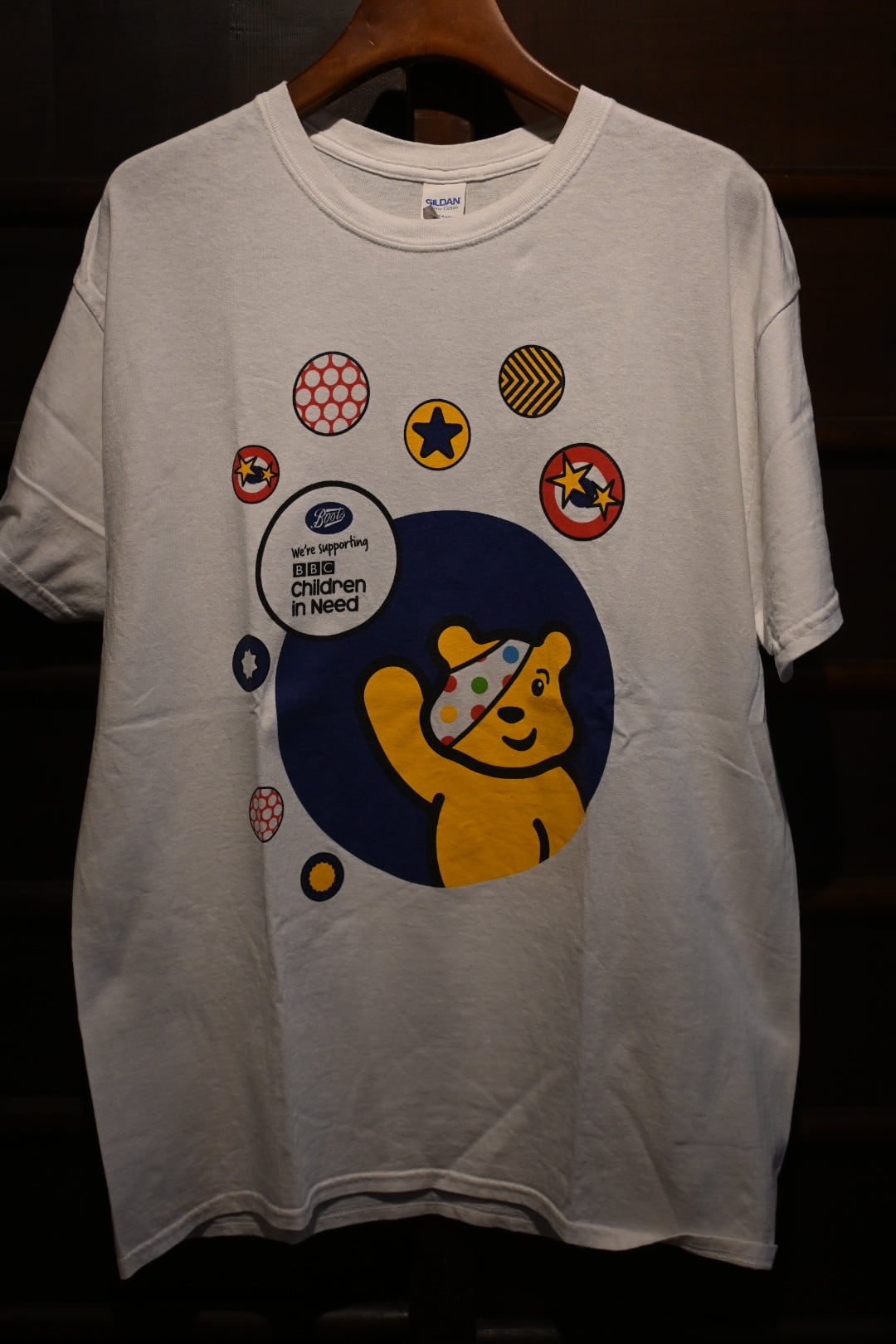 イギリスのチャリティー団体「BBC Children in Need(チルドレン・イン・ニード)」を支援するために作られた公式Tシャツです。キャラクターのPudsey(パドジー)ベアが大きくプリントされた可愛らしいデザインで、カラフルなドットや星のモチーフが目を引きます。