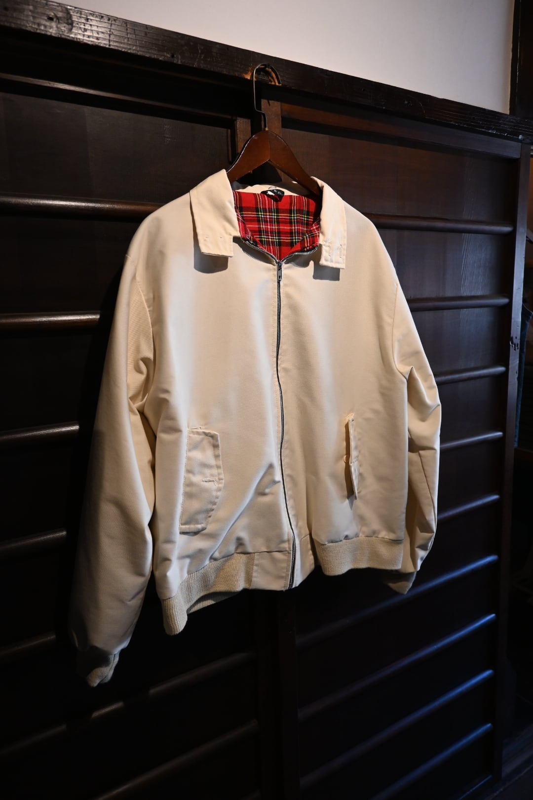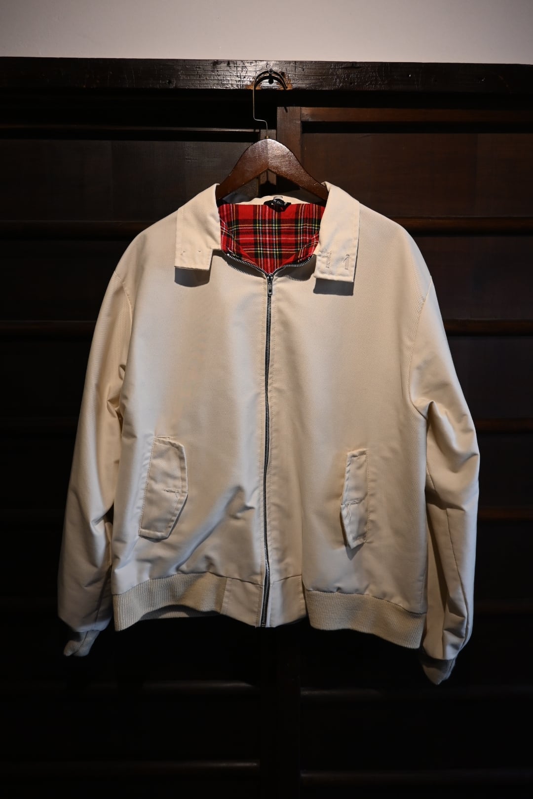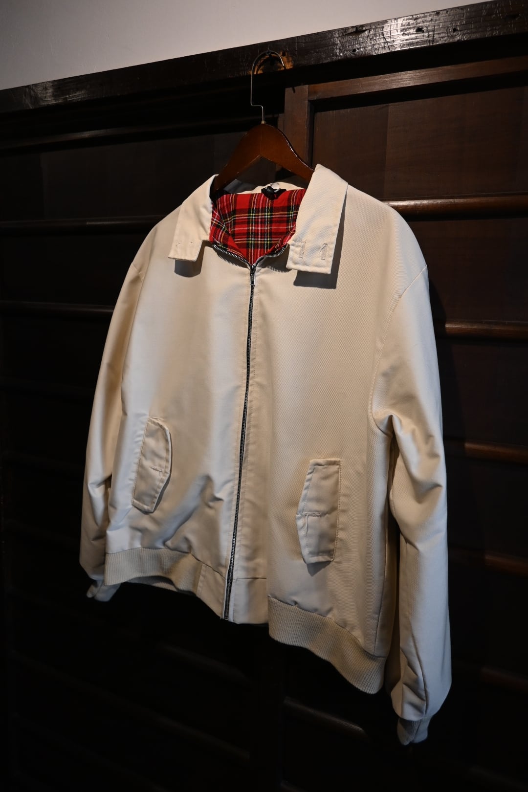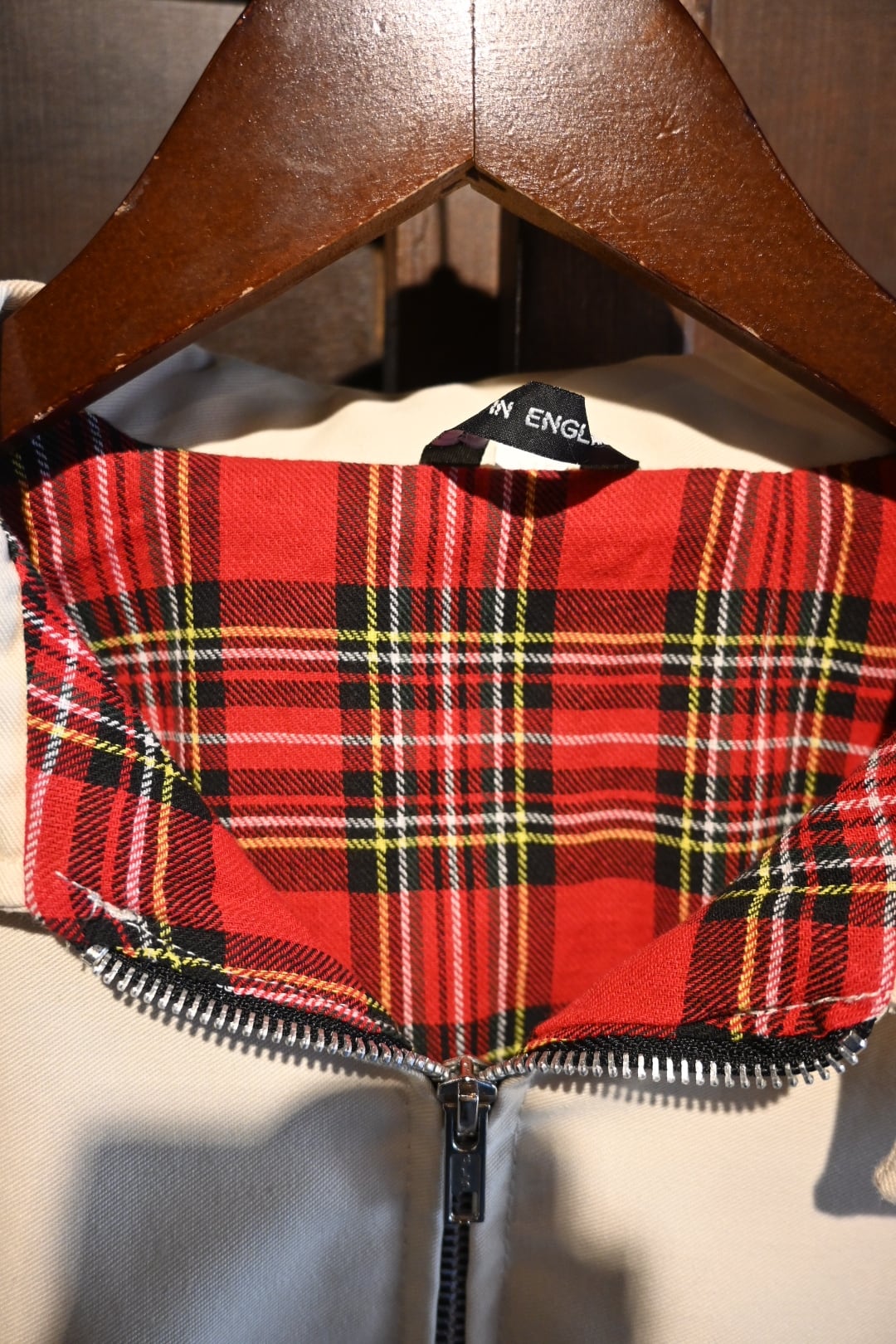 英国製のクラシックなハリントンスタイルジャケット。表地は光沢感のあるベージュカラー、裏地には伝統的なレッド系タータンチェックを採用し、トラッドで品のある仕上がりになっています。