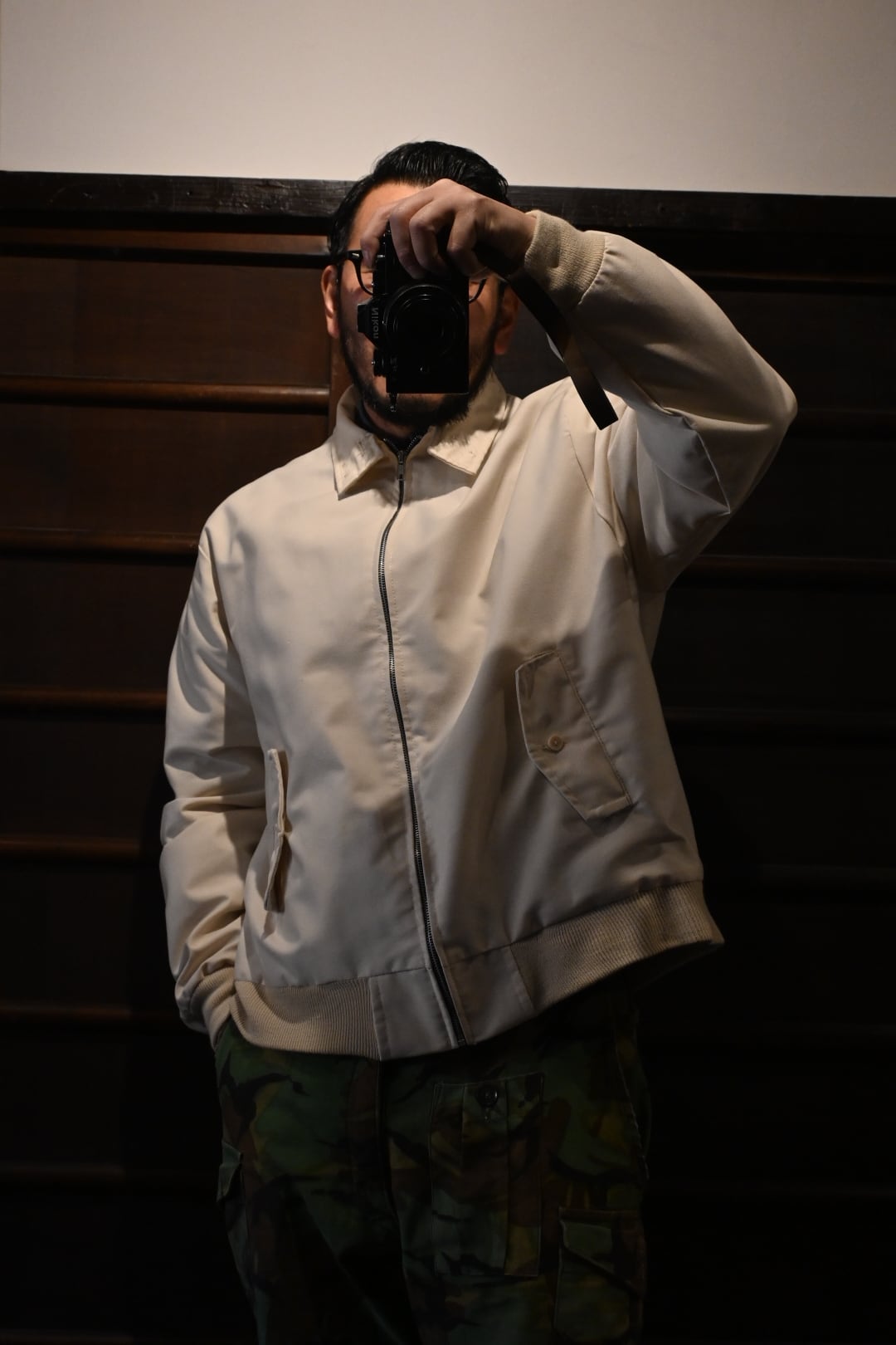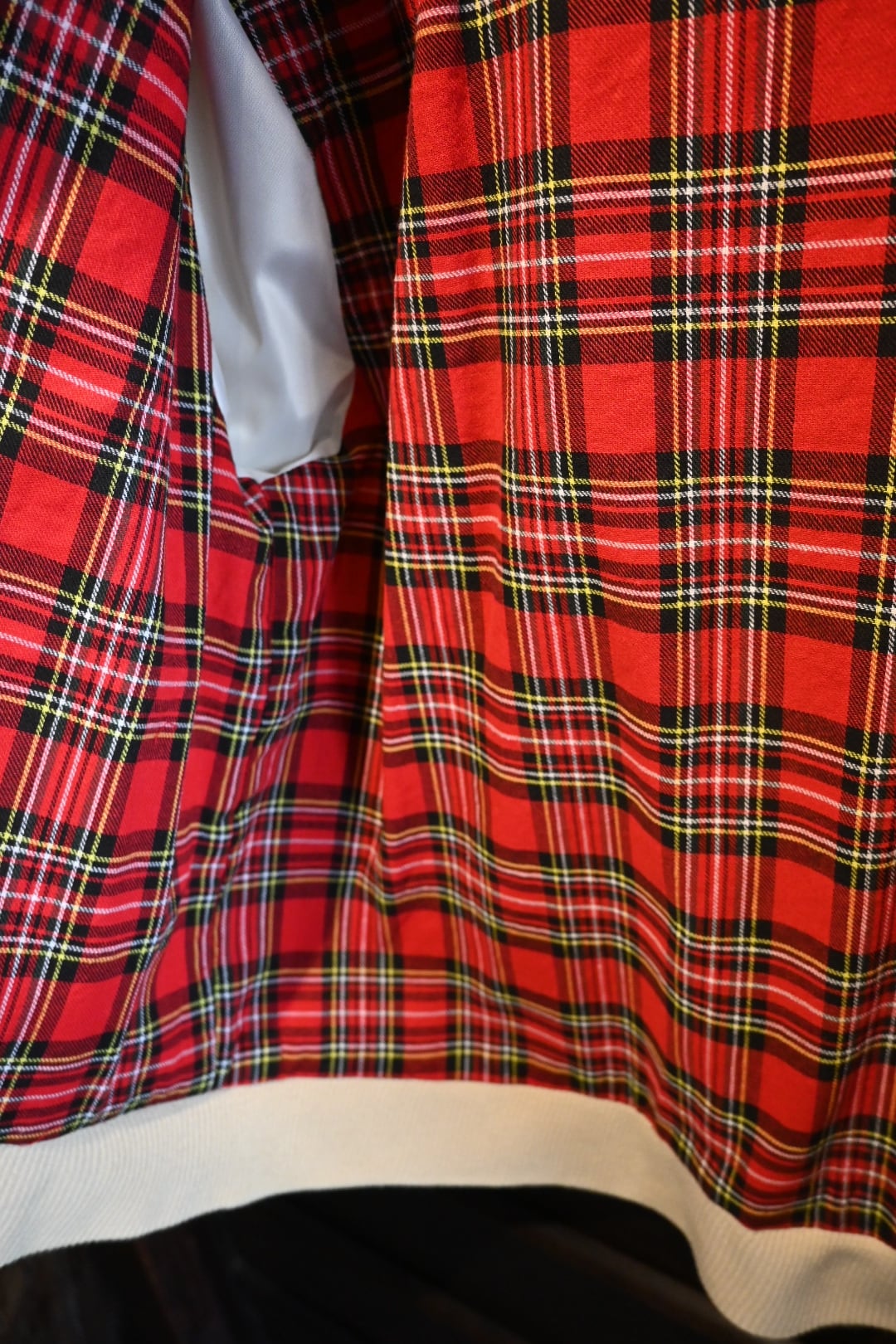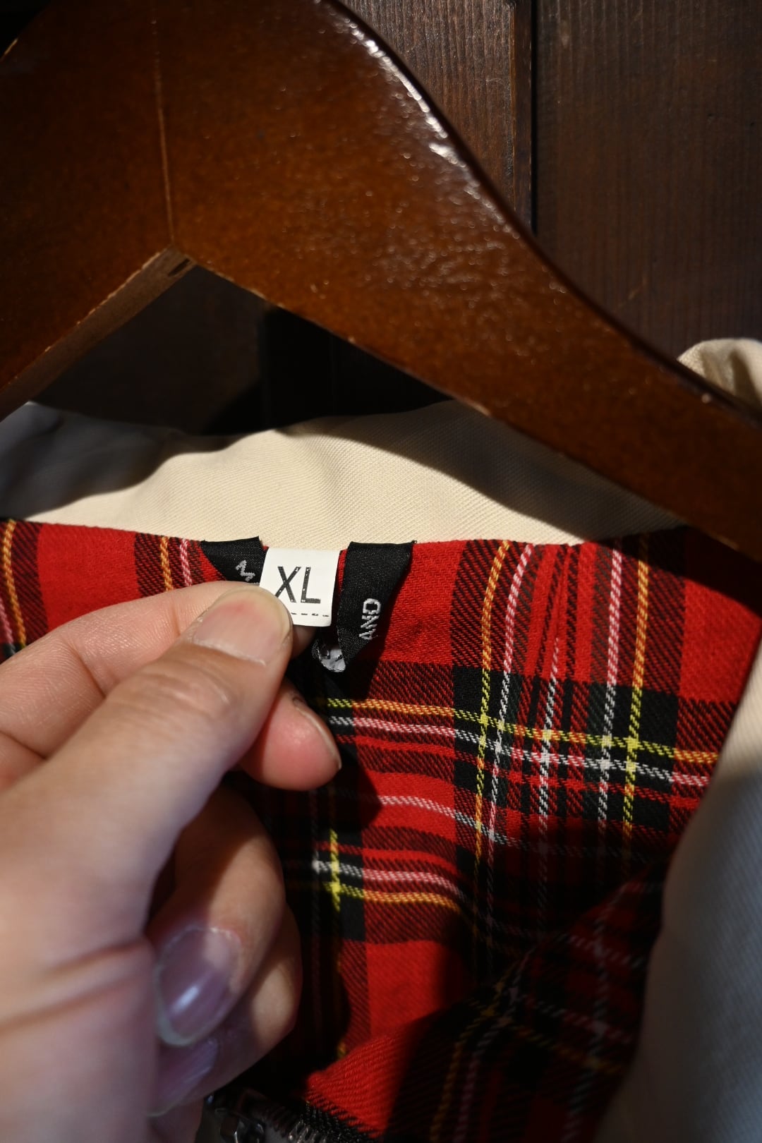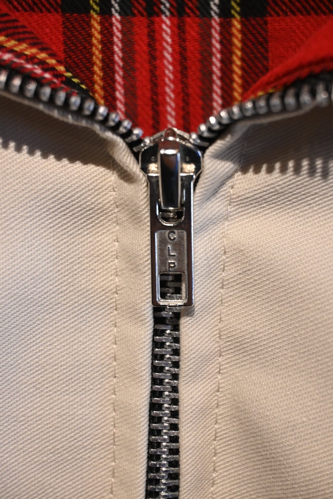英国製のクラシックなハリントンスタイルジャケット。表地は光沢感のあるベージュカラー、裏地には伝統的なレッド系タータンチェックを採用し、トラッドで品のある仕上がりになっています。
