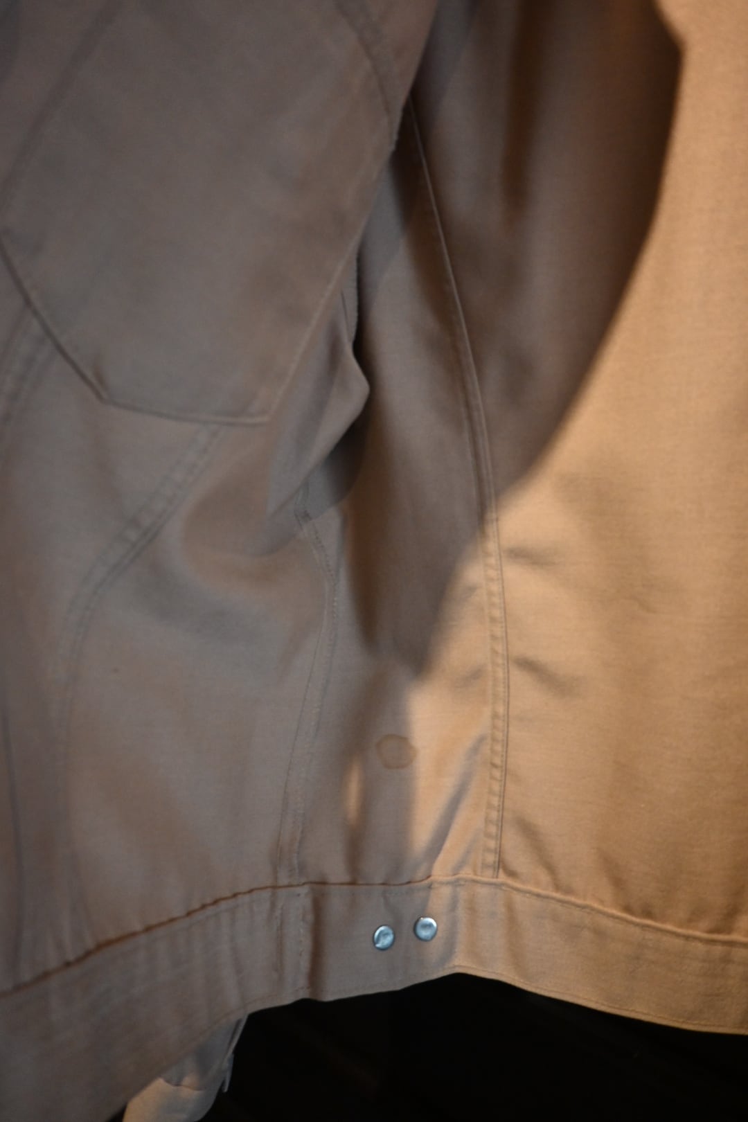 サンドベージュの落ち着いたカラーに、胸元のフラップポケットやボタンフロントなど、定番のデザインが魅力の一着です。