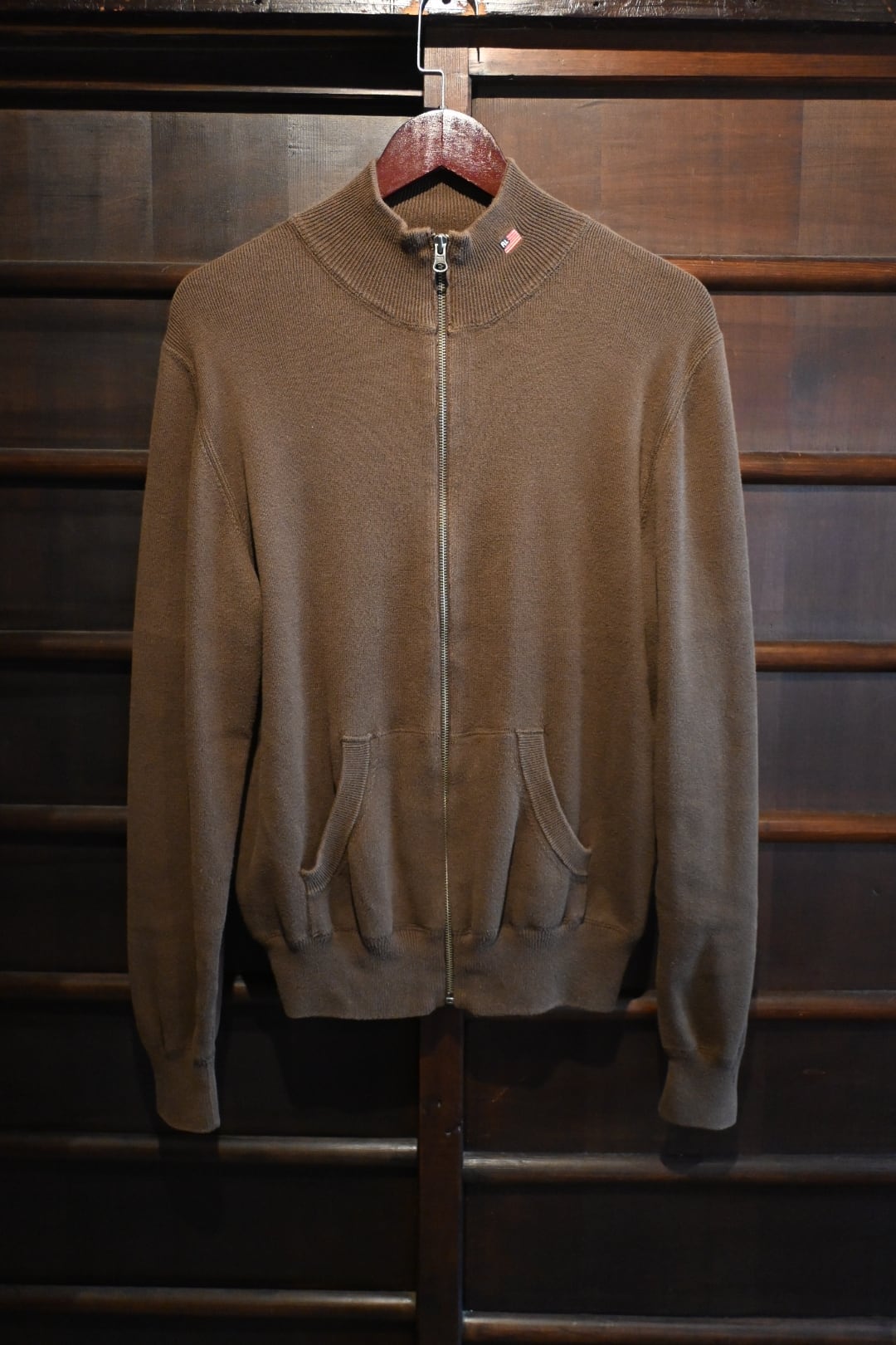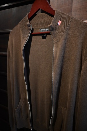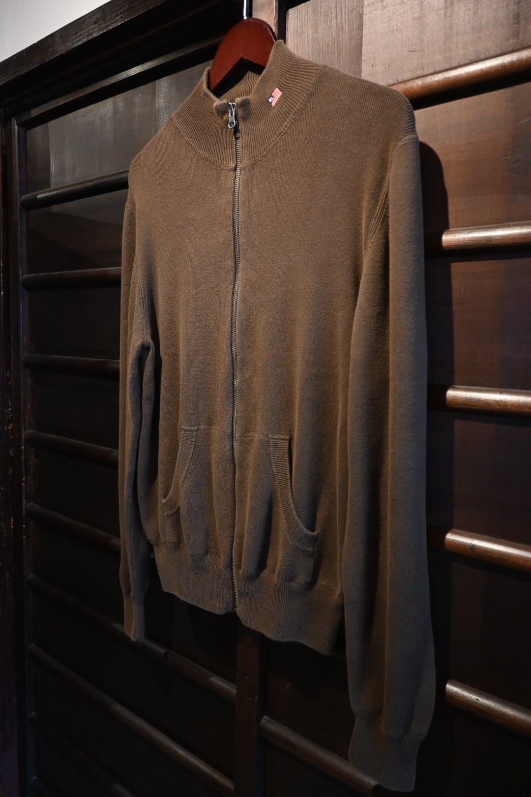 フルジップ・モックネックニット。シンプルなデザインながら、首元のアメリカ国旗モチーフのワンポイント刺繍がアクセントになった一着です。