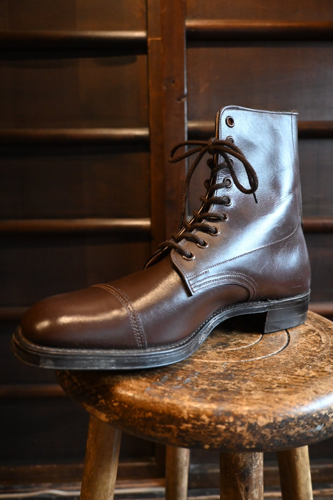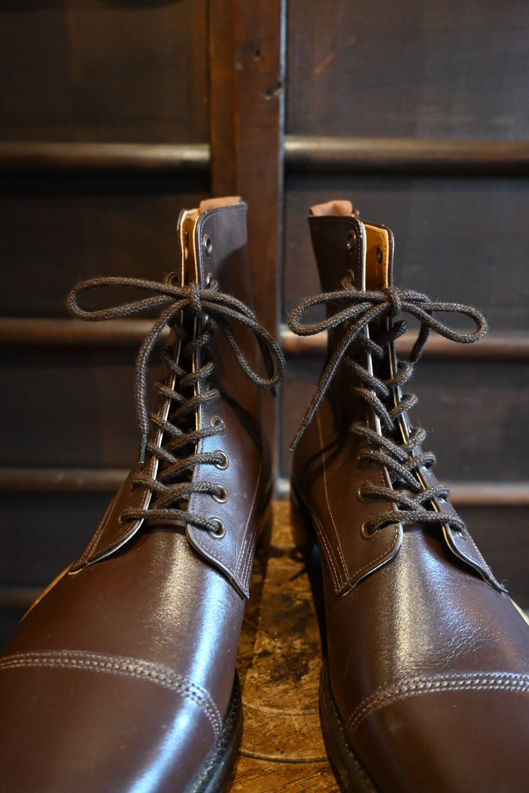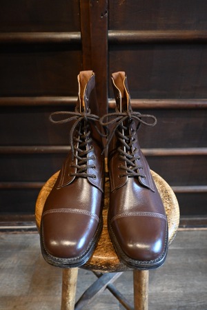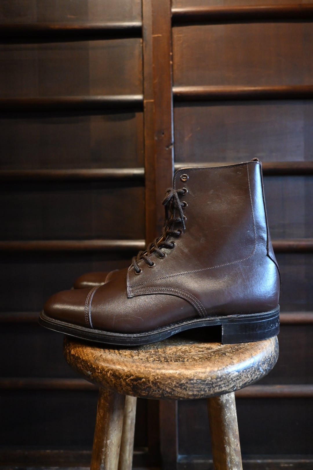 英国ロンドンの靴ブランド MAC FINN のクラシックなキャップトゥ・レザードレスブーツ。艶やかなダークブラウンのカーフレザーを使用し、ドレッシーで上品な雰囲気を漂わせる一足です。