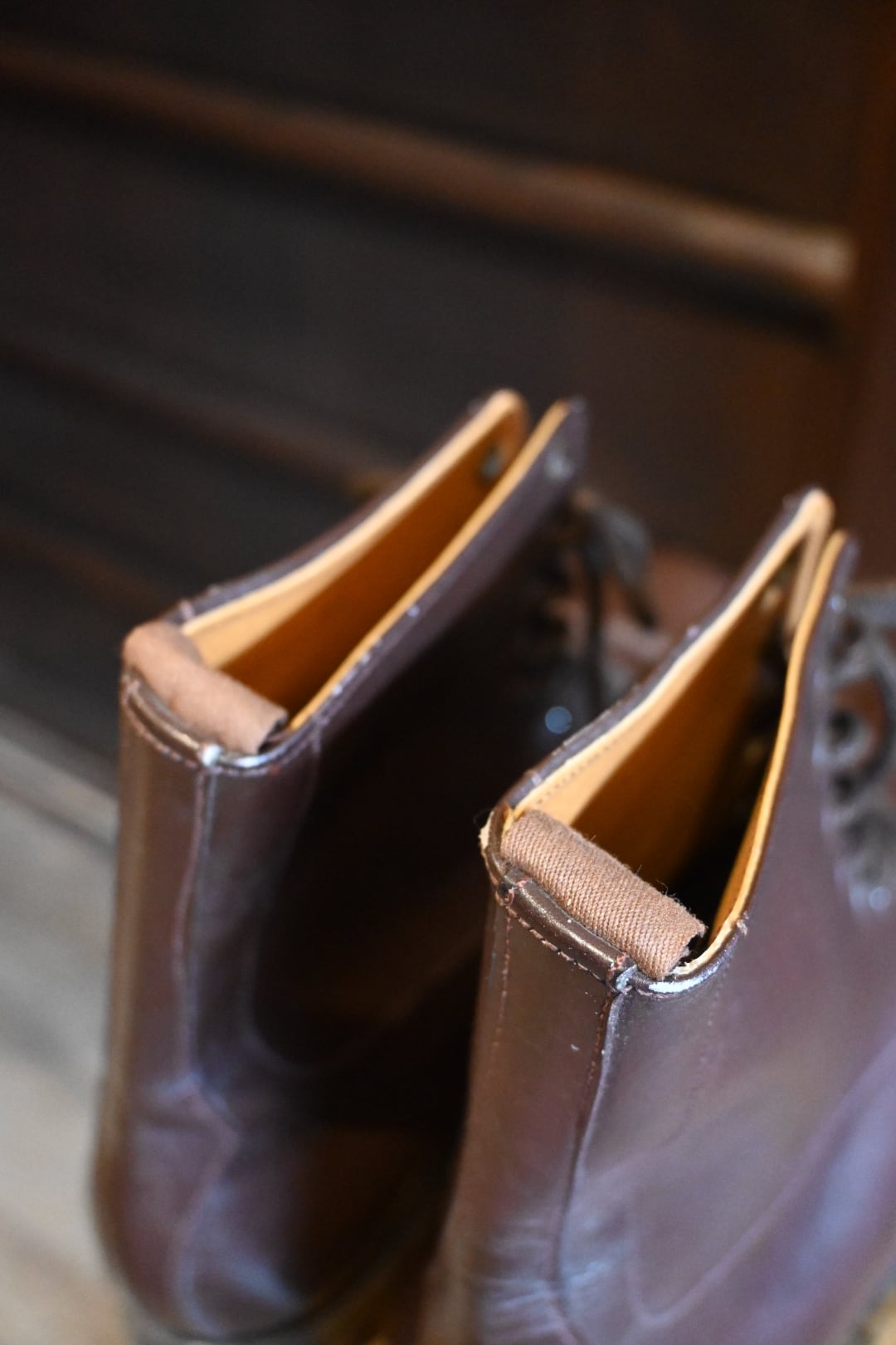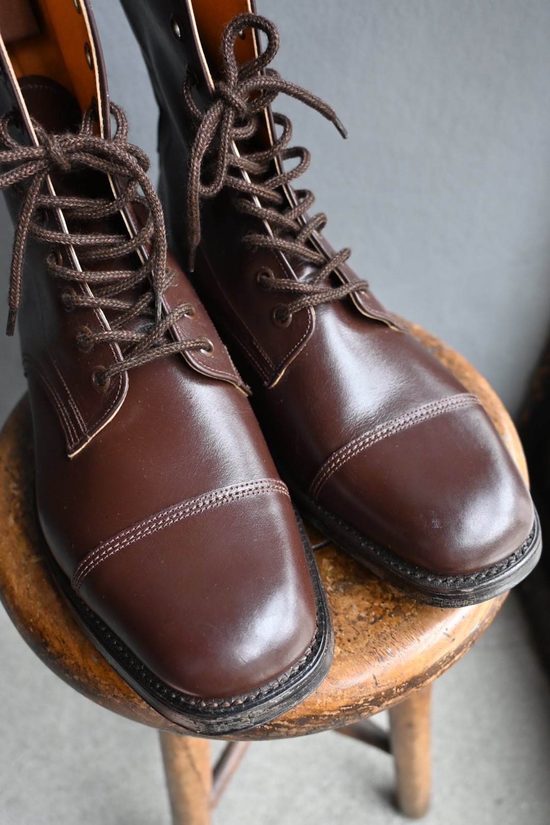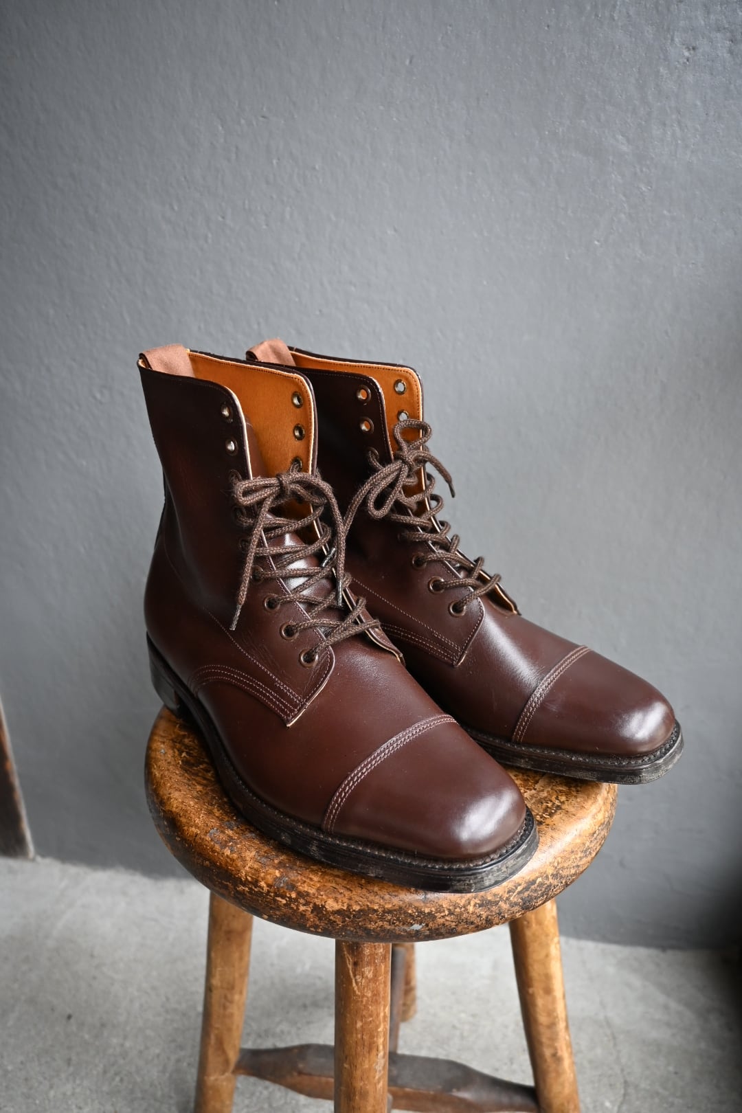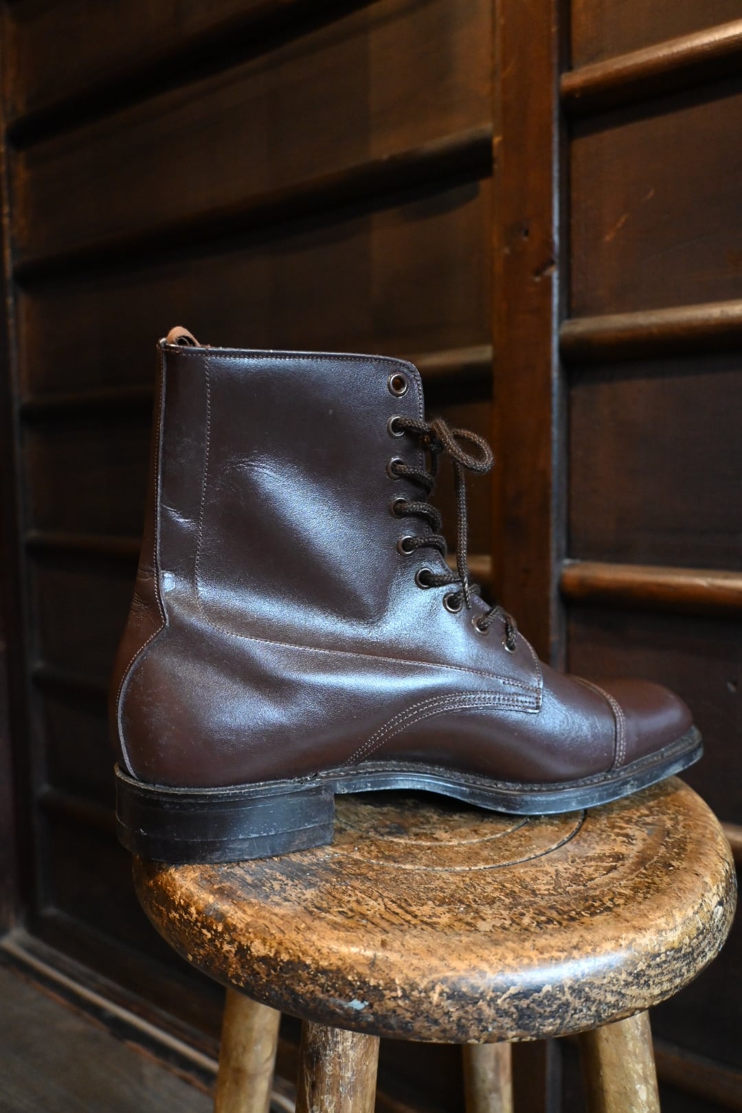 英国ロンドンの靴ブランド MAC FINN のクラシックなキャップトゥ・レザードレスブーツ。艶やかなダークブラウンのカーフレザーを使用し、ドレッシーで上品な雰囲気を漂わせる一足です。