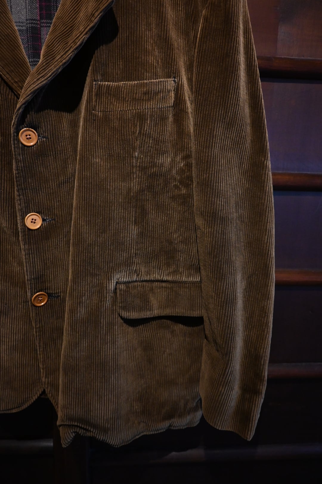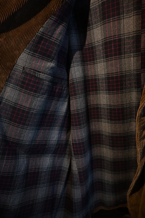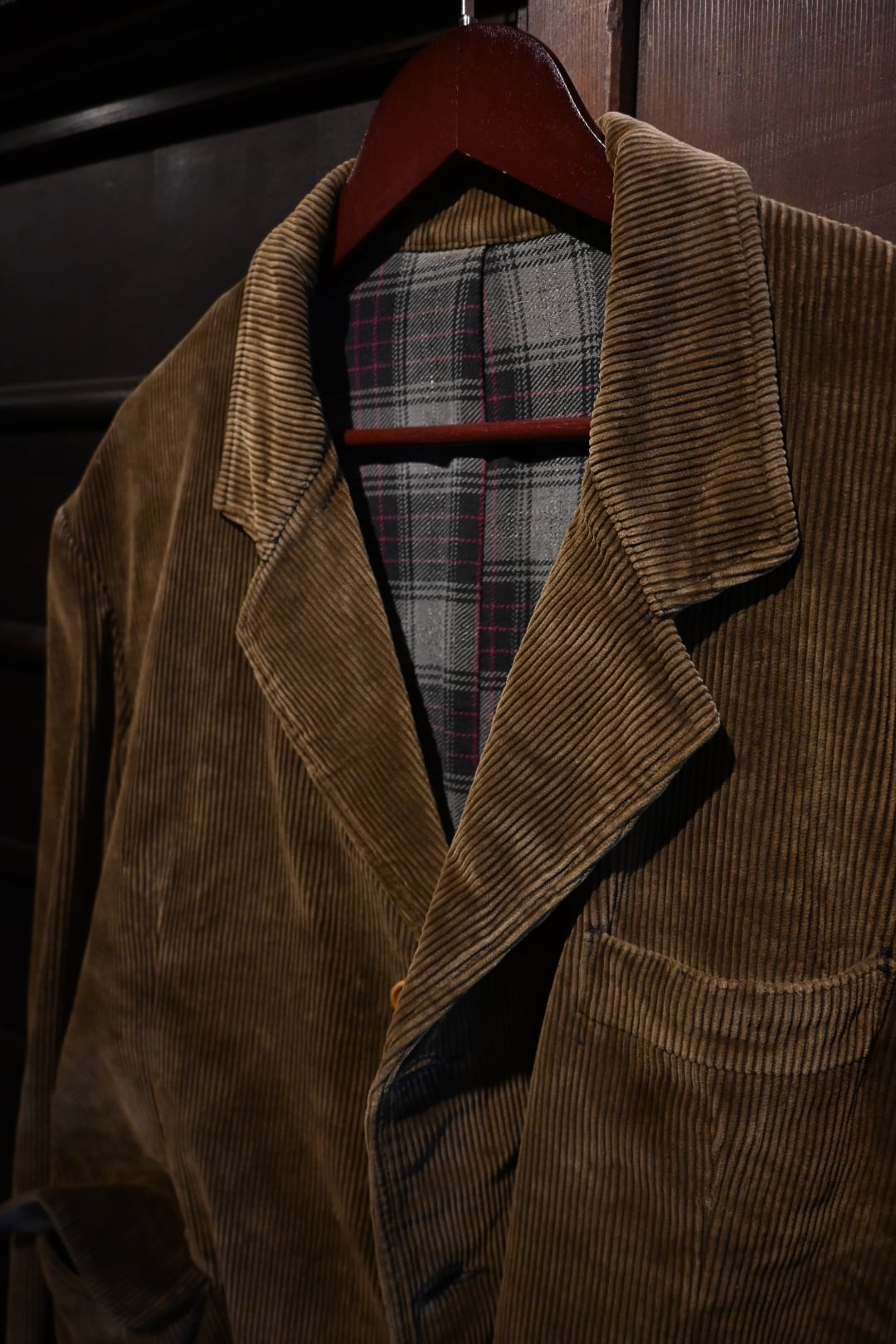 当時のフレンチワークらしい太畝コーデュロイ生地を使用し、重厚感と温かみのある仕立てが特徴的。落ち着いたブラウンカラーに、内側はグレー×ブラックベースに赤のラインが入ったチェック柄裏地で、クラシックな雰囲気を漂わせます。