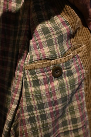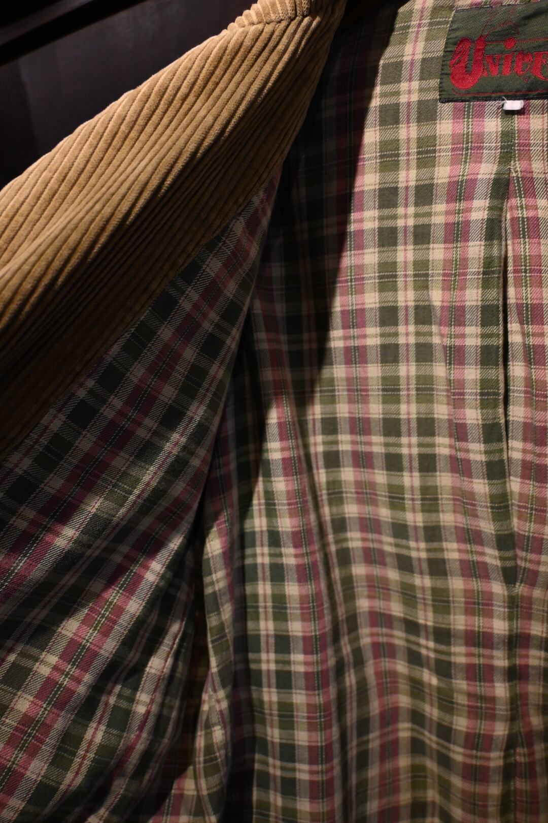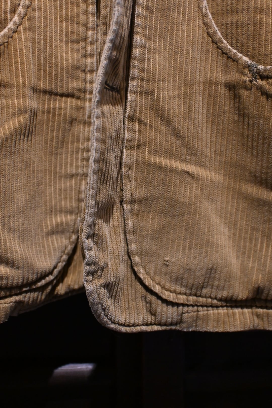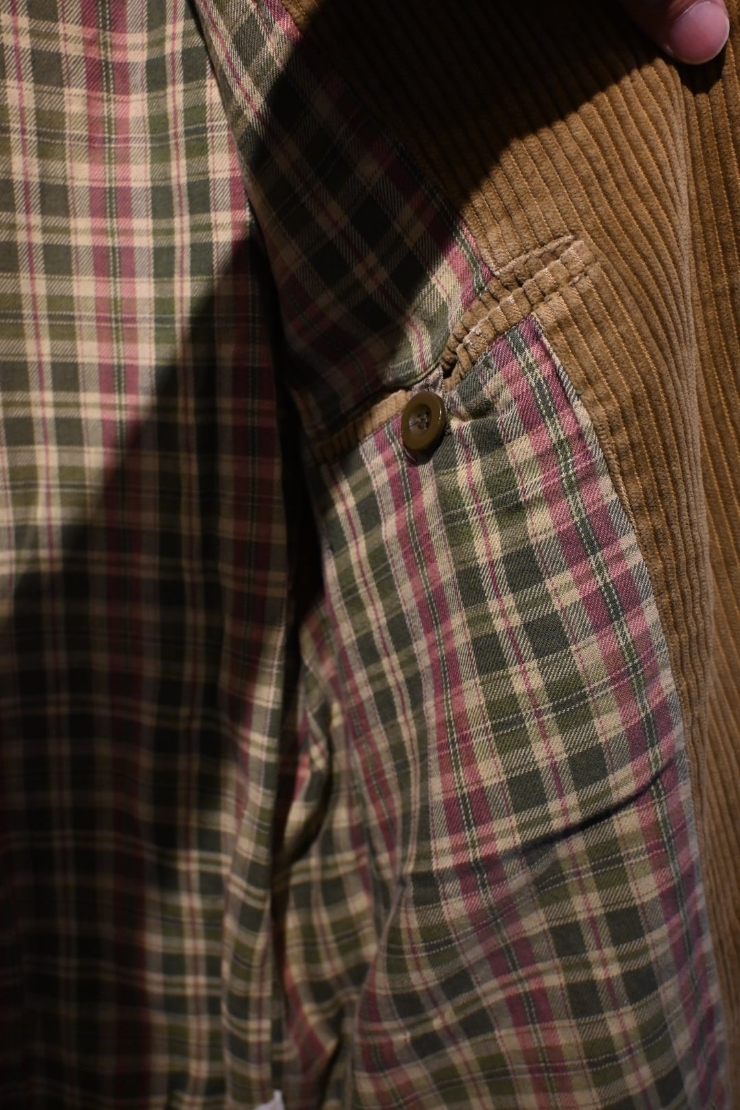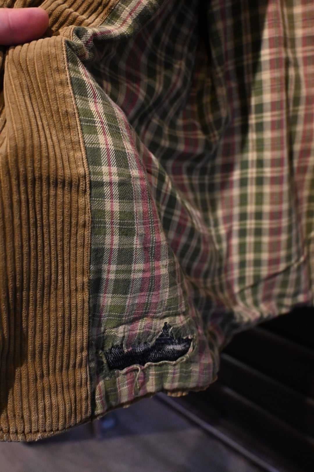 肉厚な太畝コーデュロイ生地を使用し、内側にはチェック柄のライナーを備えたクラシックな一着。フレンチワーク特有のデザインで、大きめのパッチポケットや胸ポケットなど、実用性のあるディテールが魅力。テーラード型の襟によりカジュアルながらも上品な印象を演出します。経年によるアタリや擦れ、ライナーのダメージ(裾部分に破れあり)など襟などにございますが、それもまたヴィンテージならではの雰囲気を高めています。
