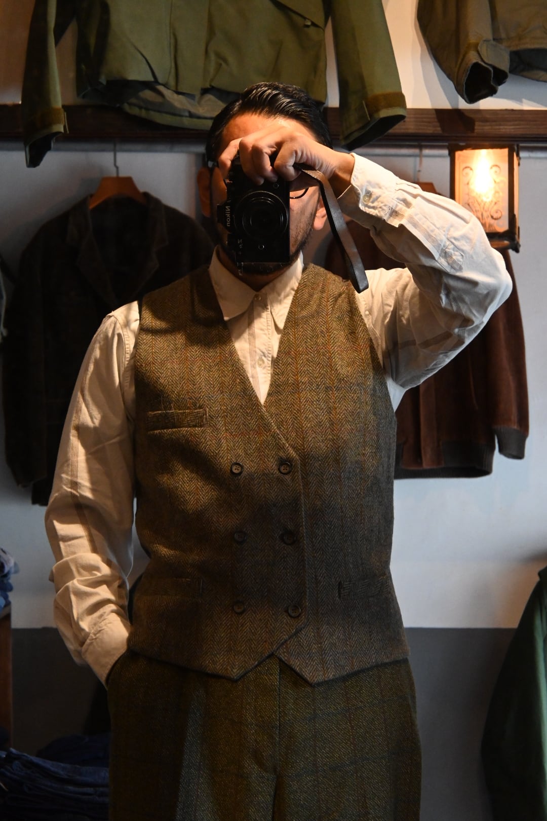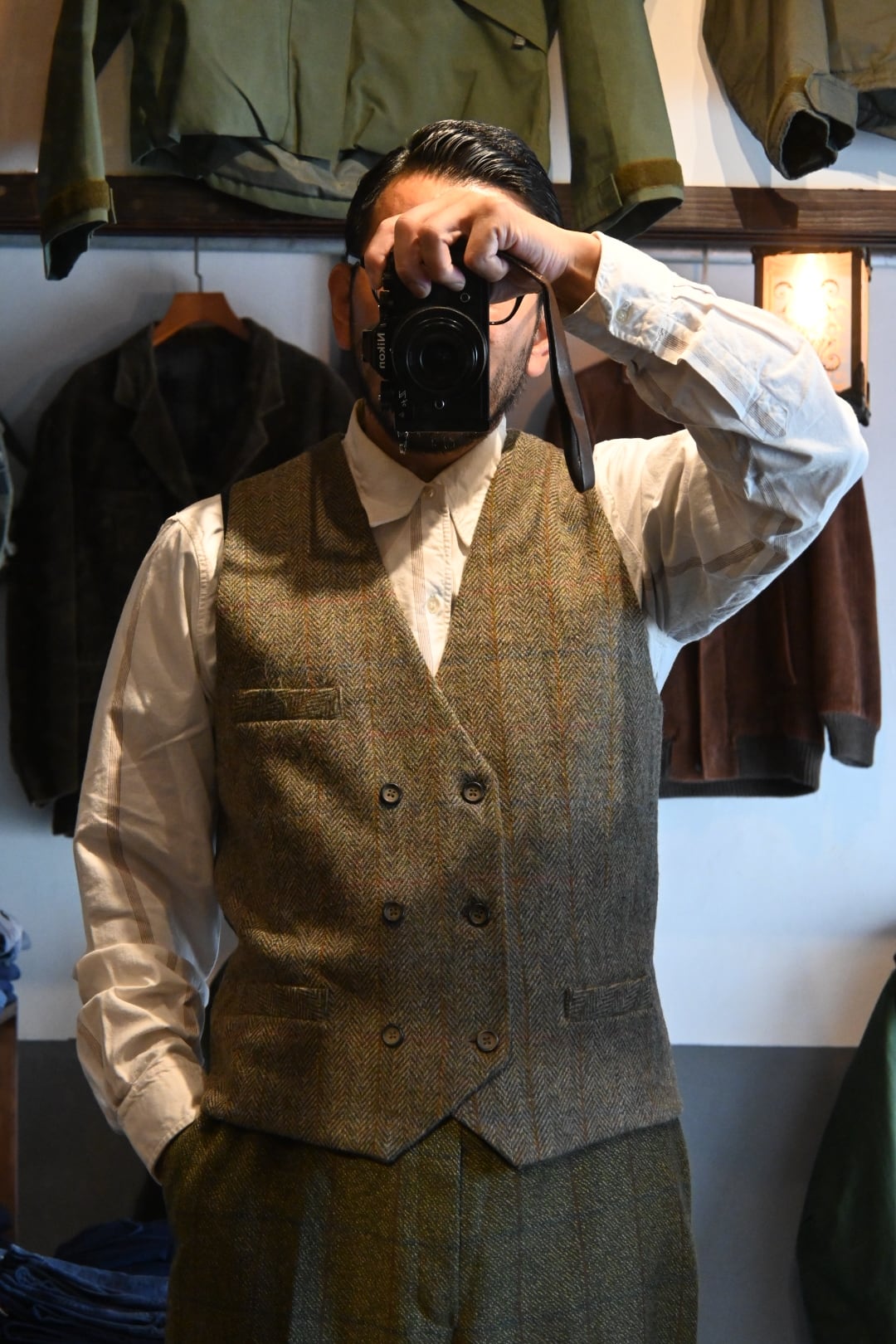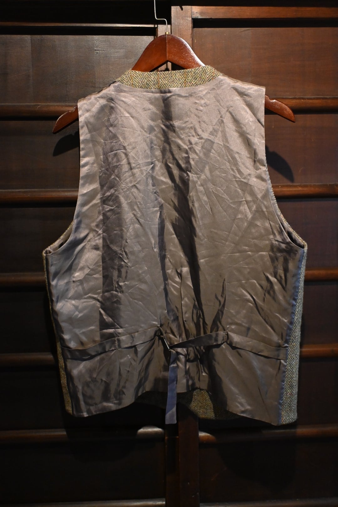 Harris Tweedウールベスト です。英国伝統のクラシックな雰囲気を持ち、フォーマルにもカジュアルにも幅広く合わせられる一着です。