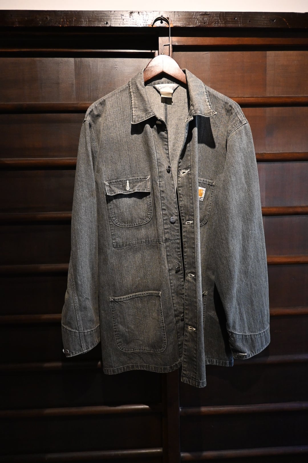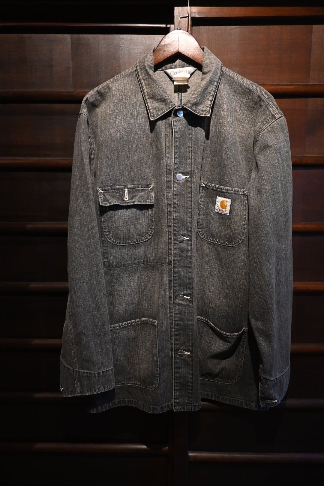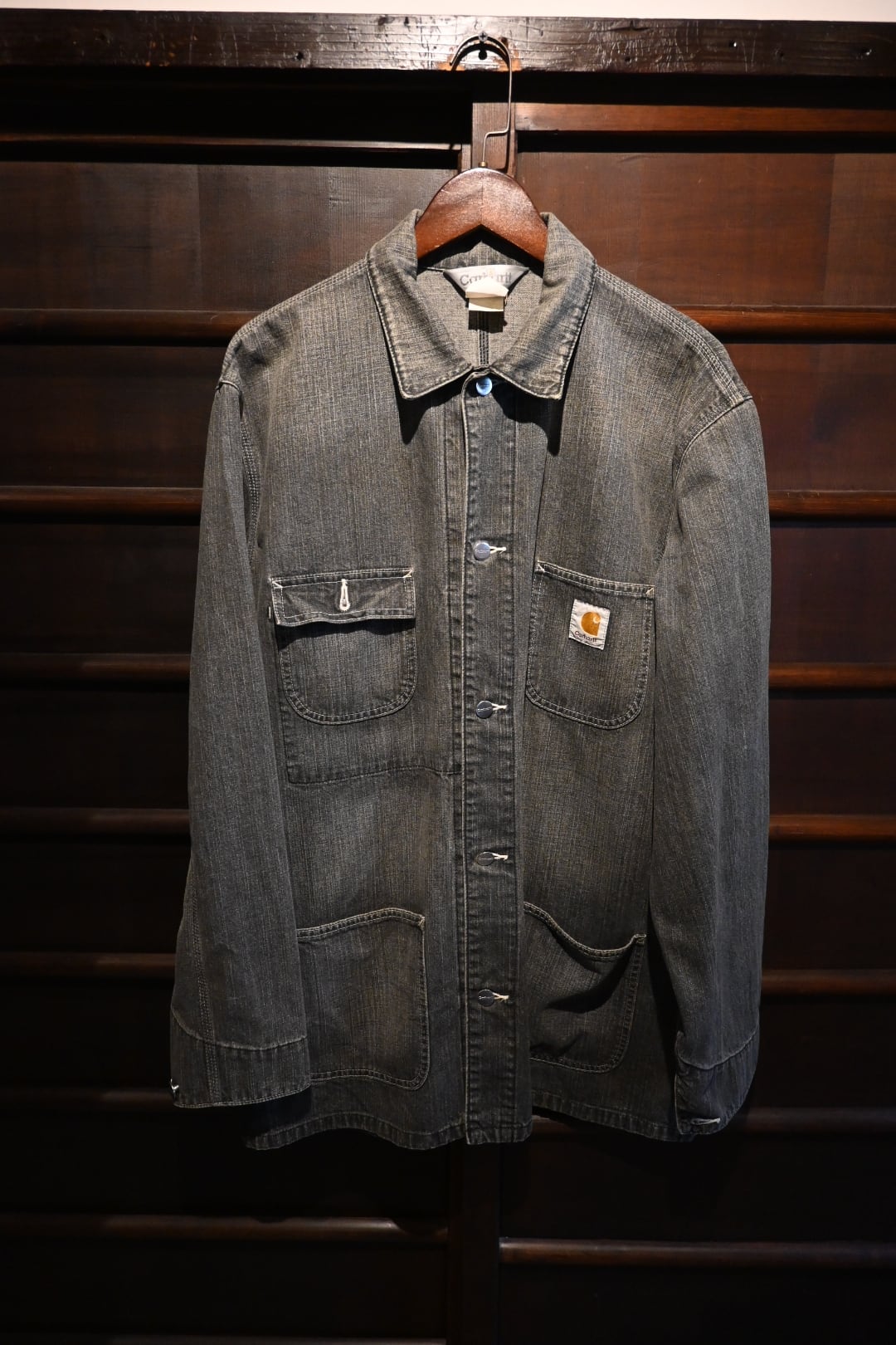 Carharttのデニムチョアジャケットです。丈夫なデニム生地を使用したクラシックなワークジャケットで、実用性とスタイルを兼ね備えています。胸ポケットのブランドロゴやメタルボタンなど、ワークウェアらしいディテールが魅力です。