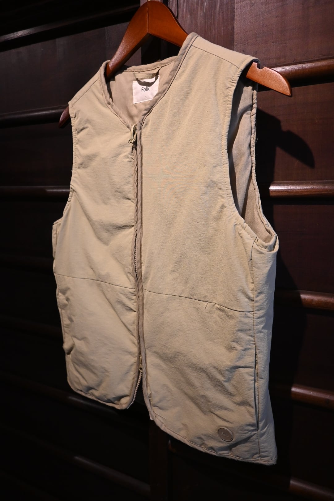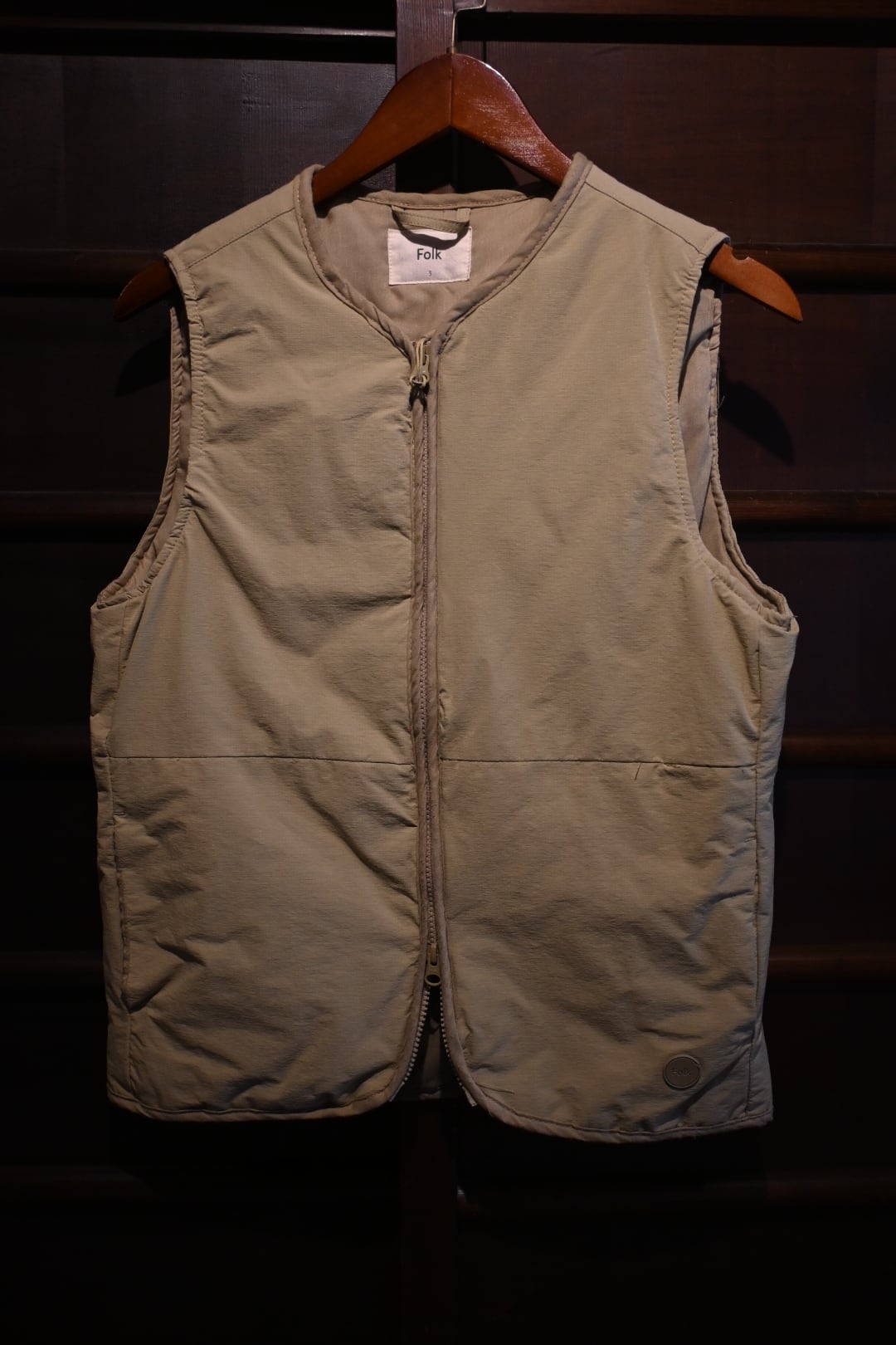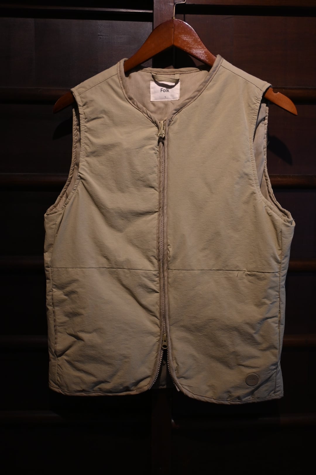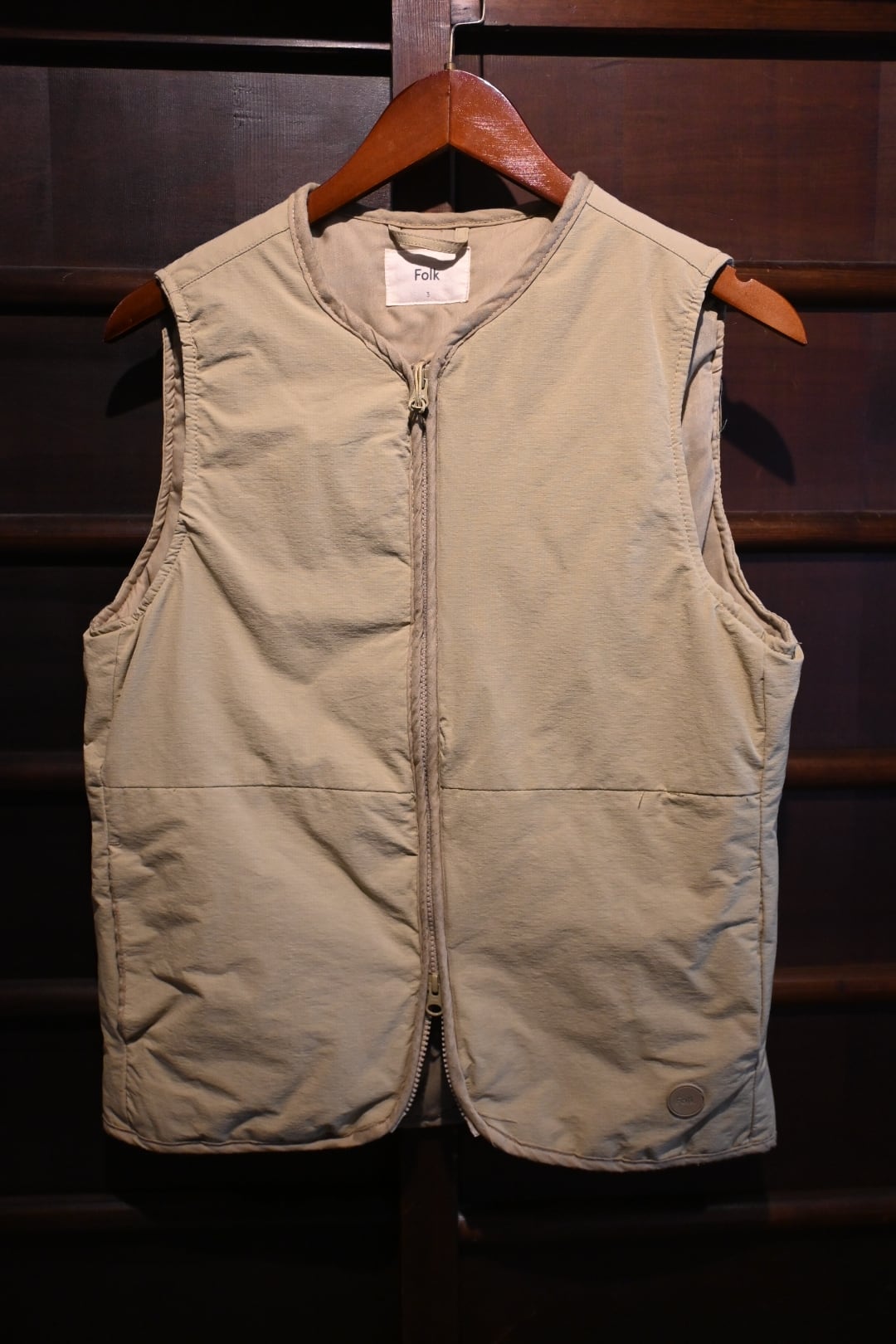イギリス発のブランド Folk による中綿入りベストです。カラーは落ち着いたカーキで、ミニマルなデザインが特徴的です。軽量で動きやすく、インナーにもアウターにも合わせやすいです。
