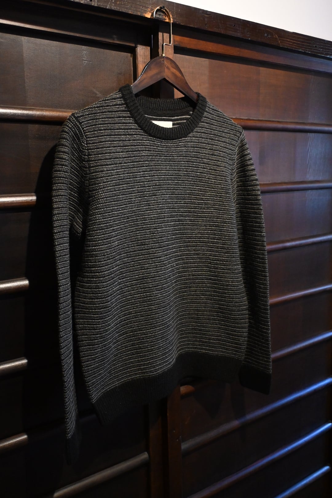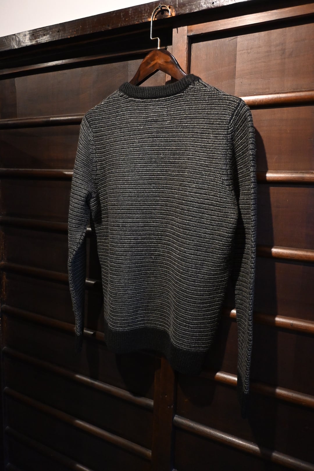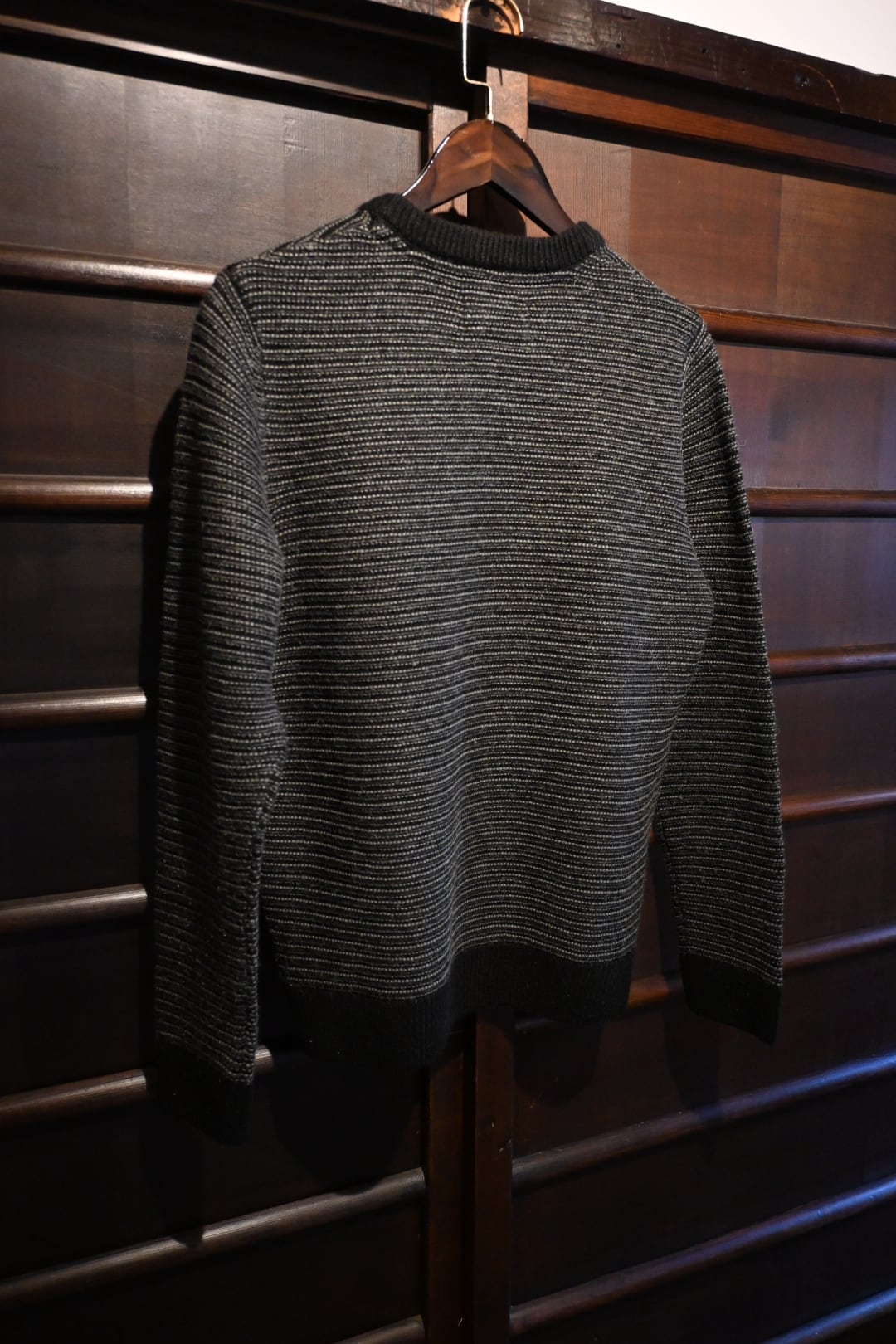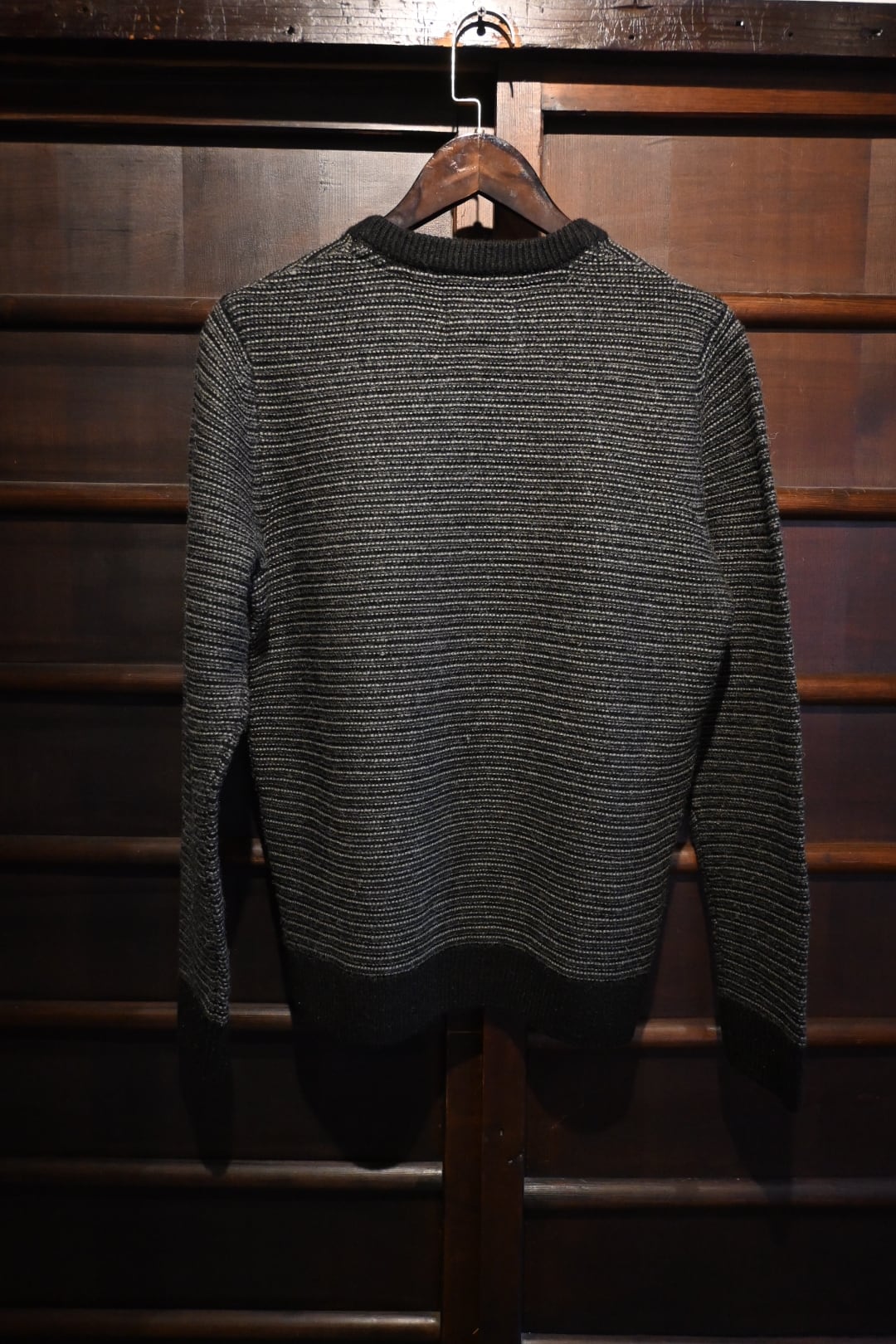 イギリス発のブランドFolkのシンプルかつ洗練されたニットセーターです。ブラックとグレーの細かなストライプ編みが特徴で、落ち着いた大人の雰囲気を演出します。