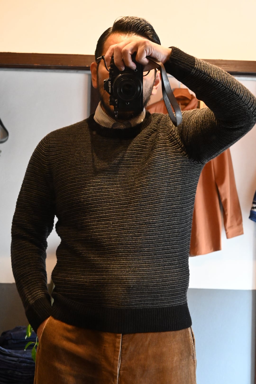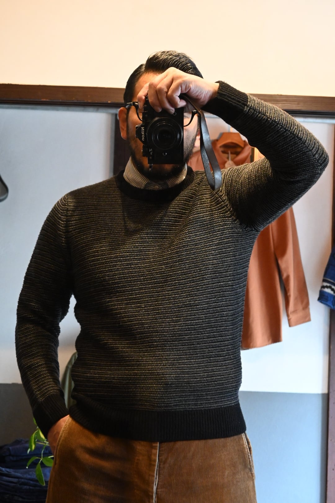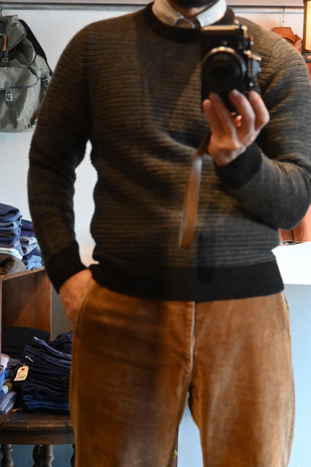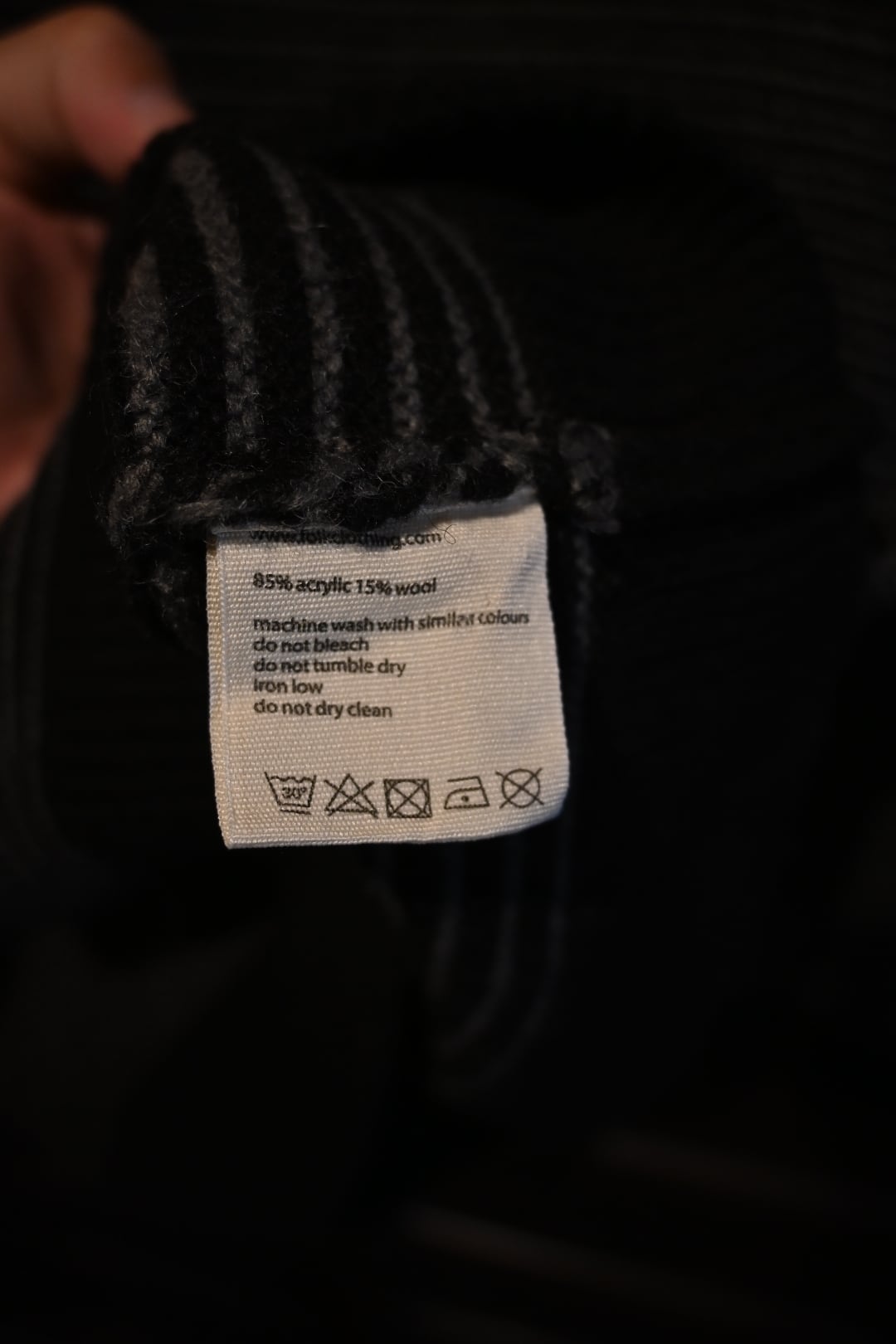 イギリス発のブランドFolkのシンプルかつ洗練されたニットセーターです。ブラックとグレーの細かなストライプ編みが特徴で、落ち着いた大人の雰囲気を演出します。