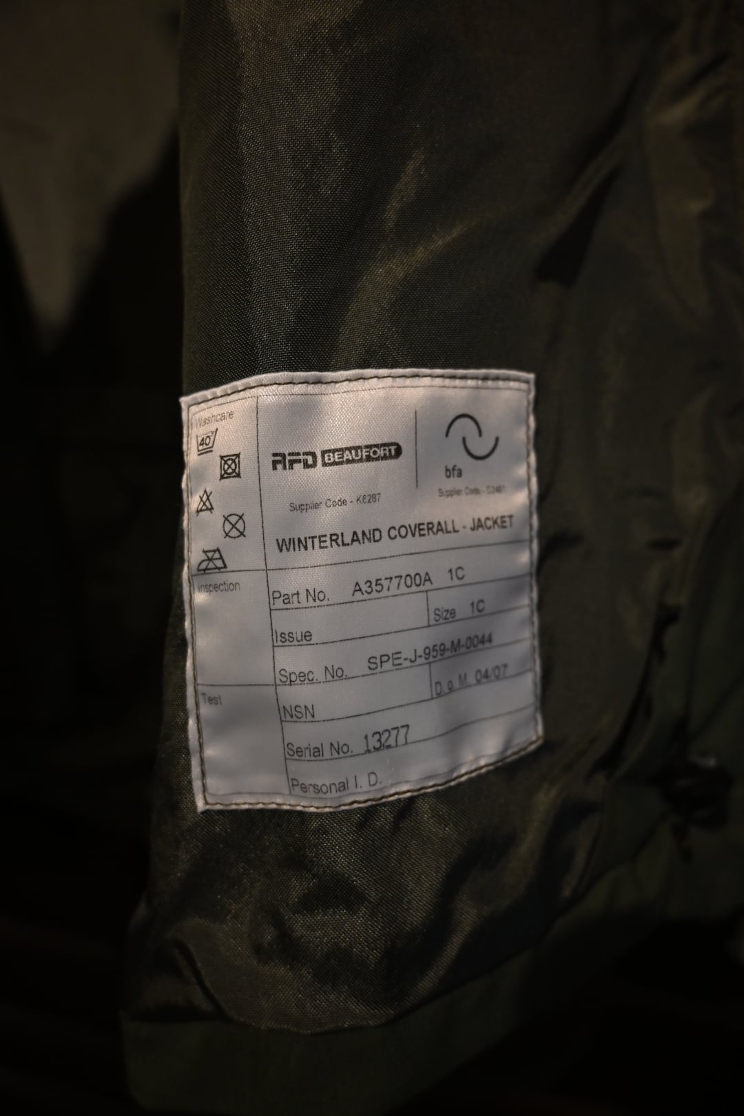 英国の防護服メーカーRFD BeaufortのWinterland Coverall Jacketです。軍用・官給品として製造されたモデルで、極寒環境下での使用を想定した高性能な防寒ジャケットになります。