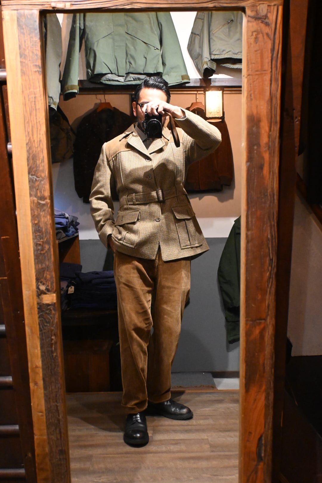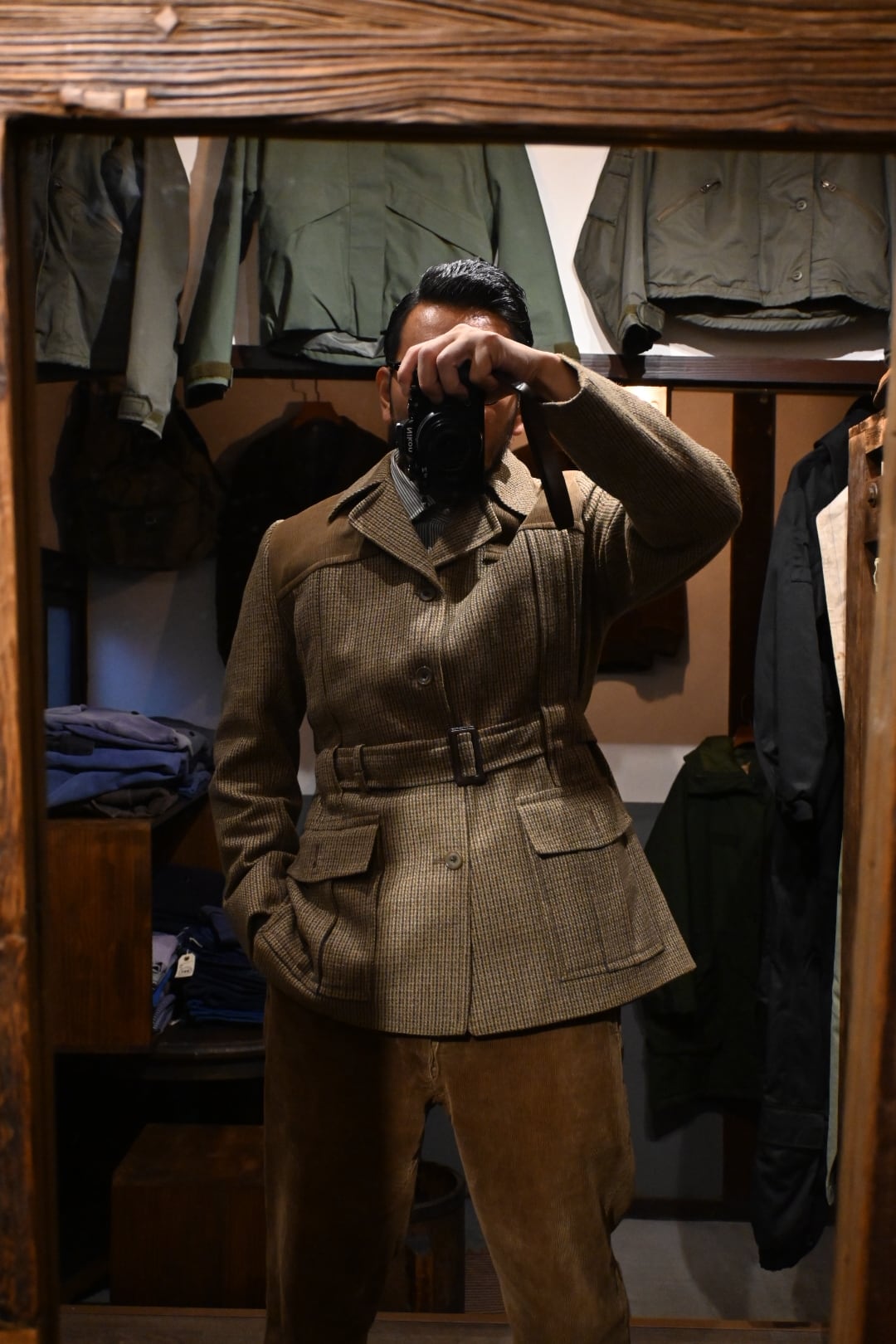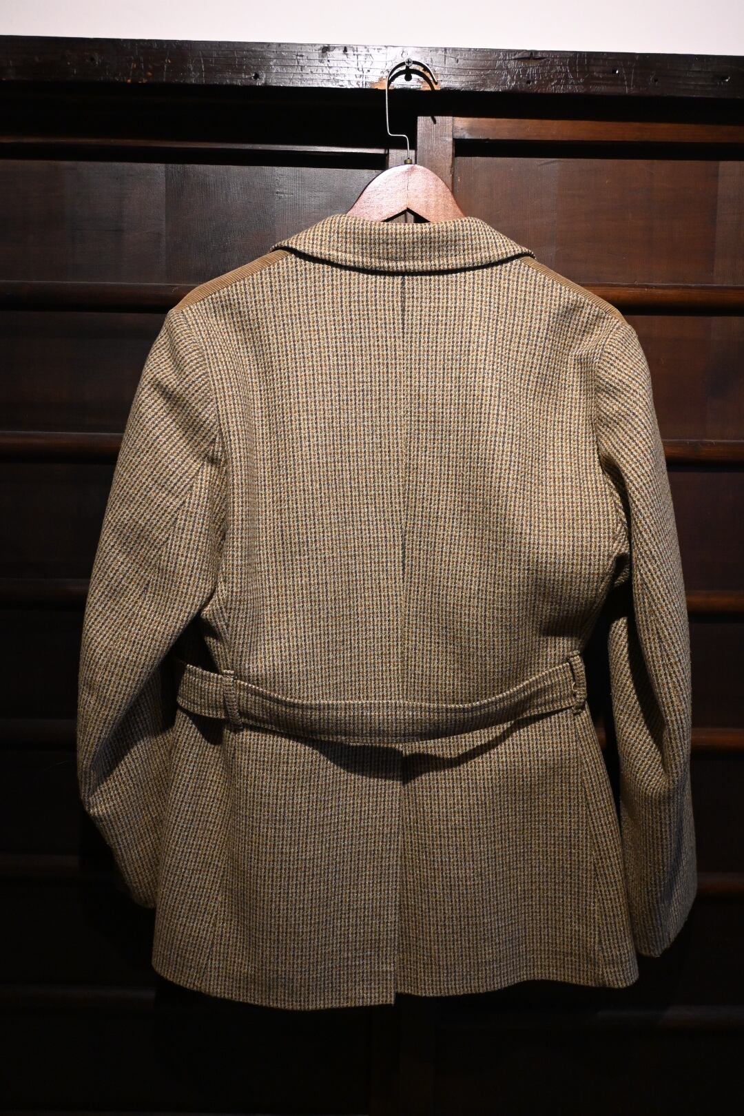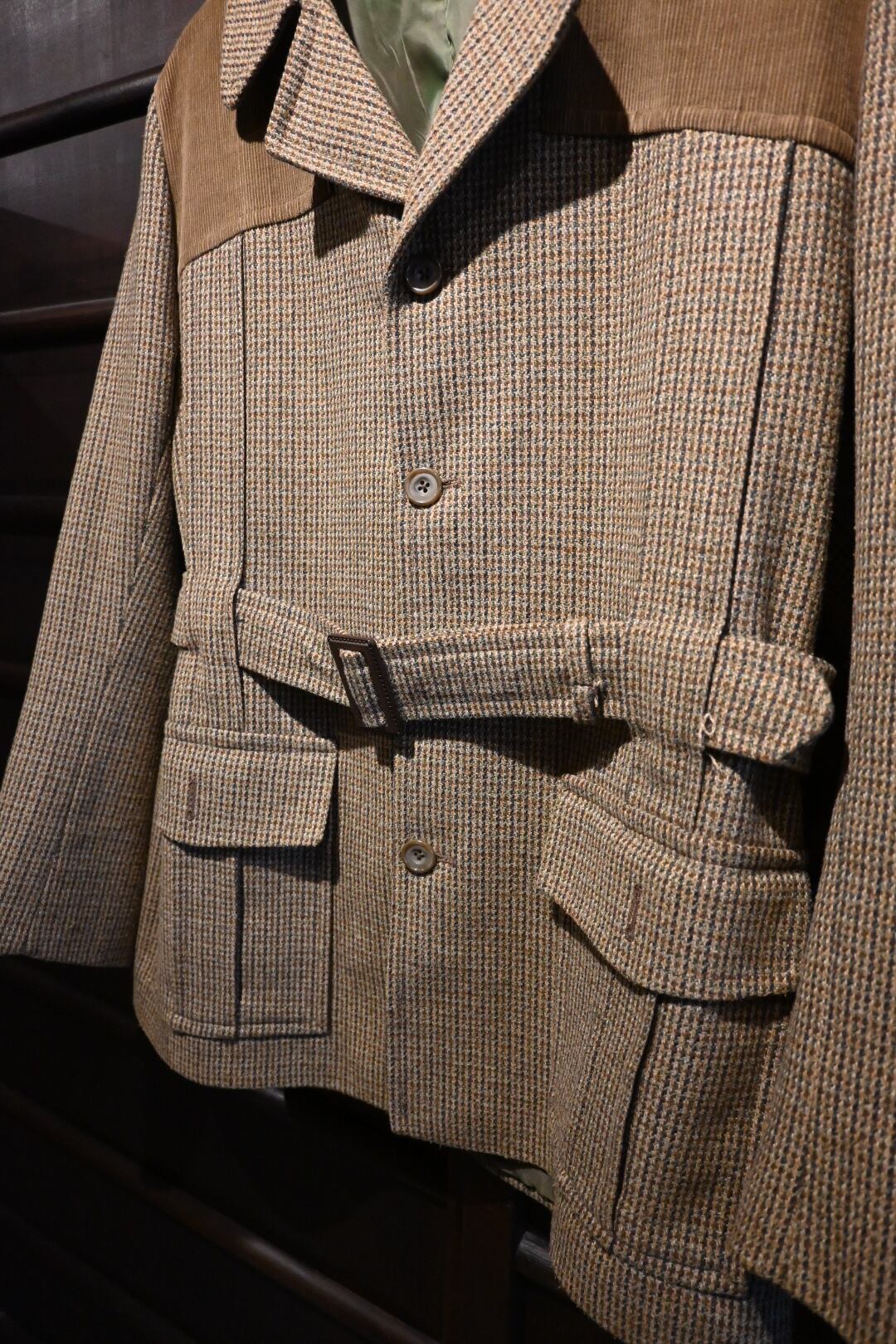 上質な英国製らしいクラシックなツイードに、ショルダー部分はコーデュロイの切り替えが施されたハンティングジャケットスタイル。ベルト付きでシルエットの調整が可能です。