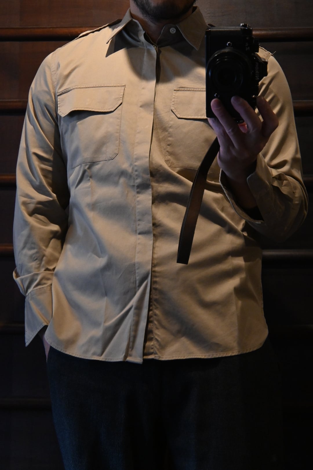 コットン素材のハリのある生地を使用した、ミリタリーシャツベースのデザイン。フロントはフラップ付きのダブルポケット、ショルダーにはエポレットを備え、実用性の高いディテールが特徴です。
