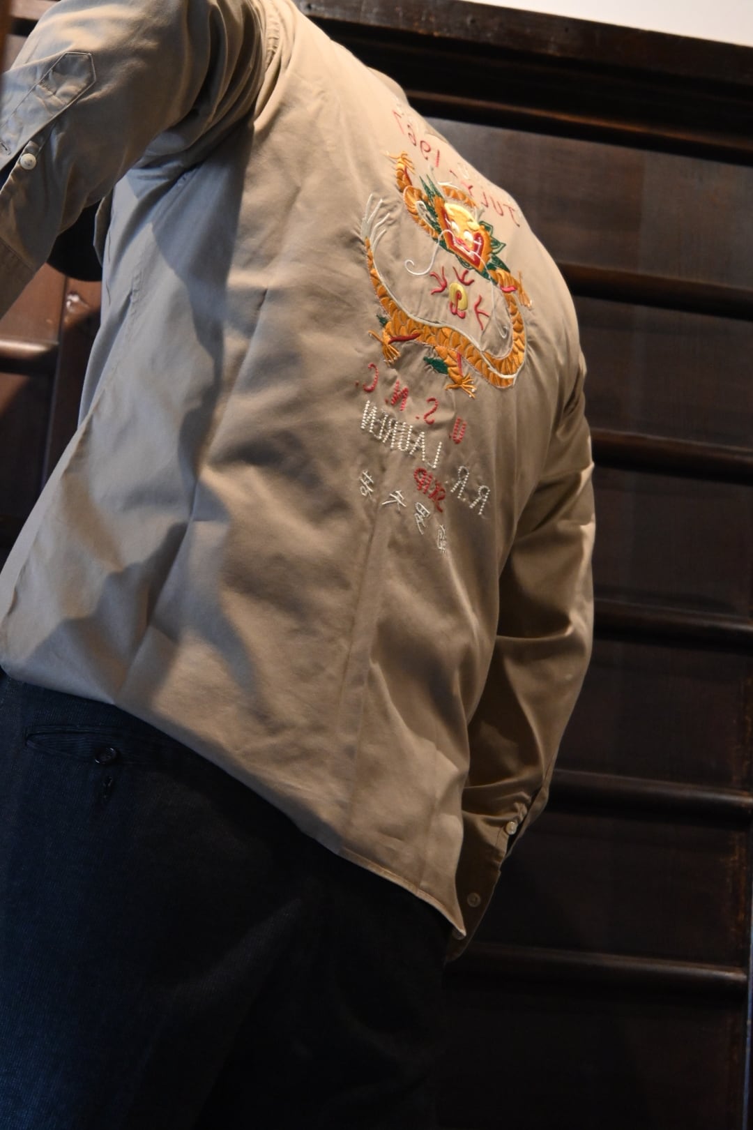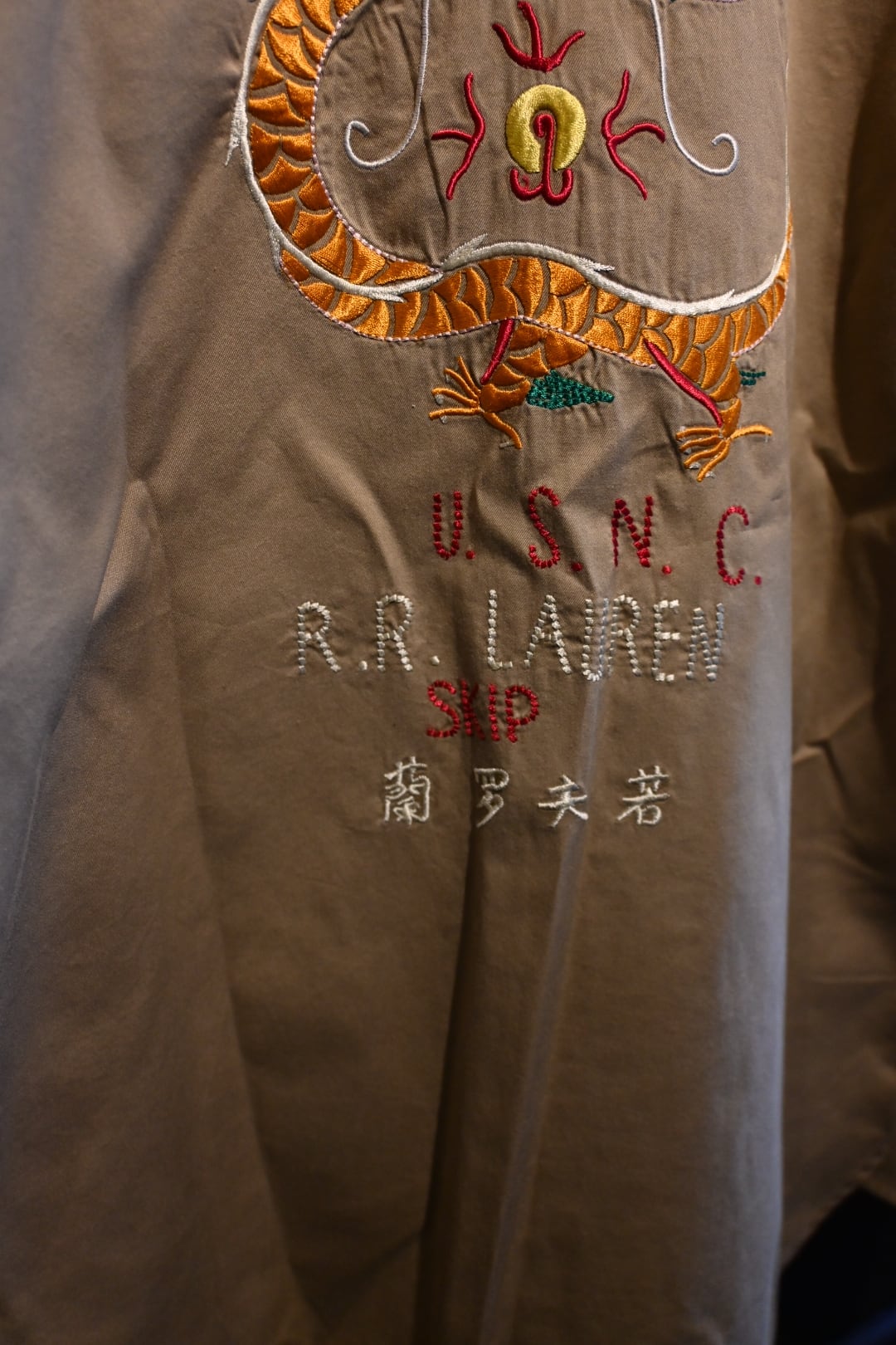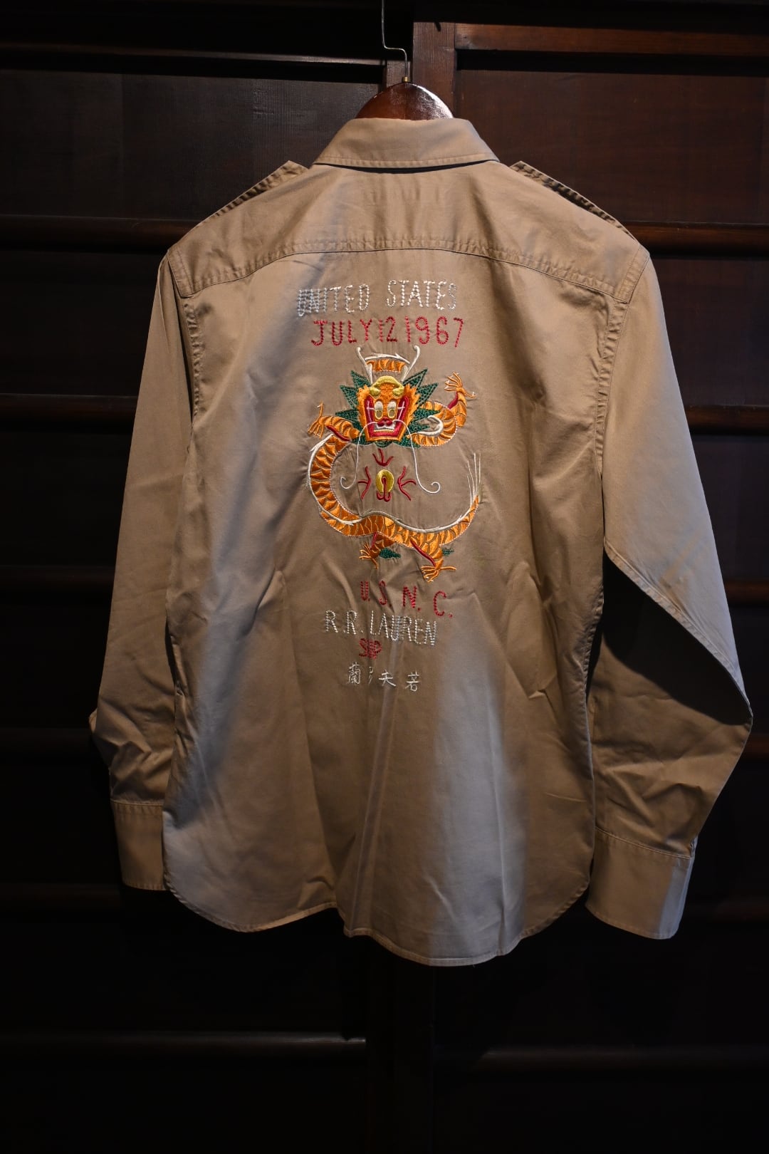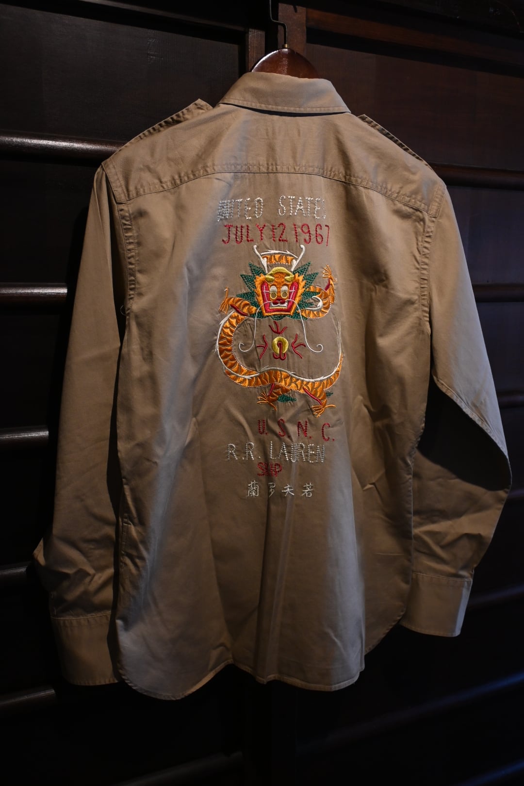 「UNITED STATES / JULY 12 1967 / U.S.N.C. / R.R. LAUREN / SKIP」といった文字と、迫力のあるドラゴン刺繍が施されており、ラルフローレンらしいヒストリカル&ミリタリーテイストを強く感じさせる一着です。