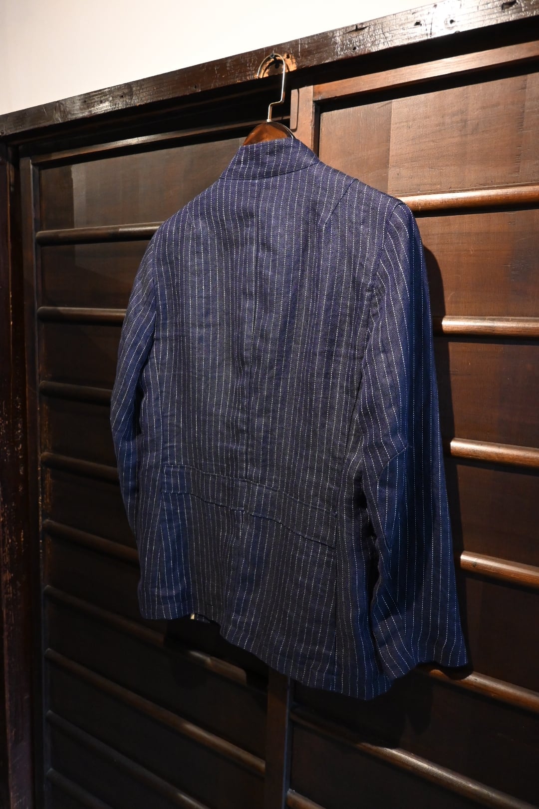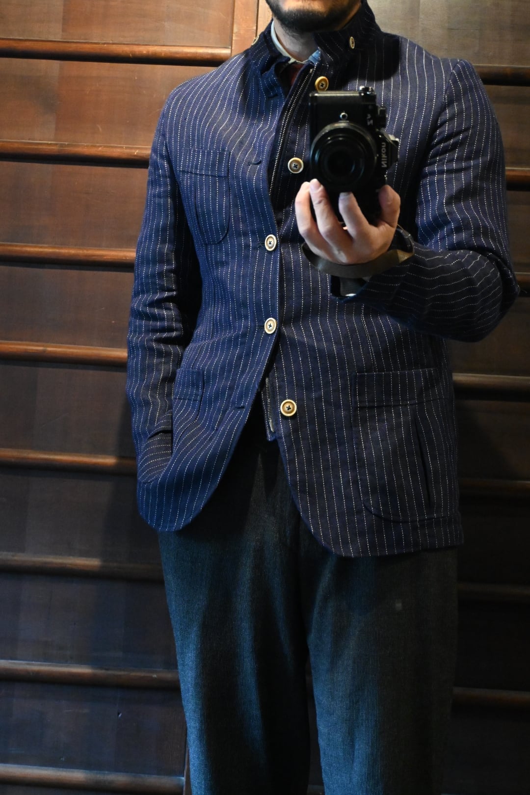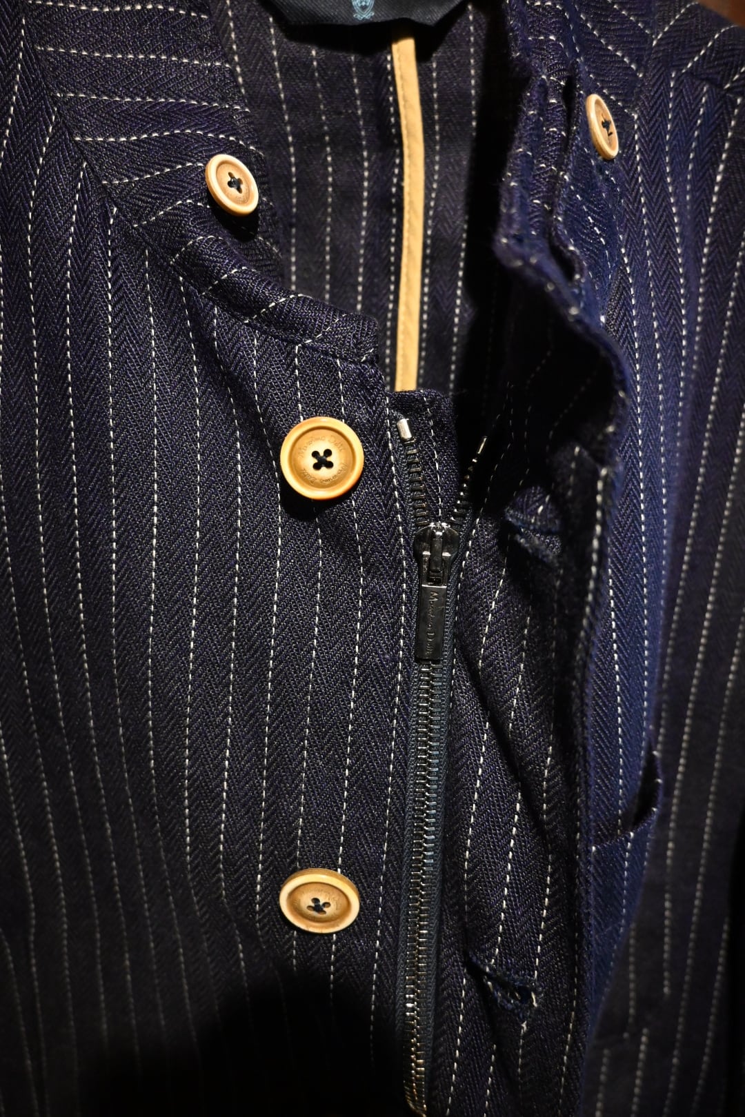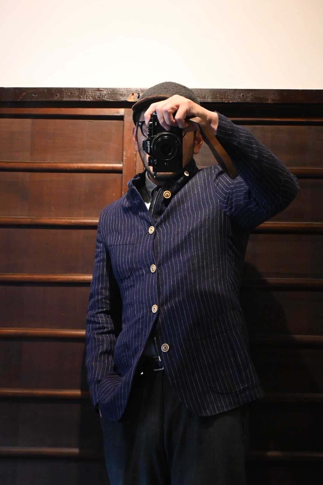 ネイビーベースに細かなストライプを配した上品なデザインで、ワークジャケットとテーラードの要素を併せ持った一着。コットンを主体とした生地感で、柔らかさがありながらも程よいハリがあり、カジュアルにもきれいめにも対応します。