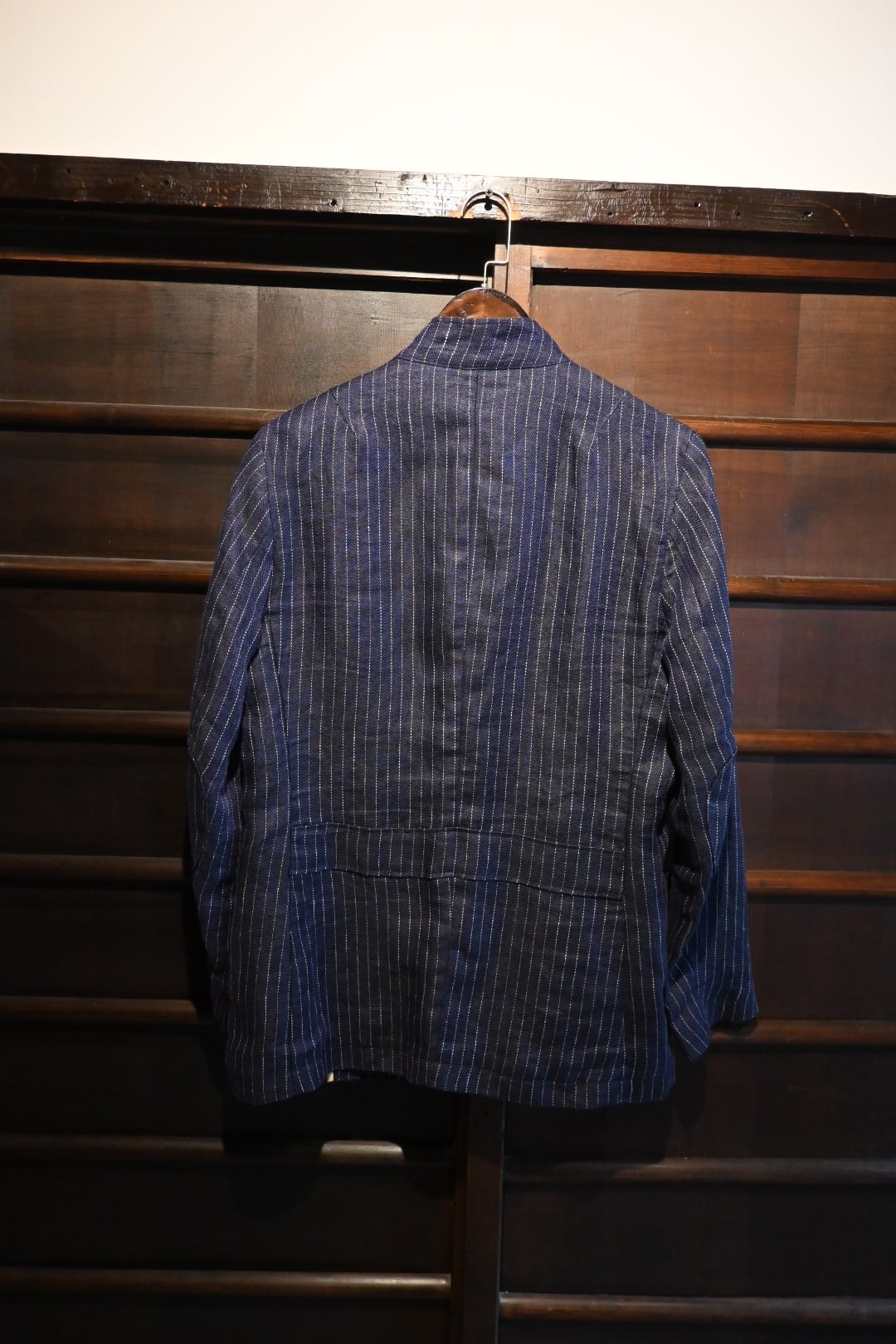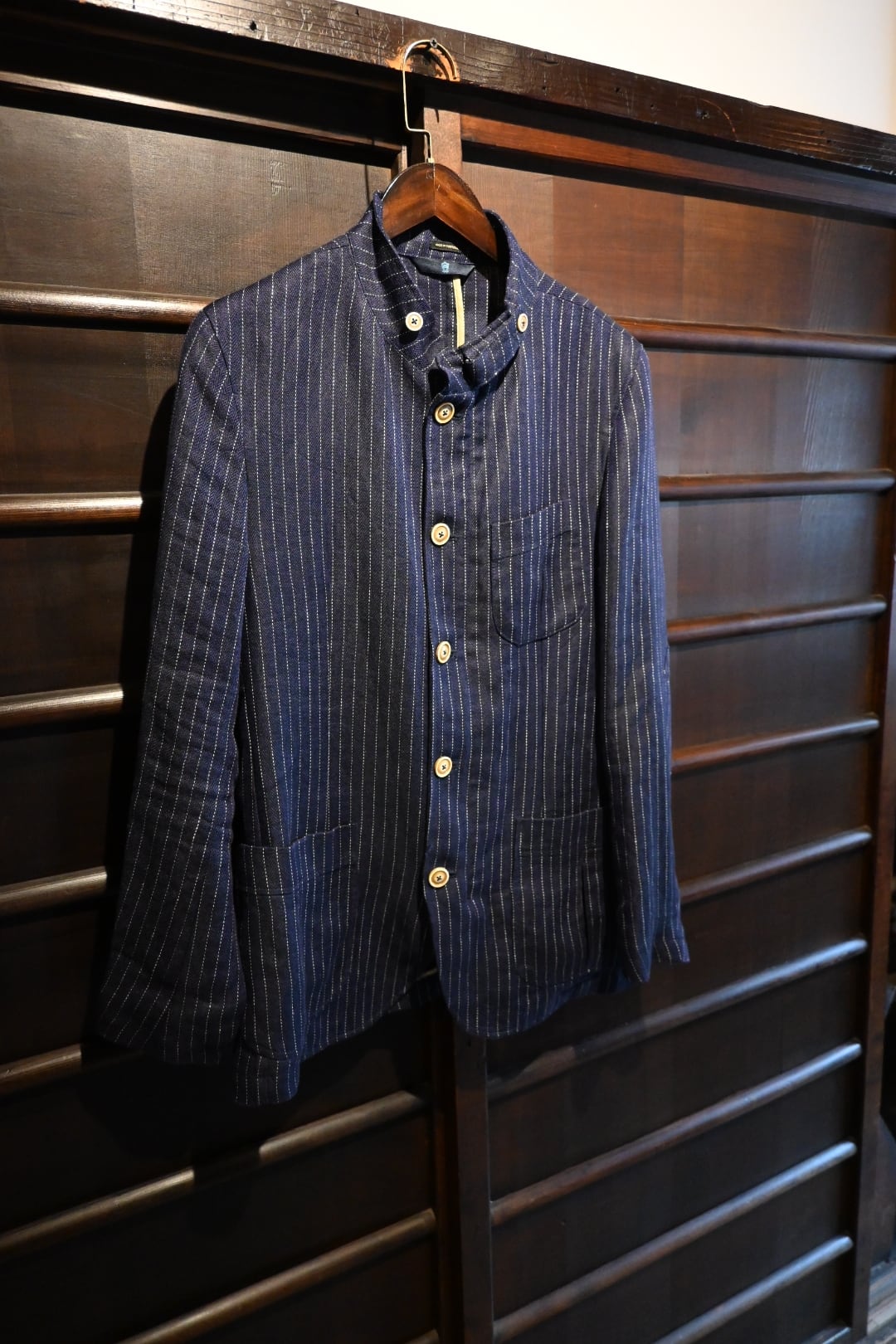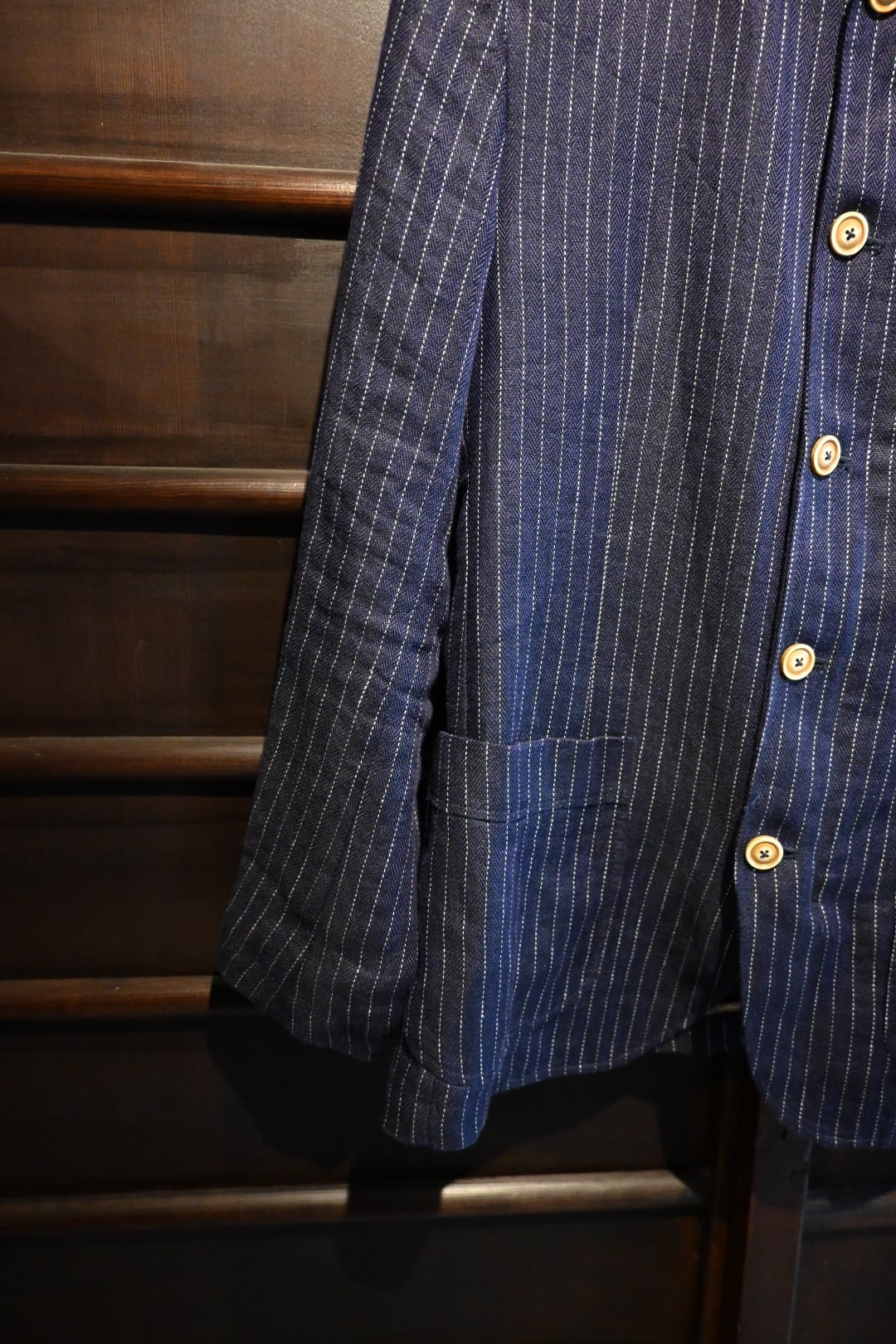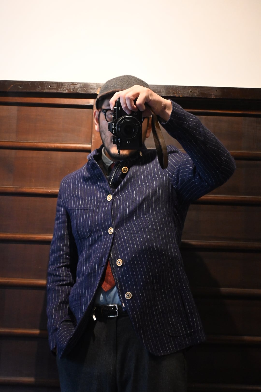 ネイビーベースに細かなストライプを配した上品なデザインで、ワークジャケットとテーラードの要素を併せ持った一着。コットンを主体とした生地感で、柔らかさがありながらも程よいハリがあり、カジュアルにもきれいめにも対応します。
