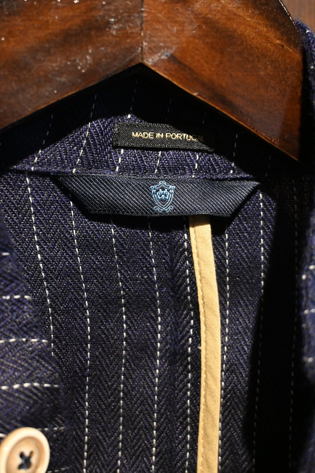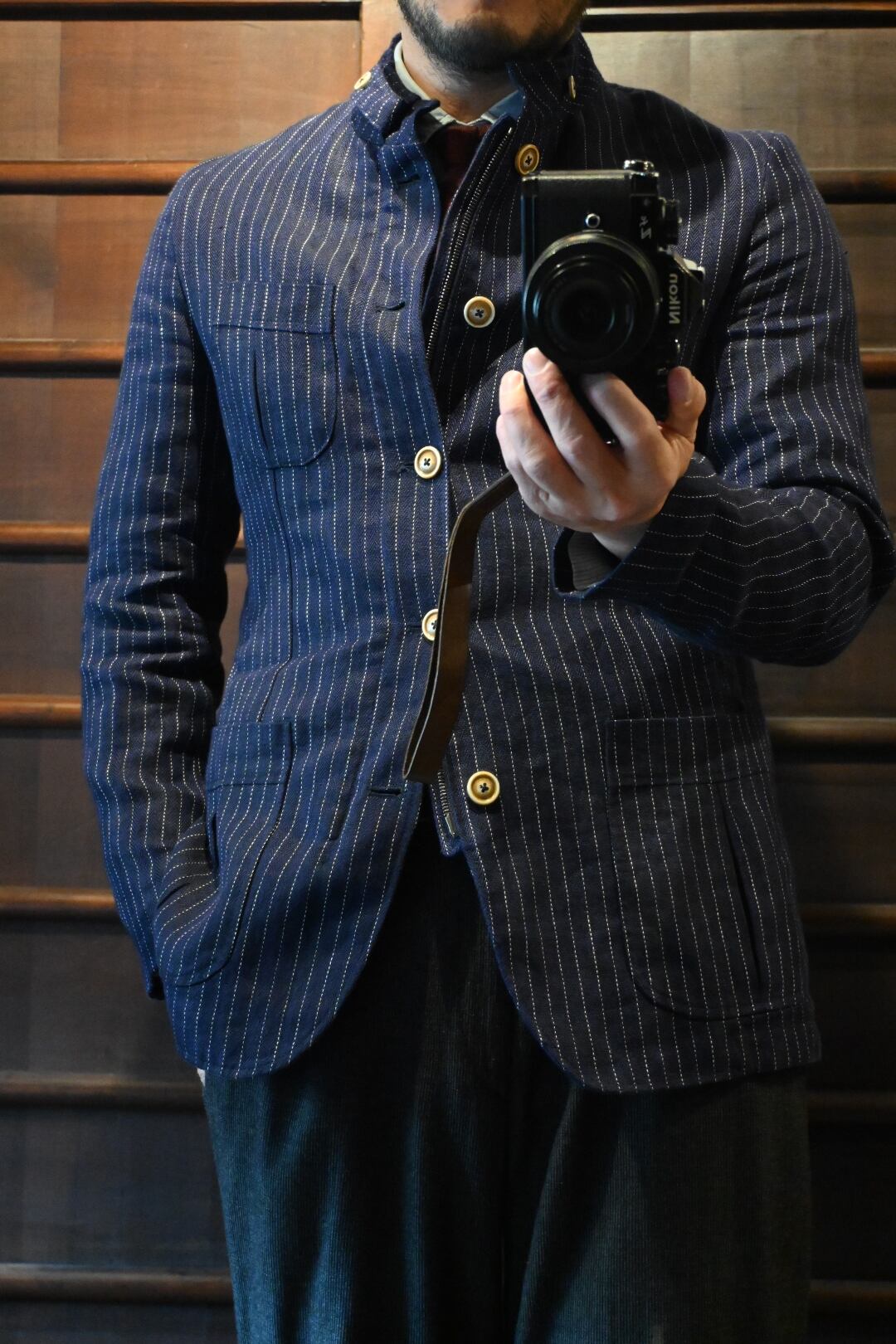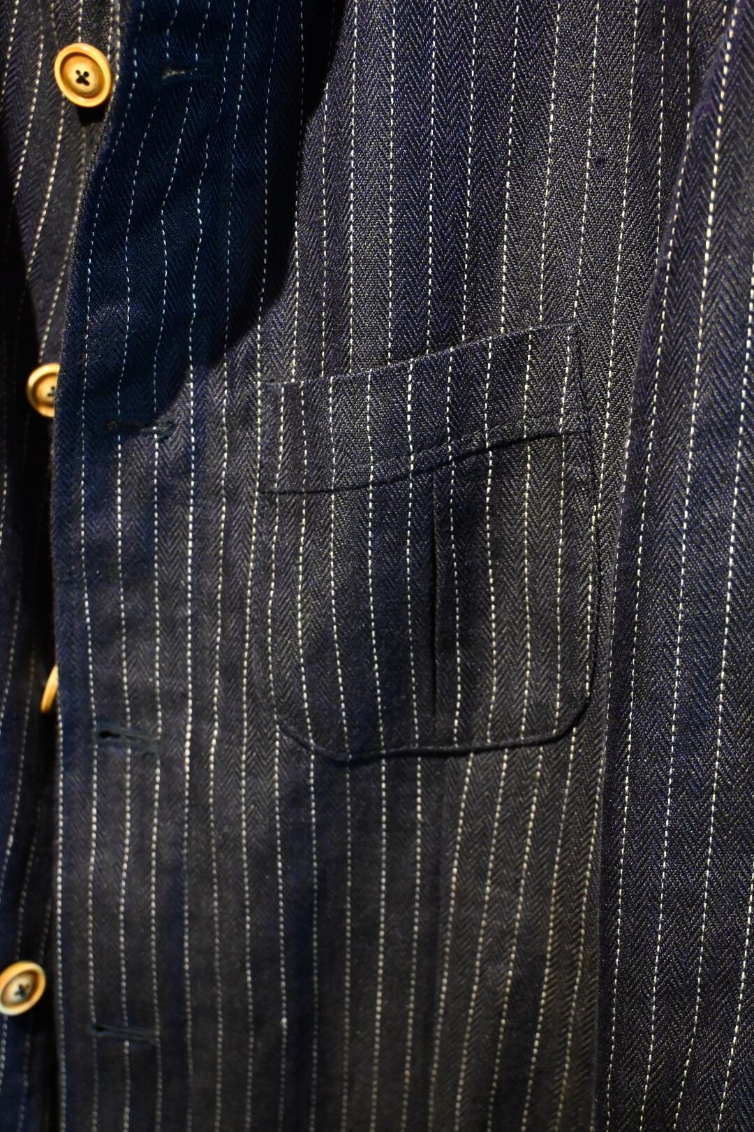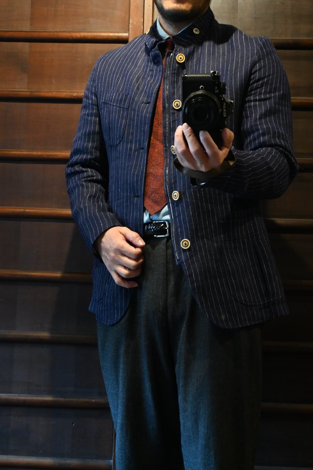 ネイビーベースに細かなストライプを配した上品なデザインで、ワークジャケットとテーラードの要素を併せ持った一着。コットンを主体とした生地感で、柔らかさがありながらも程よいハリがあり、カジュアルにもきれいめにも対応します。