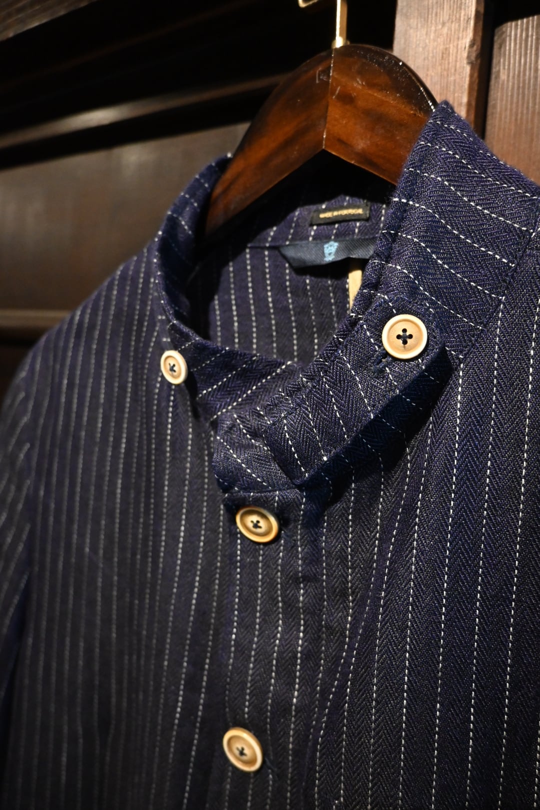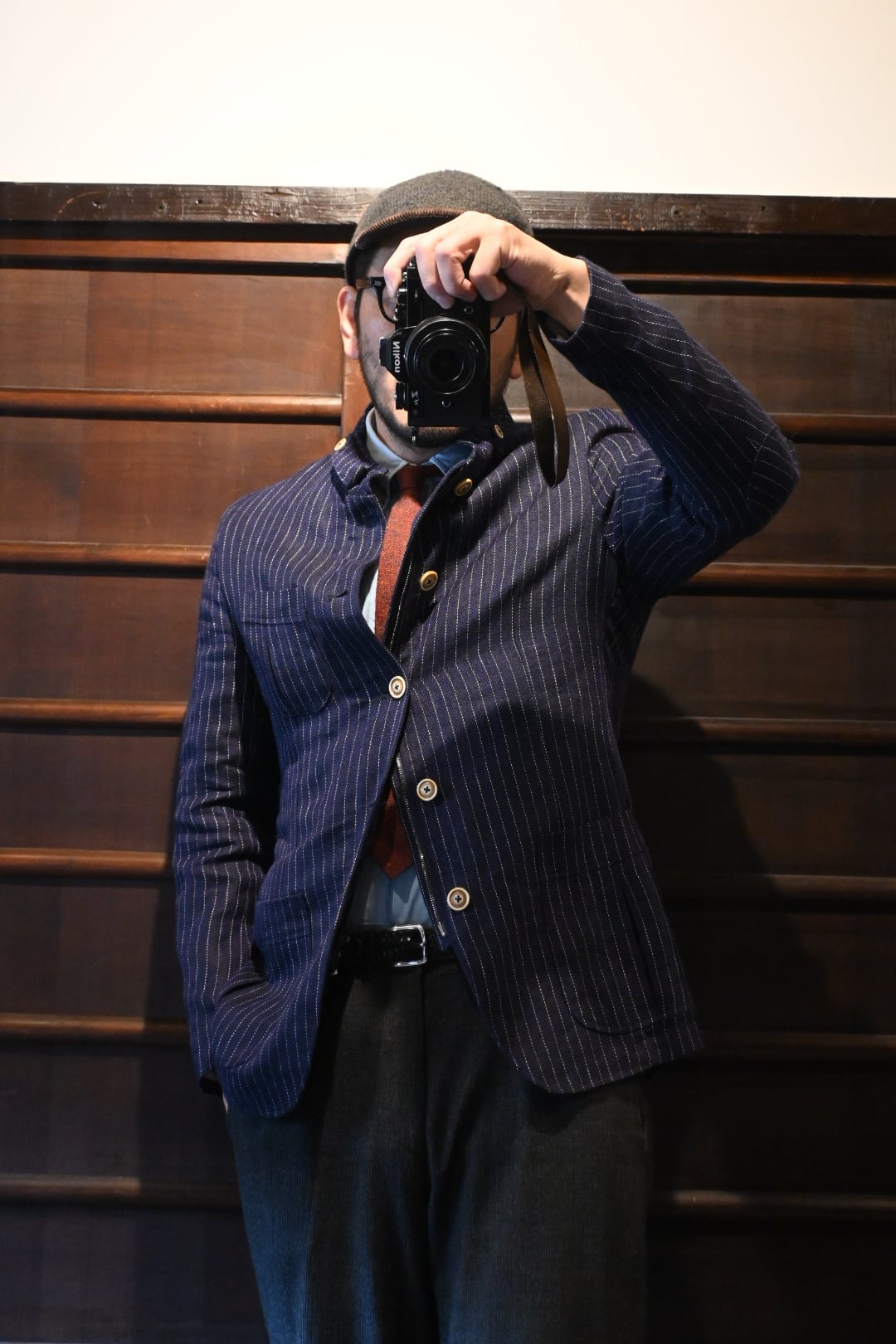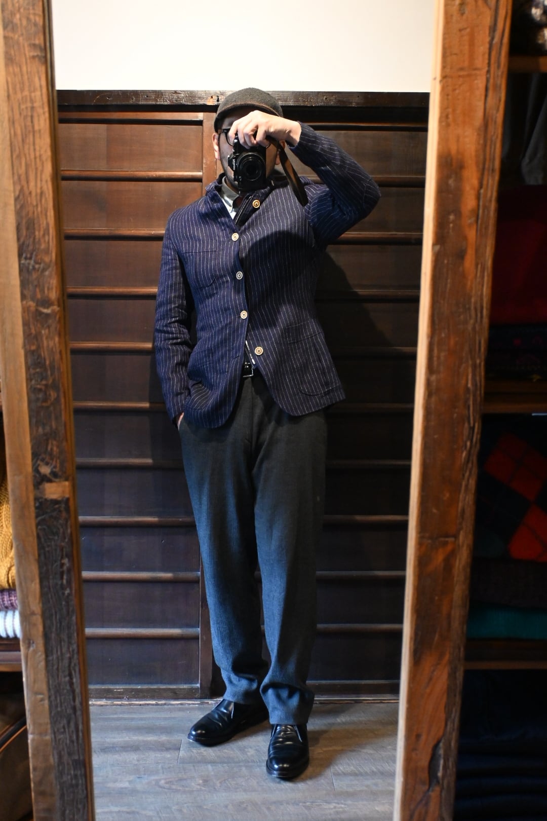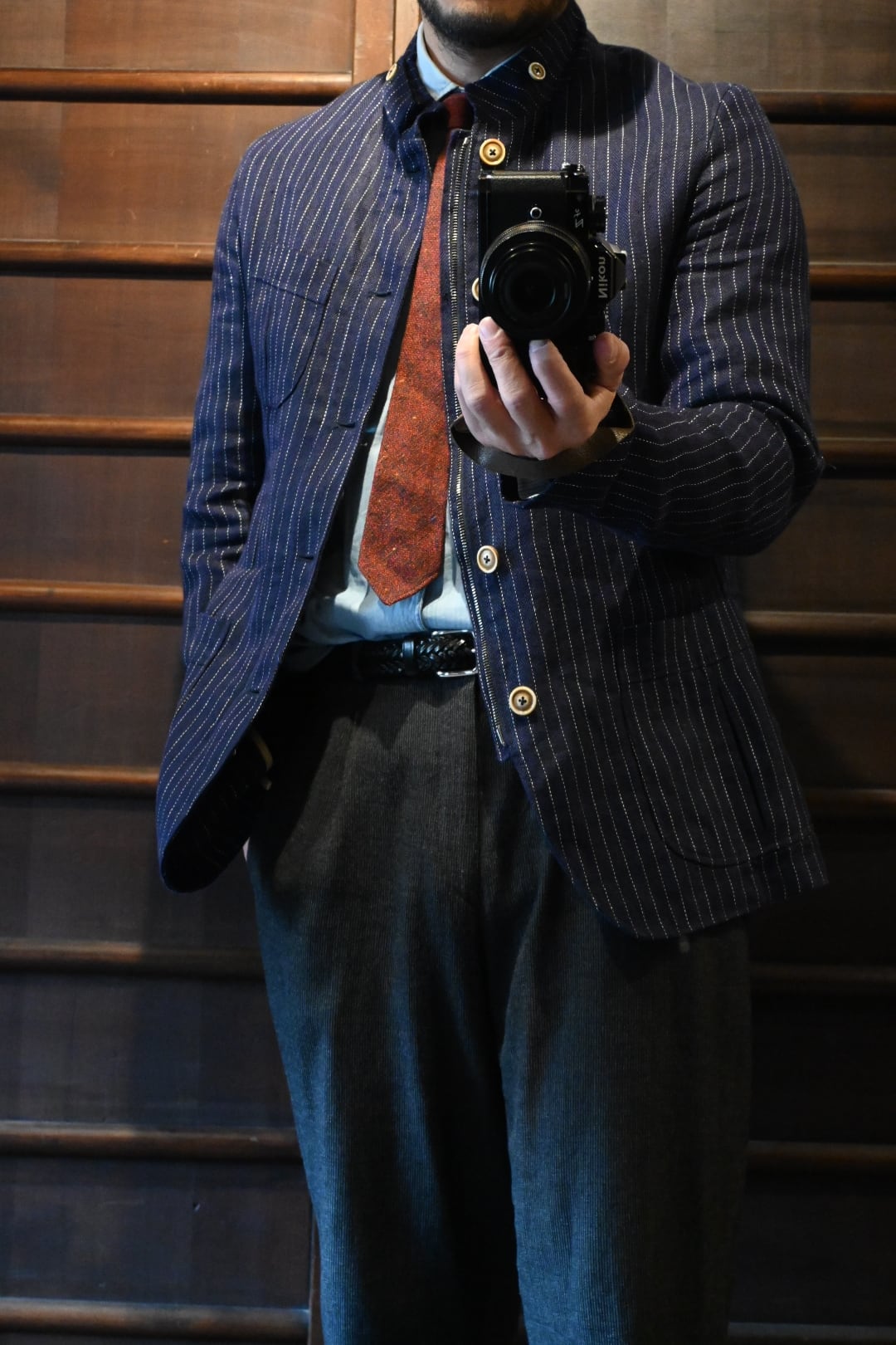 ネイビーベースに細かなストライプを配した上品なデザインで、ワークジャケットとテーラードの要素を併せ持った一着。コットンを主体とした生地感で、柔らかさがありながらも程よいハリがあり、カジュアルにもきれいめにも対応します。