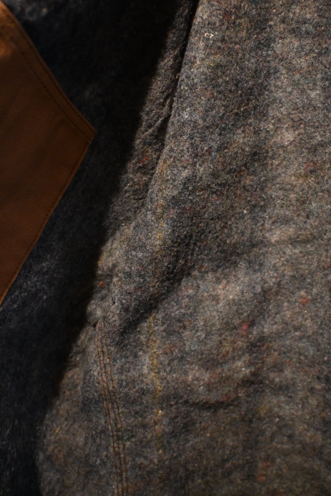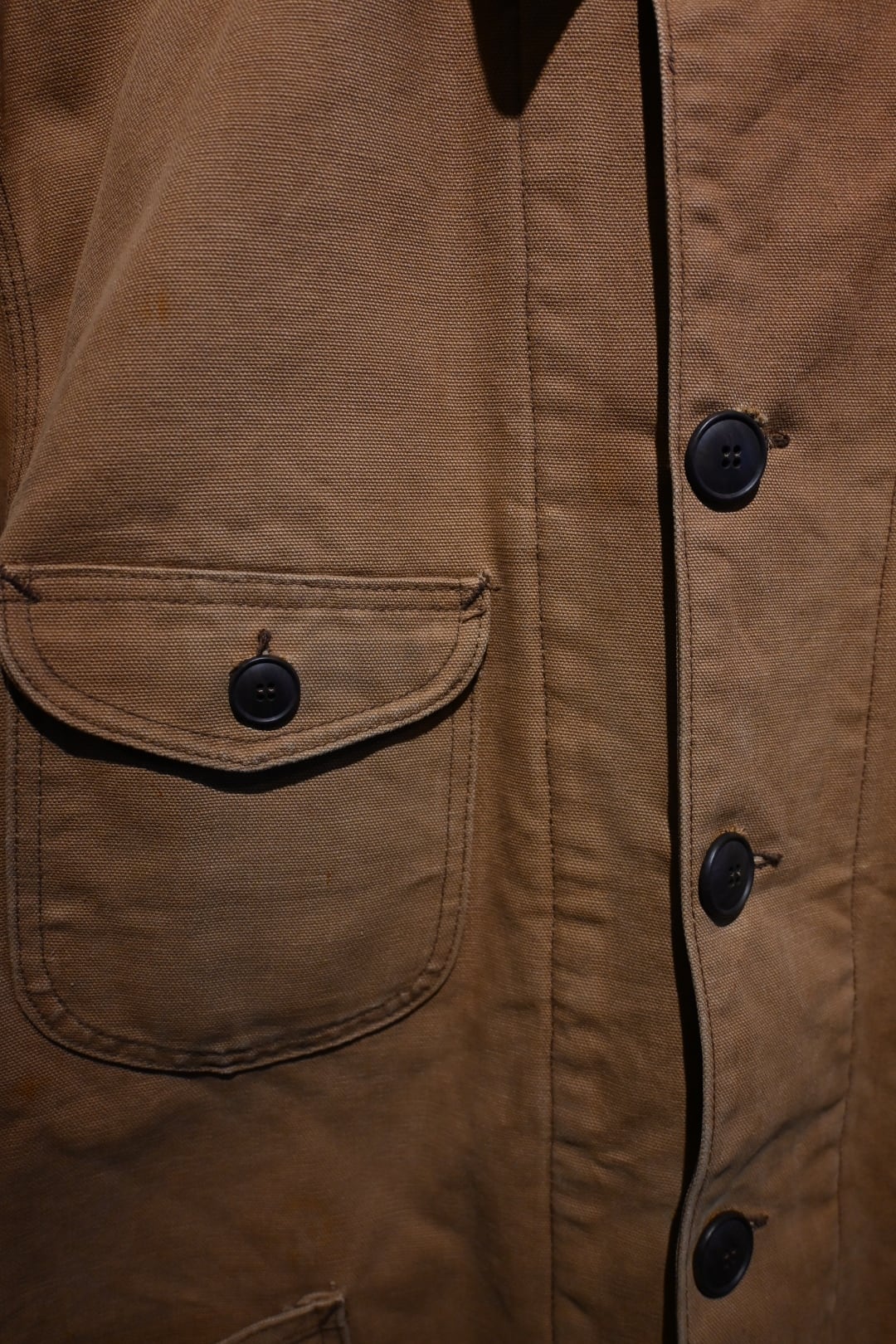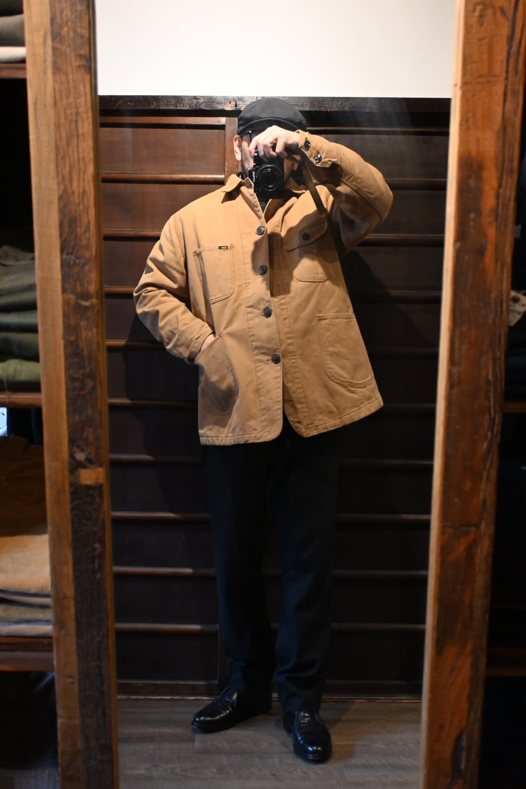 肉厚で耐久性のあるブラウンダック生地を使用し、内側には保温性の高いブランケットライニングが施されています。襟はコーデュロイ仕様で、クラシックなワークジャケットらしい無骨な雰囲気が魅力の一着です。