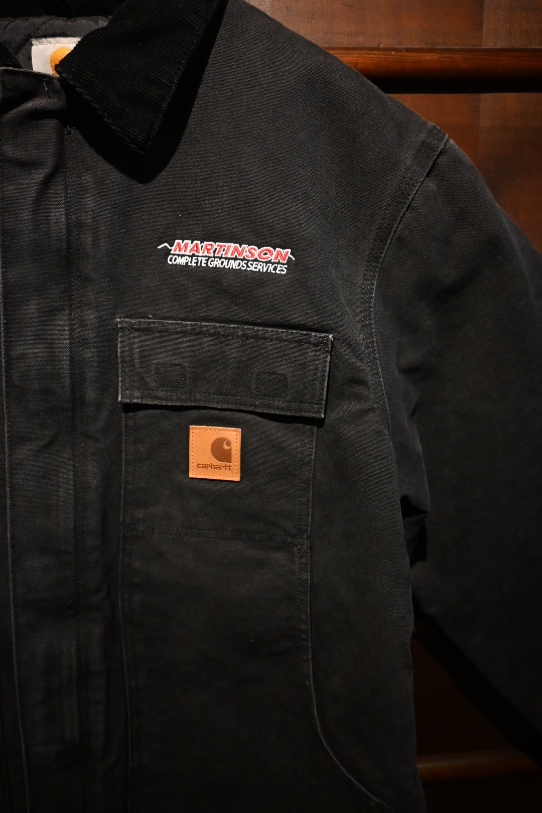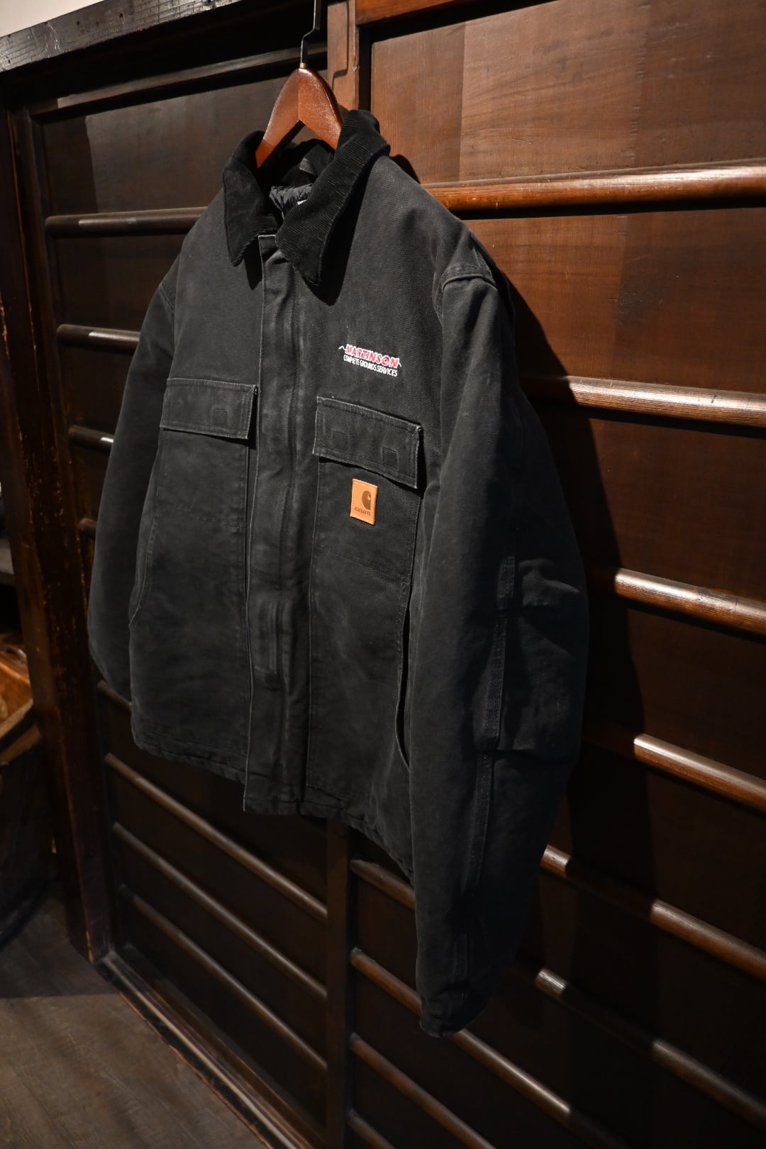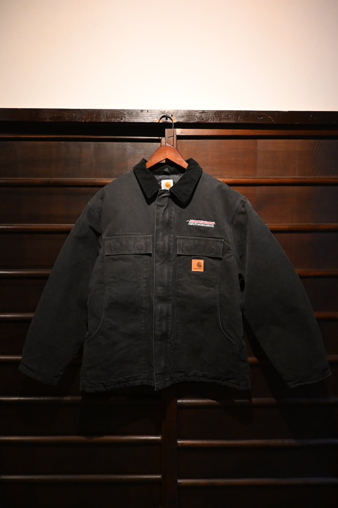 フロントはジップ開閉、胸にはCarharttレザーパッチが付き、左胸・背面には