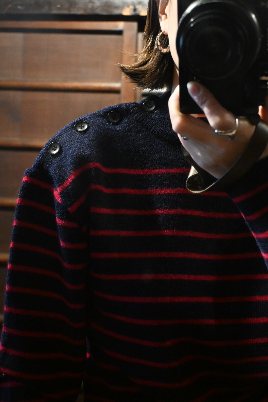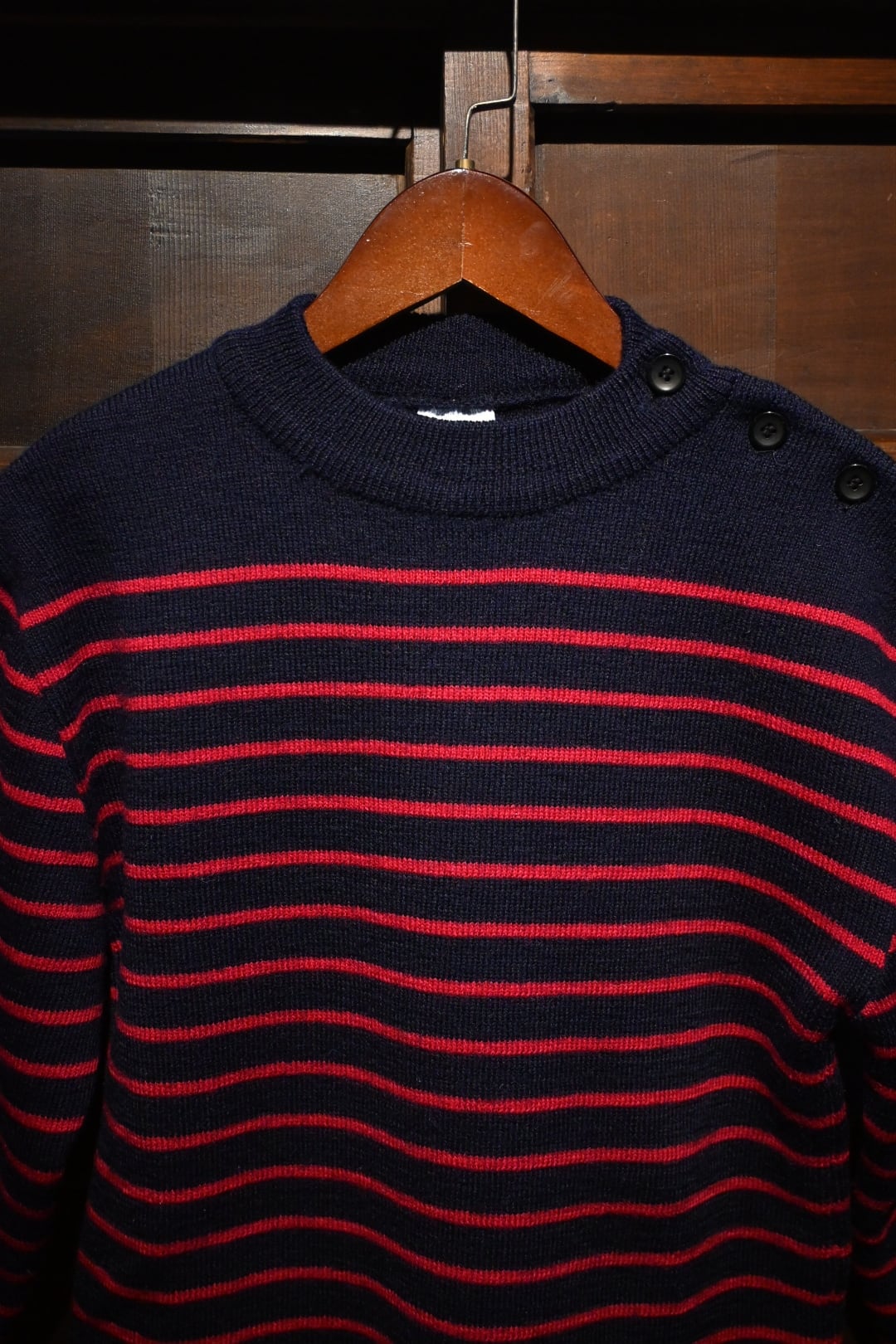 左肩にはボタンが配されたショルダーボタン仕様で、元々は漁師や船乗りの作業着として用いられていた、実用性とデザイン性を兼ね備えたディテールです。