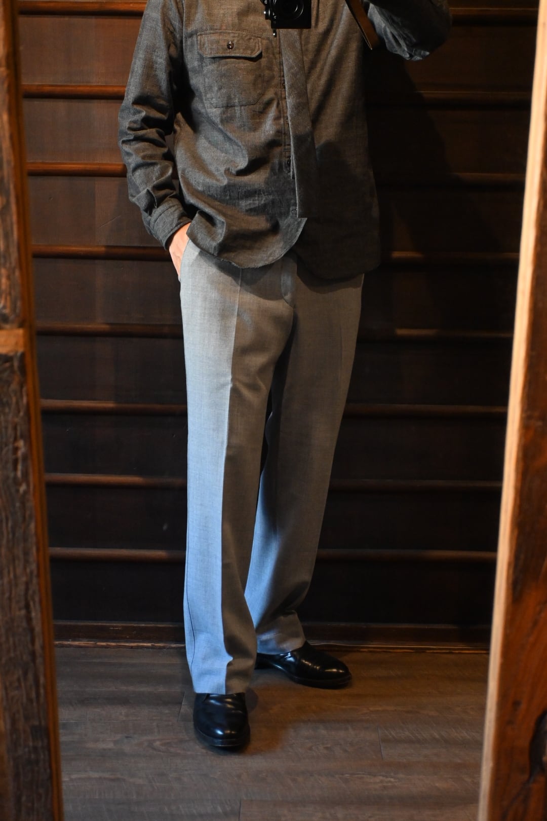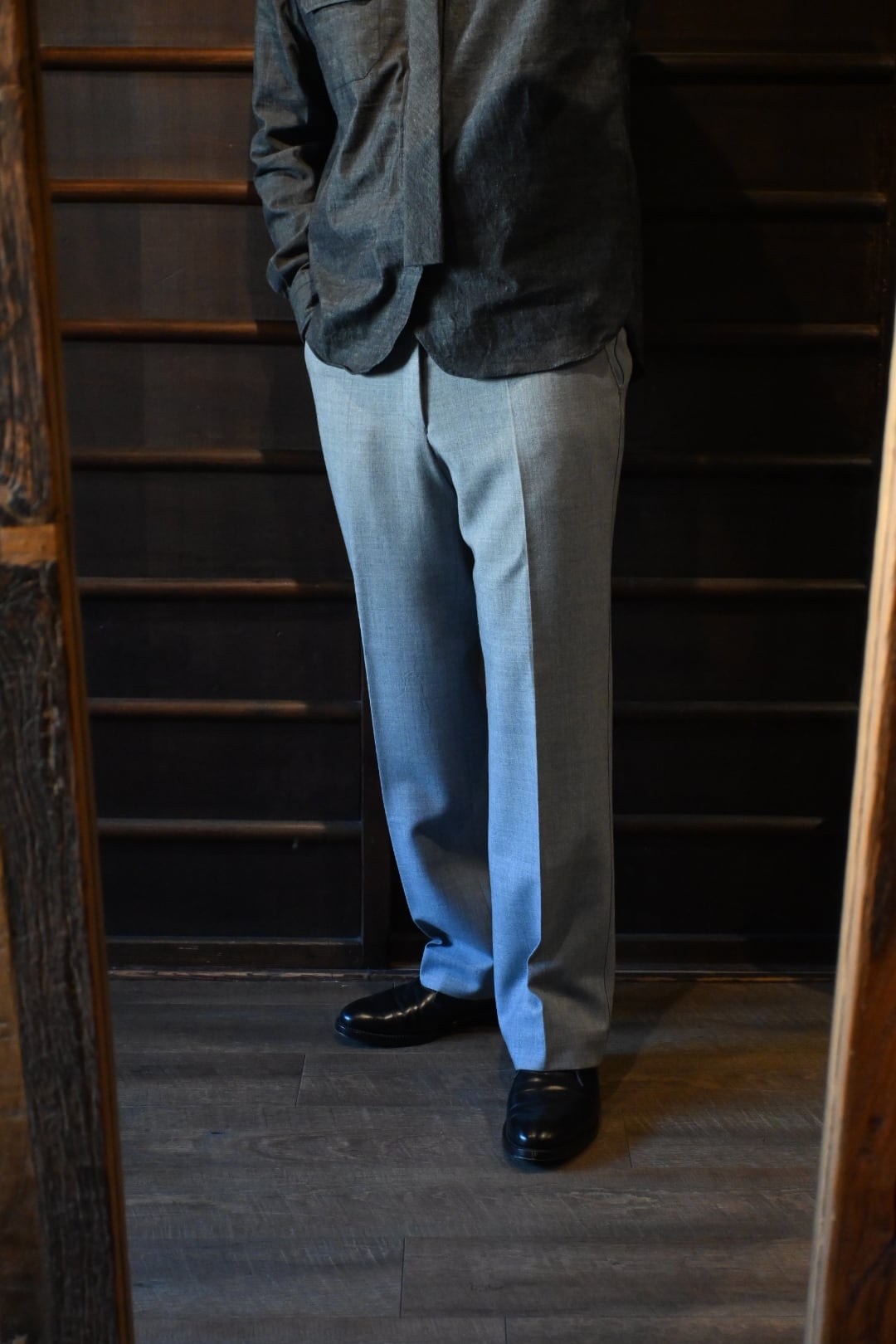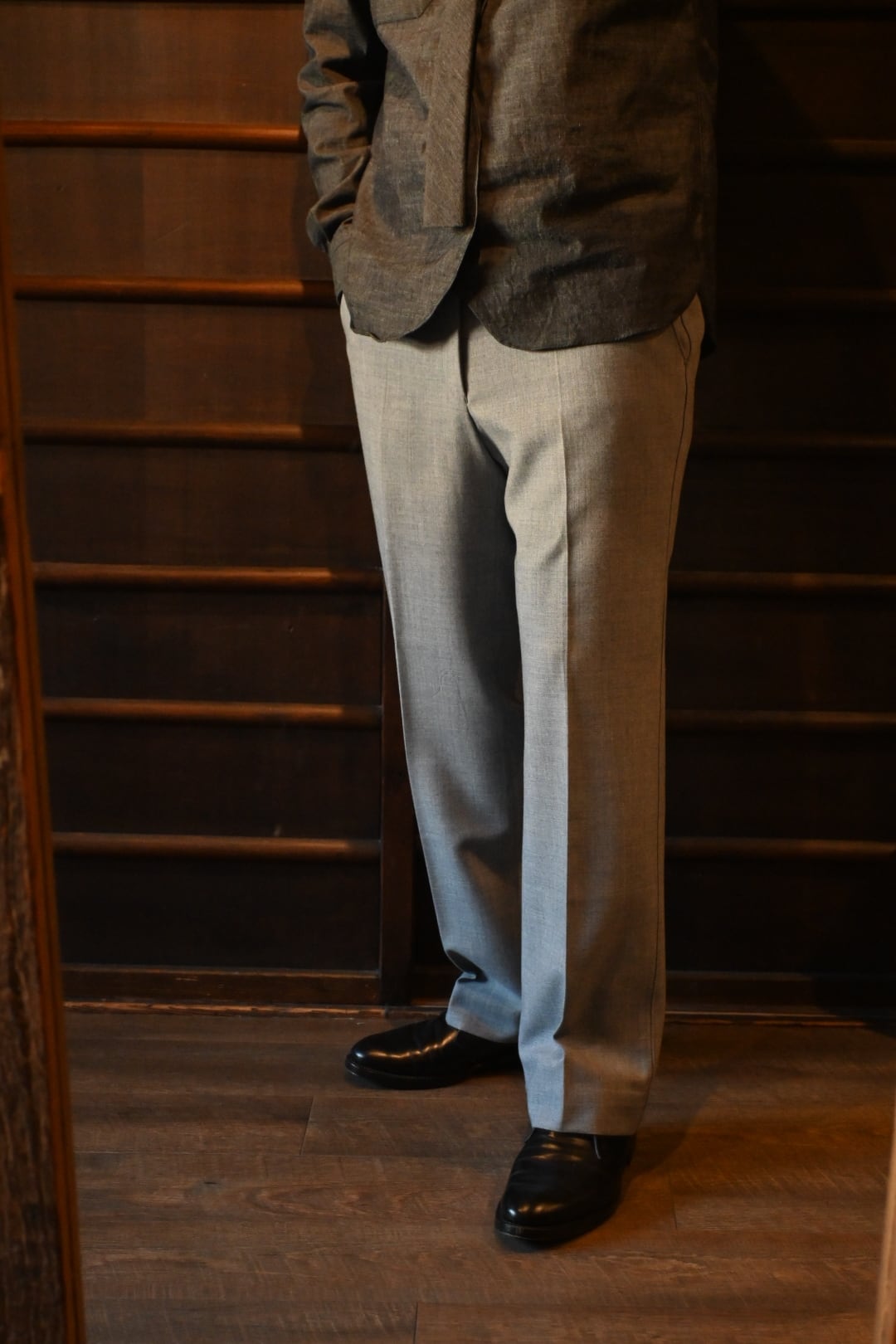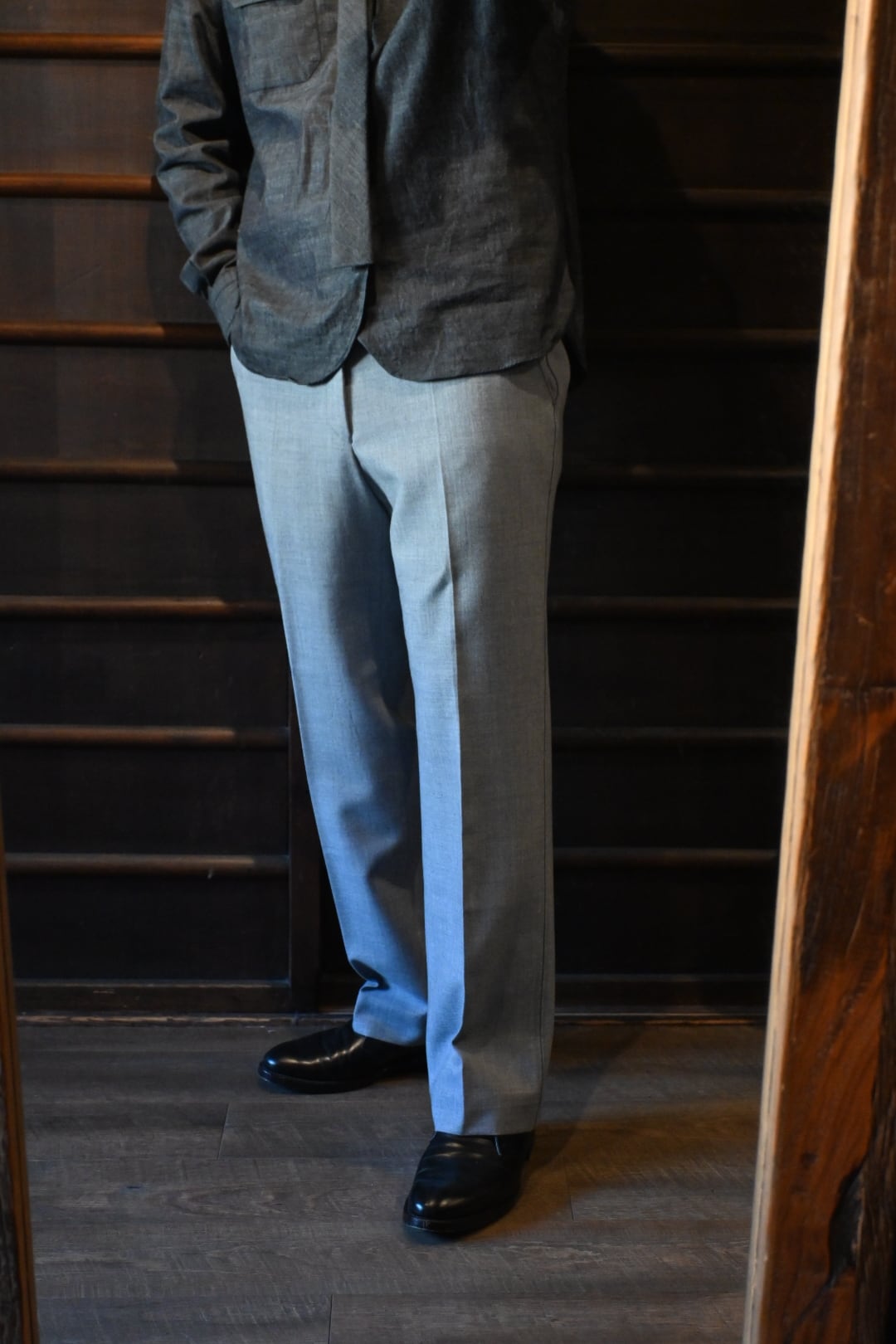 落ち着いたグレー【ブルーも少しはいってる】カラーで、上品なウール混素材を使用した一本。センタープレス入りでシルエットも綺麗に出ており、オンオフ問わず着用いただけます。