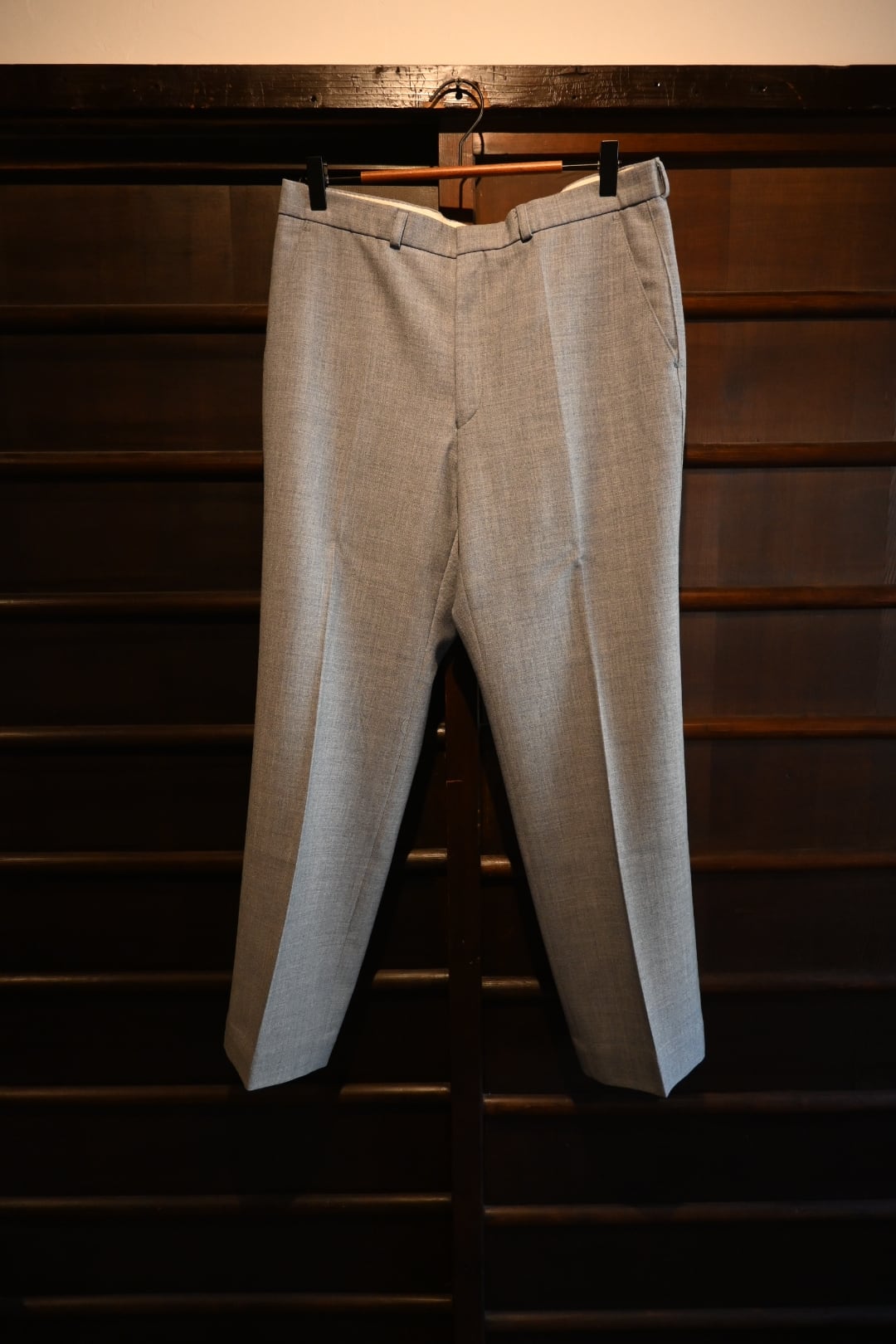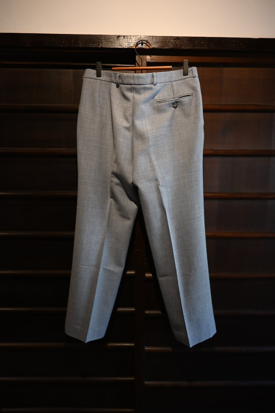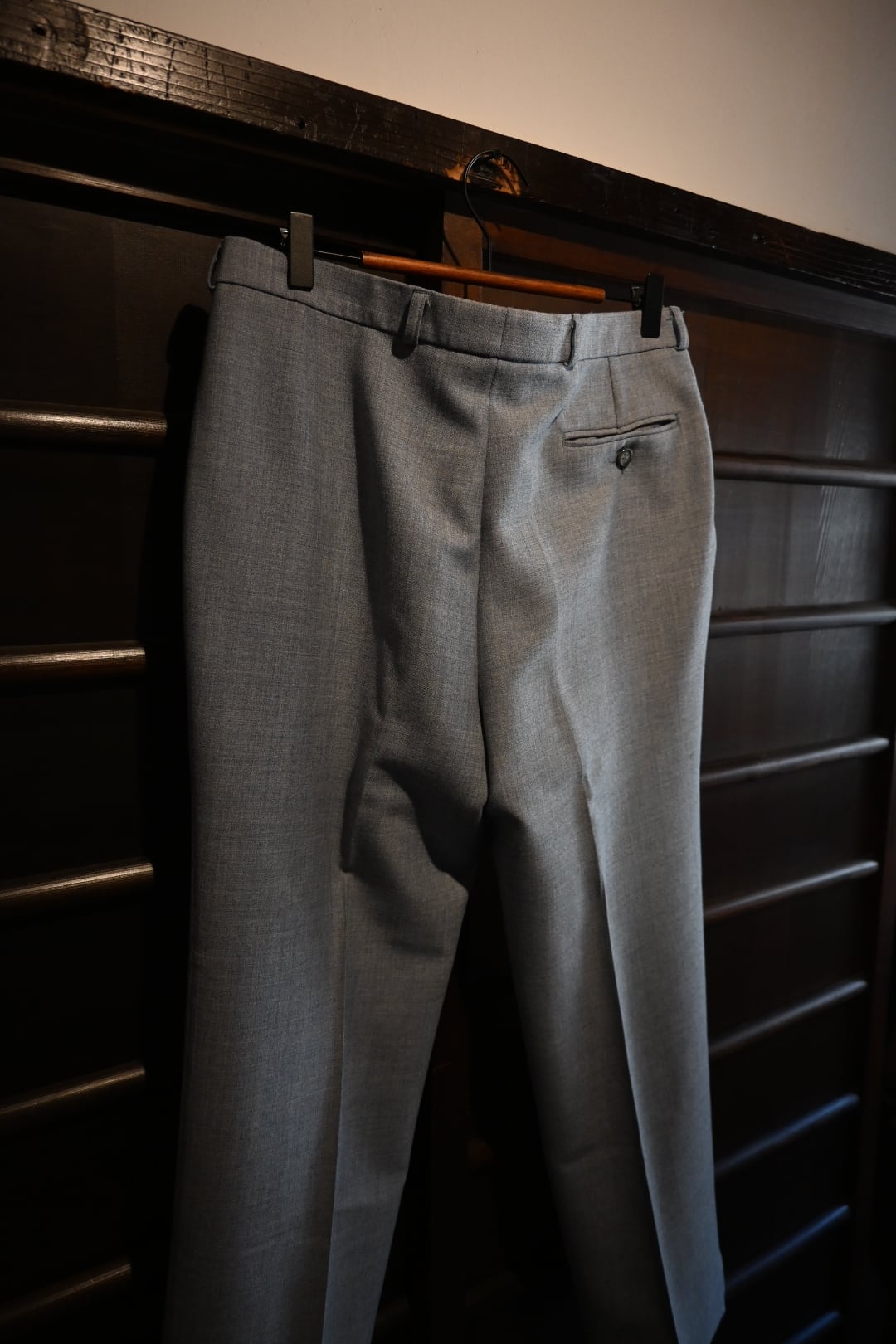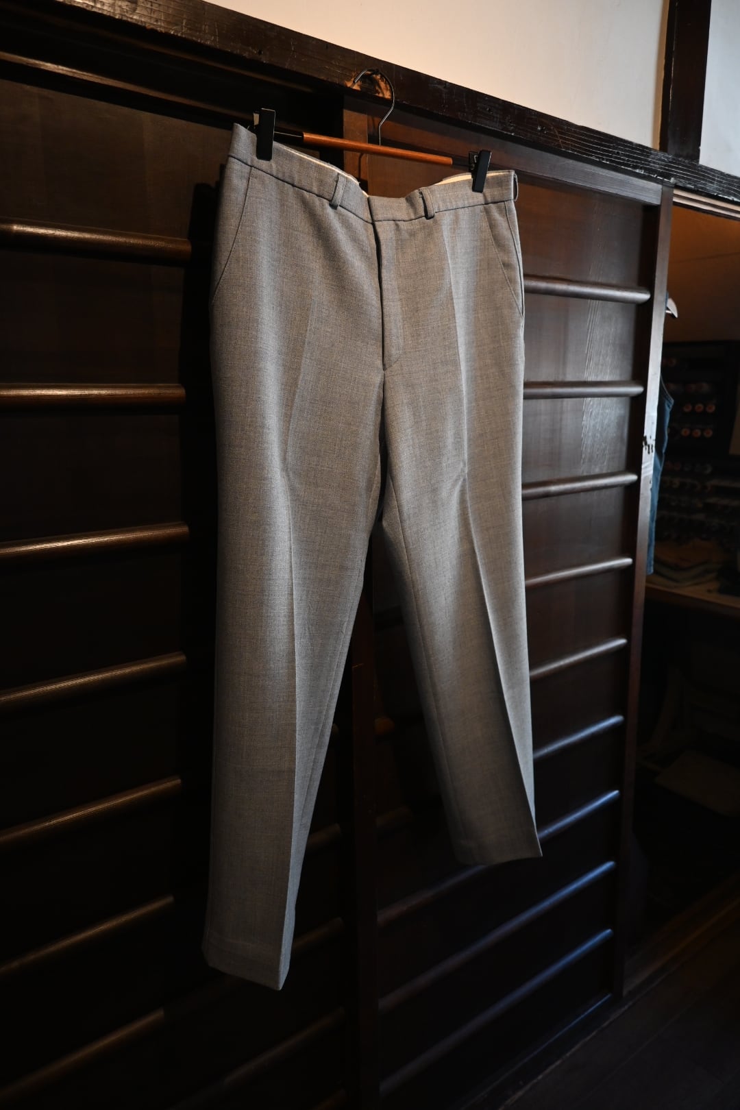 落ち着いたグレー【ブルーも少しはいってる】カラーで、上品なウール混素材を使用した一本。センタープレス入りでシルエットも綺麗に出ており、オンオフ問わず着用いただけます。