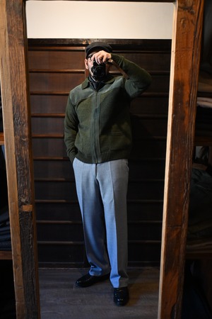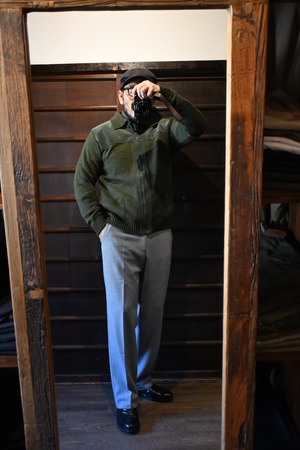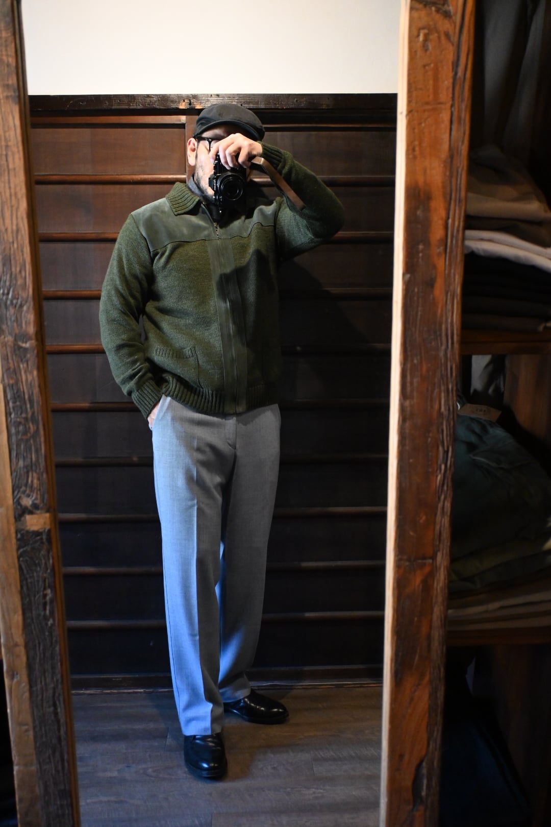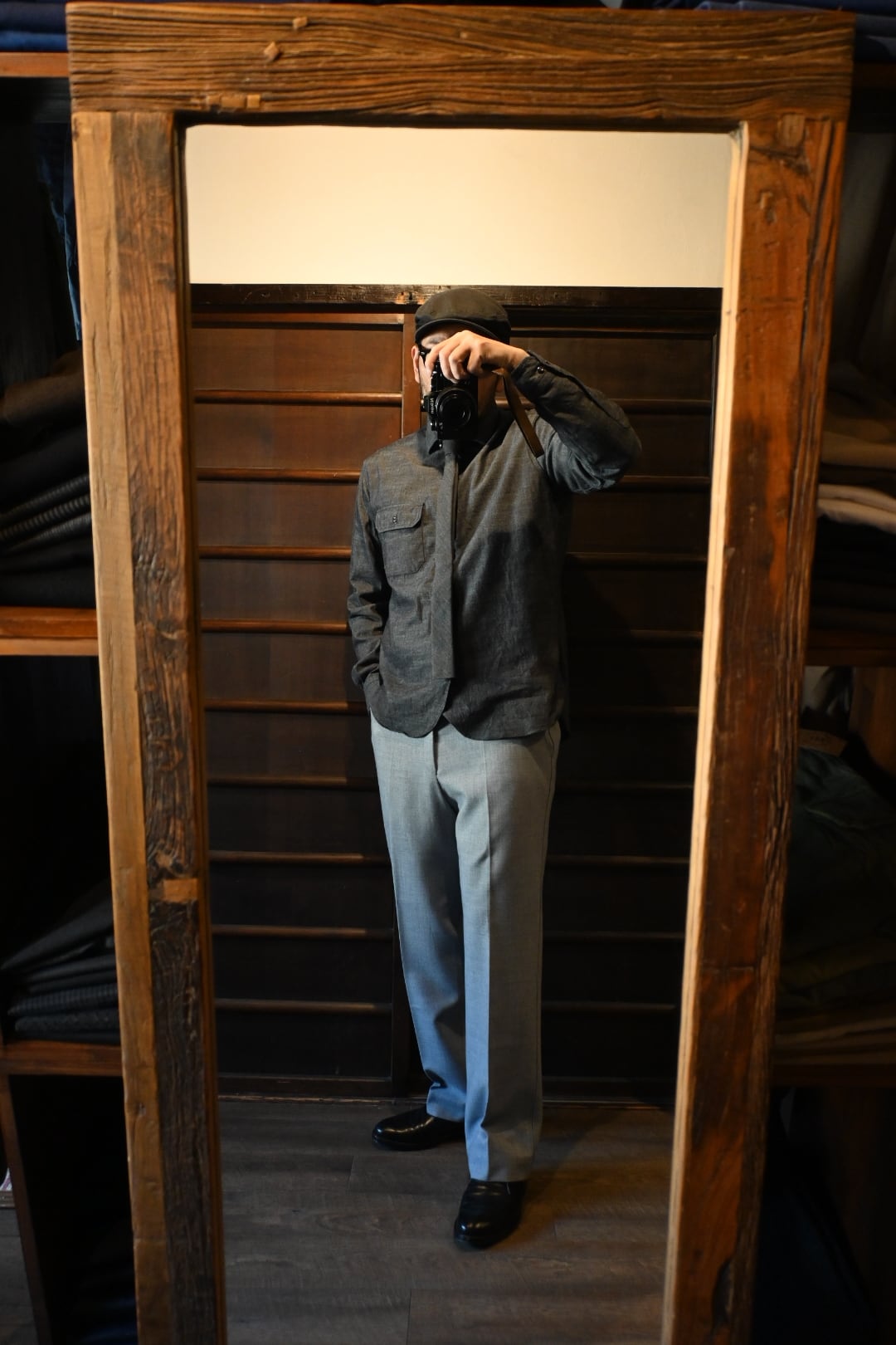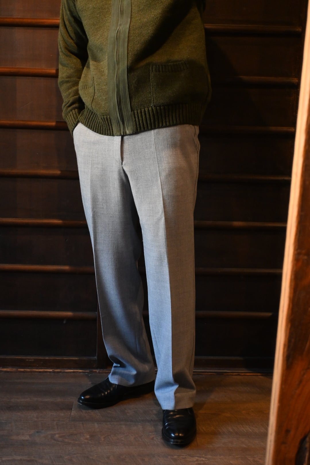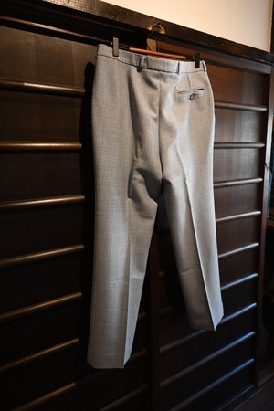 落ち着いたグレー【ブルーも少しはいってる】カラーで、上品なウール混素材を使用した一本。センタープレス入りでシルエットも綺麗に出ており、オンオフ問わず着用いただけます。