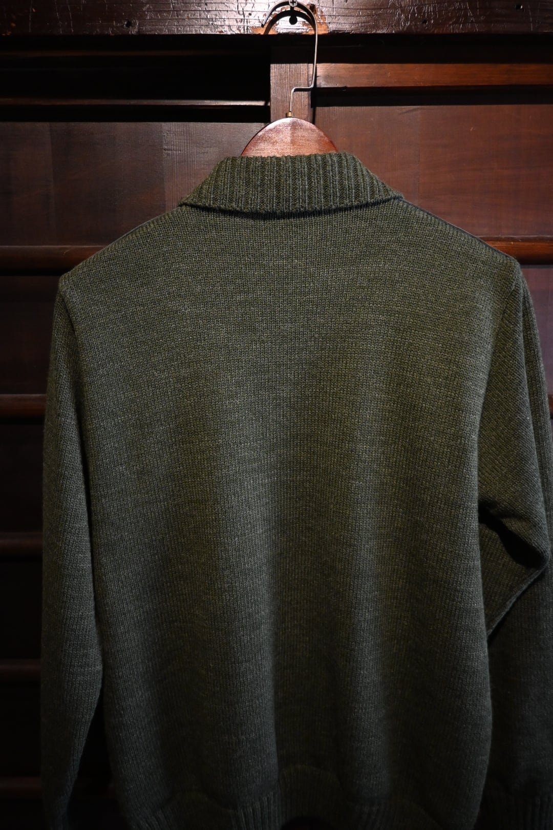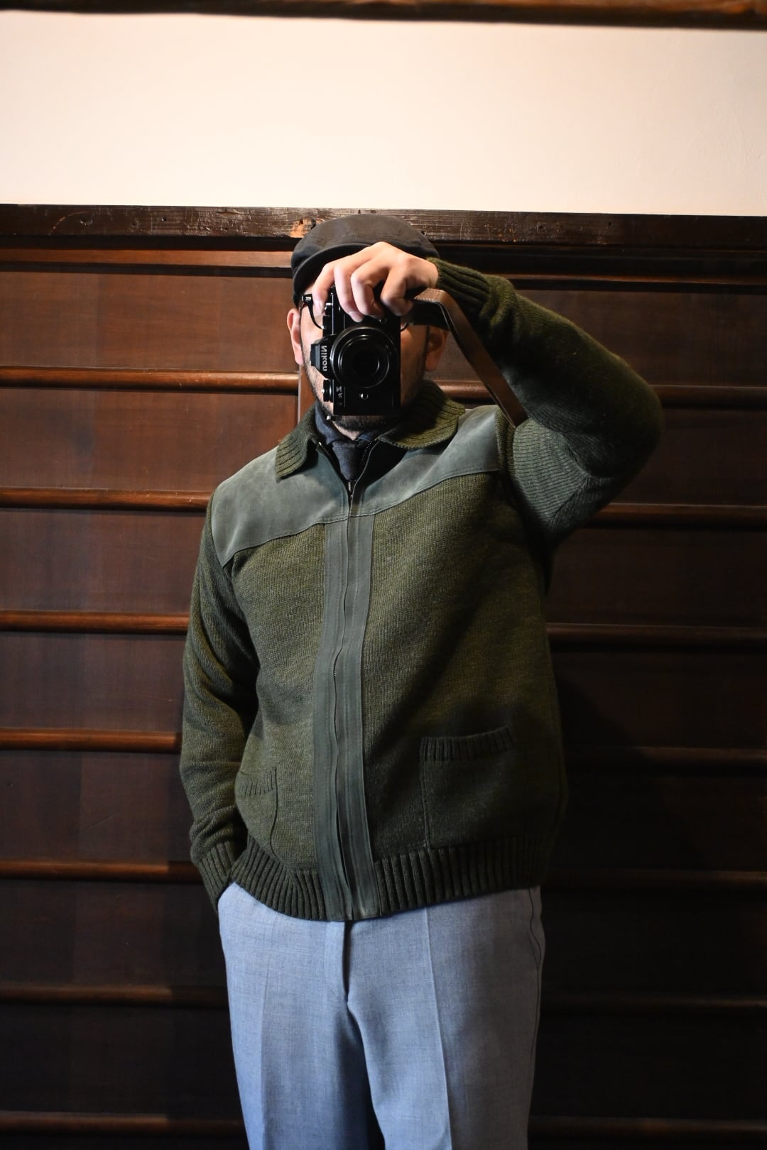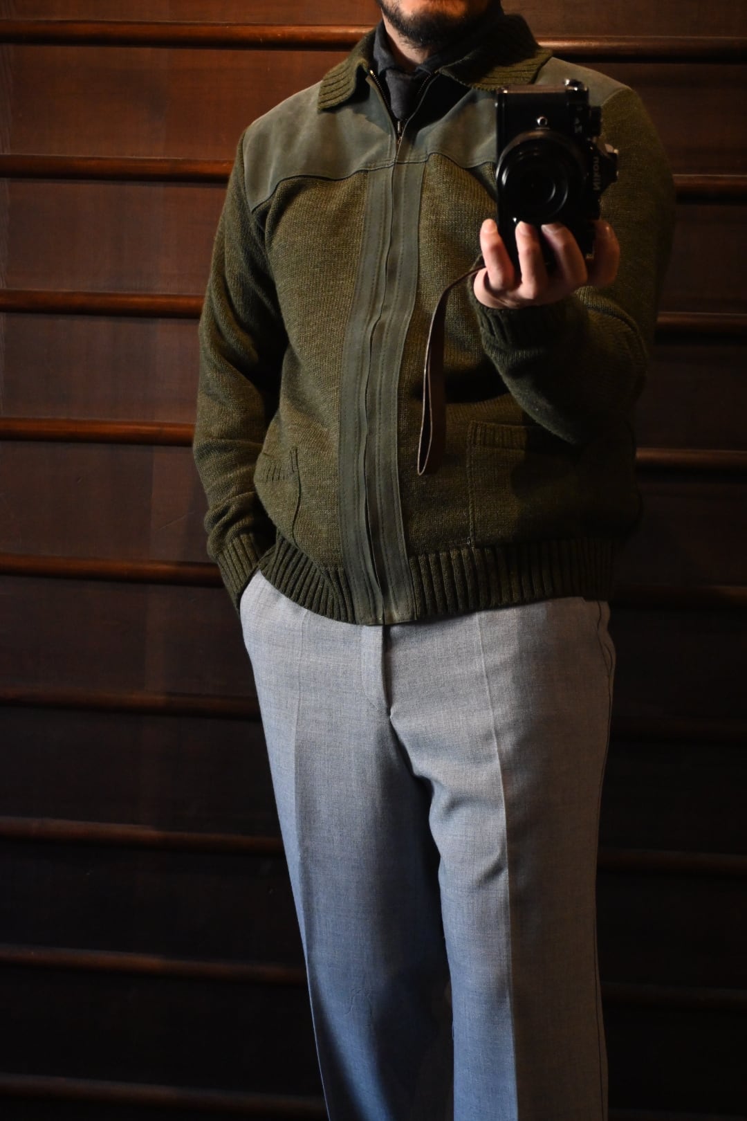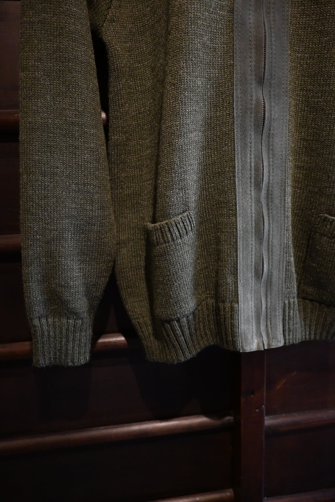 ダークグリーンを基調とした落ち着いたカラーリングに、フロント上部とジップライン部分にスエード調パネルを切り替えた、上品でクラシックなデザイン。ニット素材とのコンビネーションが雰囲気抜群の一着です。