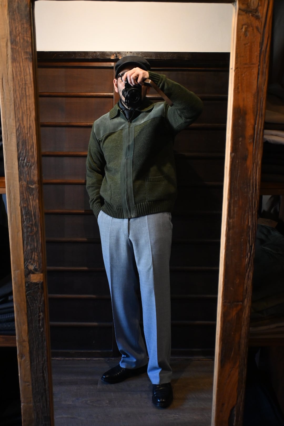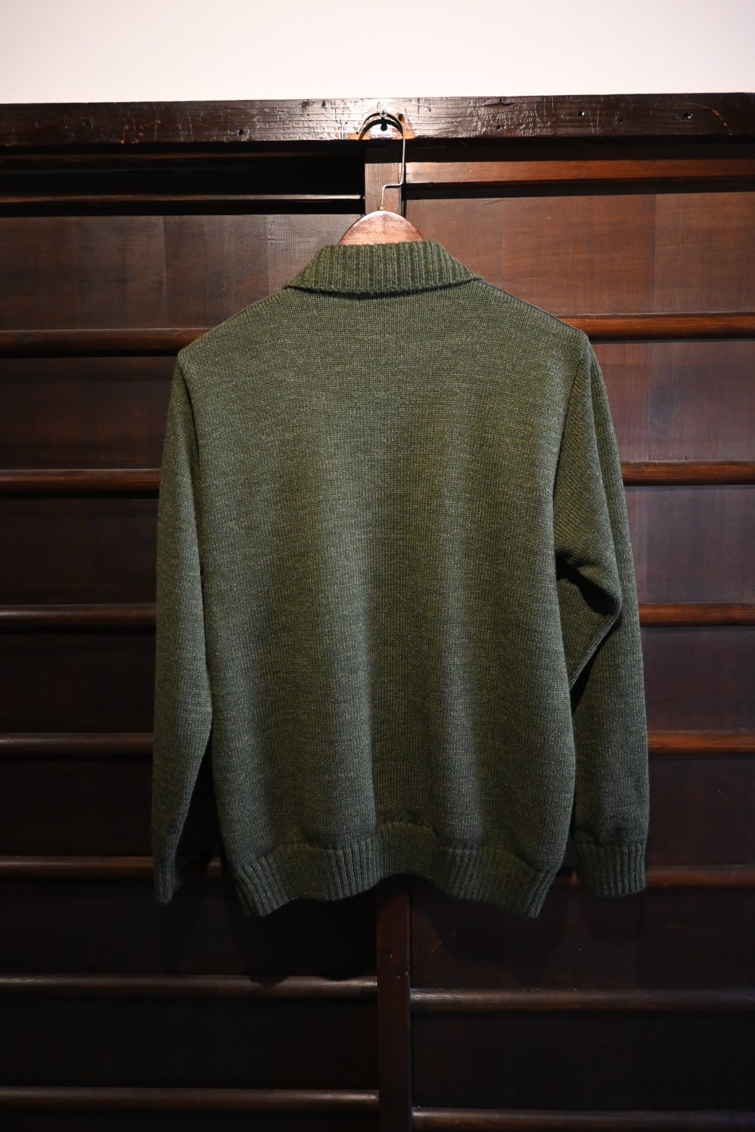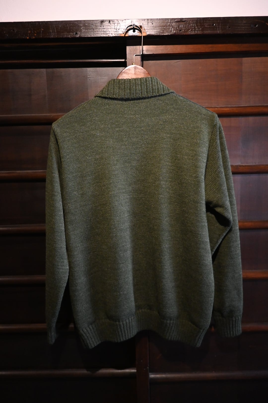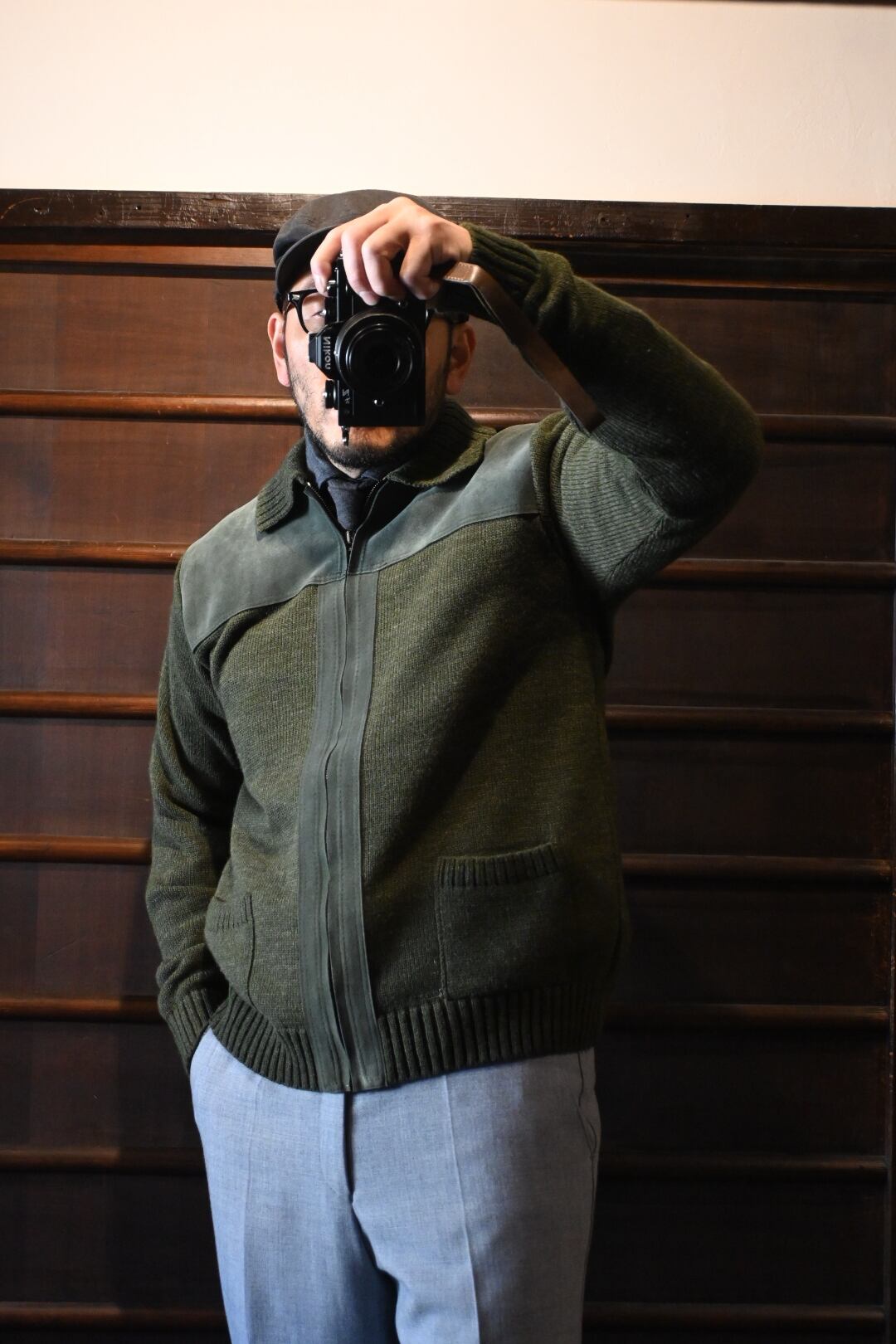 ダークグリーンを基調とした落ち着いたカラーリングに、フロント上部とジップライン部分にスエード調パネルを切り替えた、上品でクラシックなデザイン。ニット素材とのコンビネーションが雰囲気抜群の一着です。