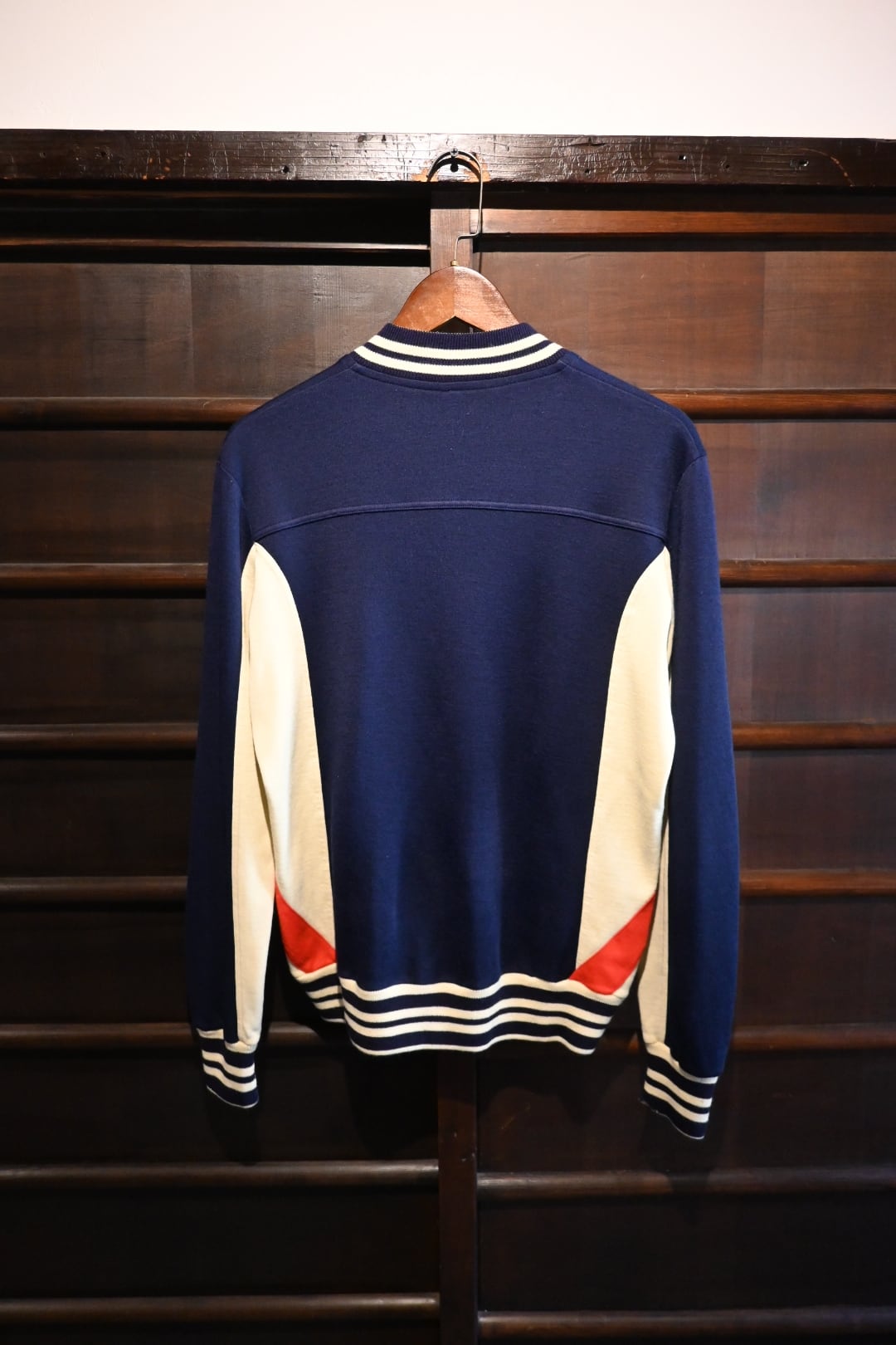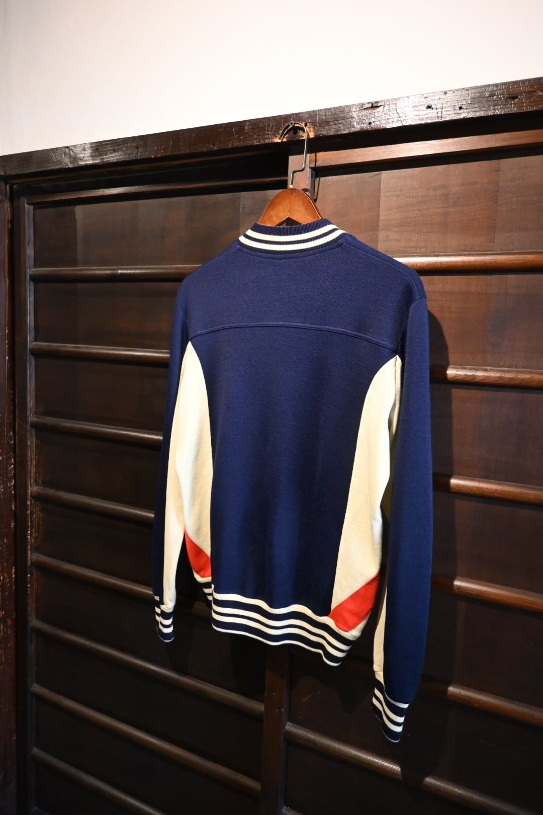 ネイビー×クリームを基調としたクラシックなカラーブロックデザインで、胸元にはFILAのワッペンロゴを配置。
