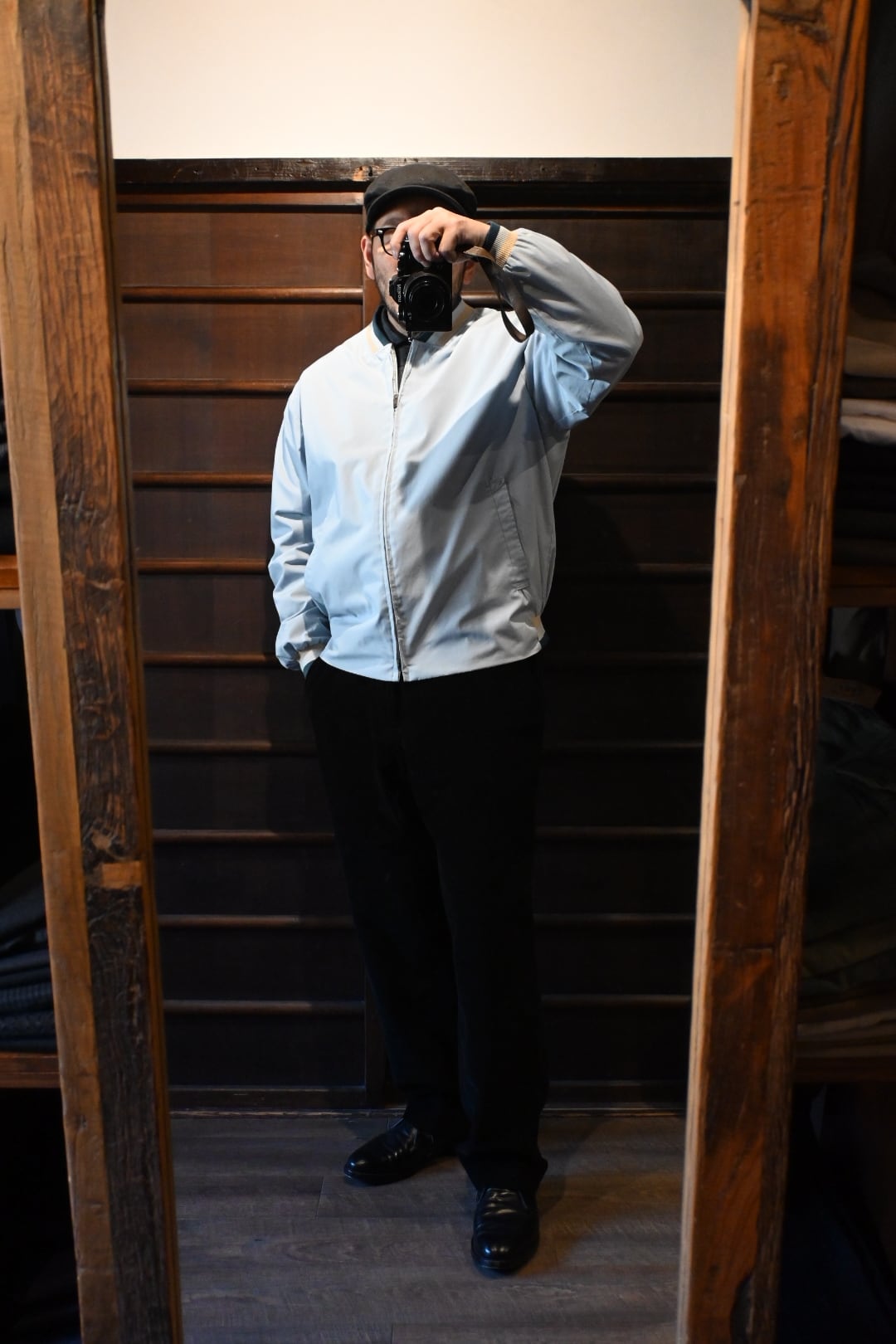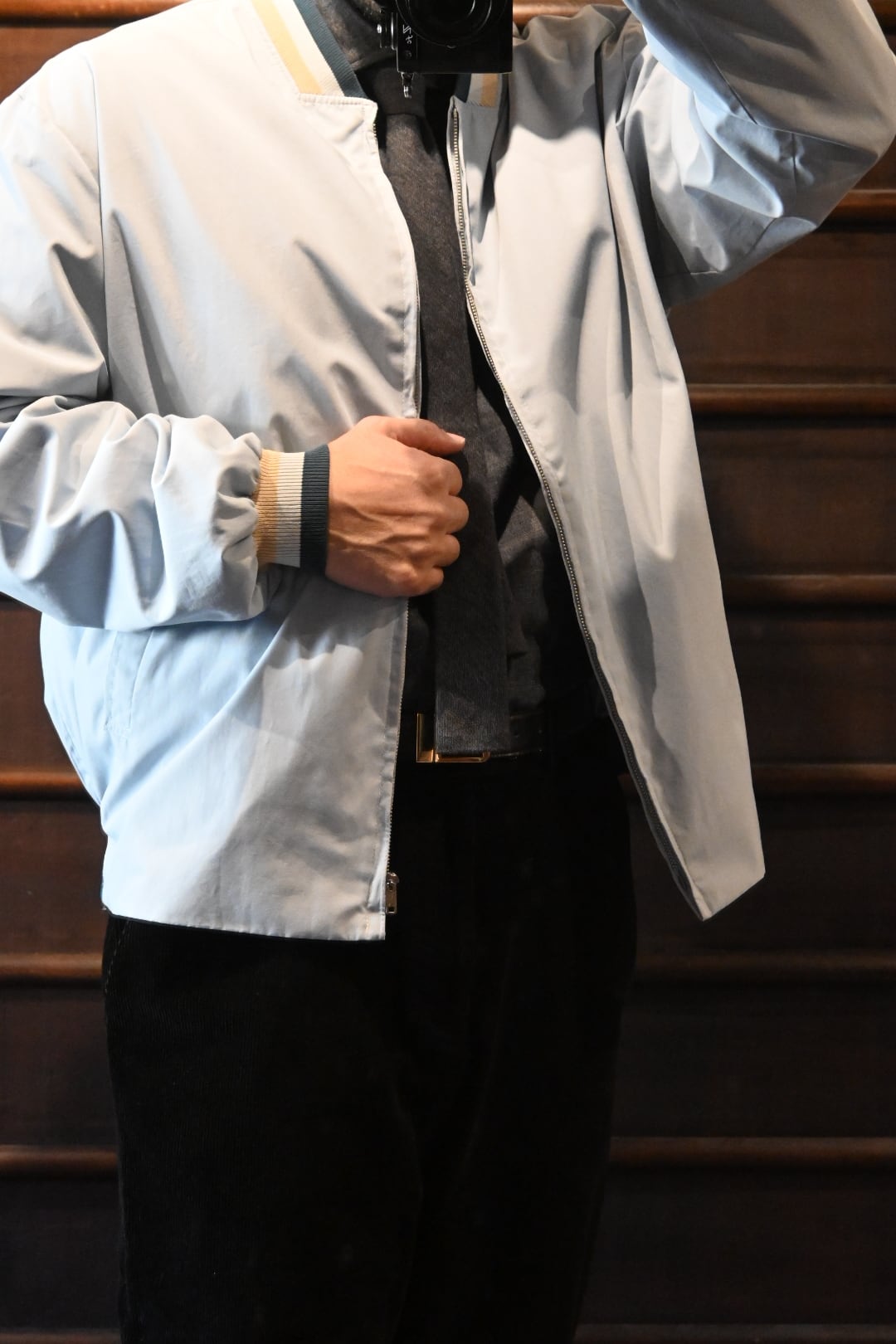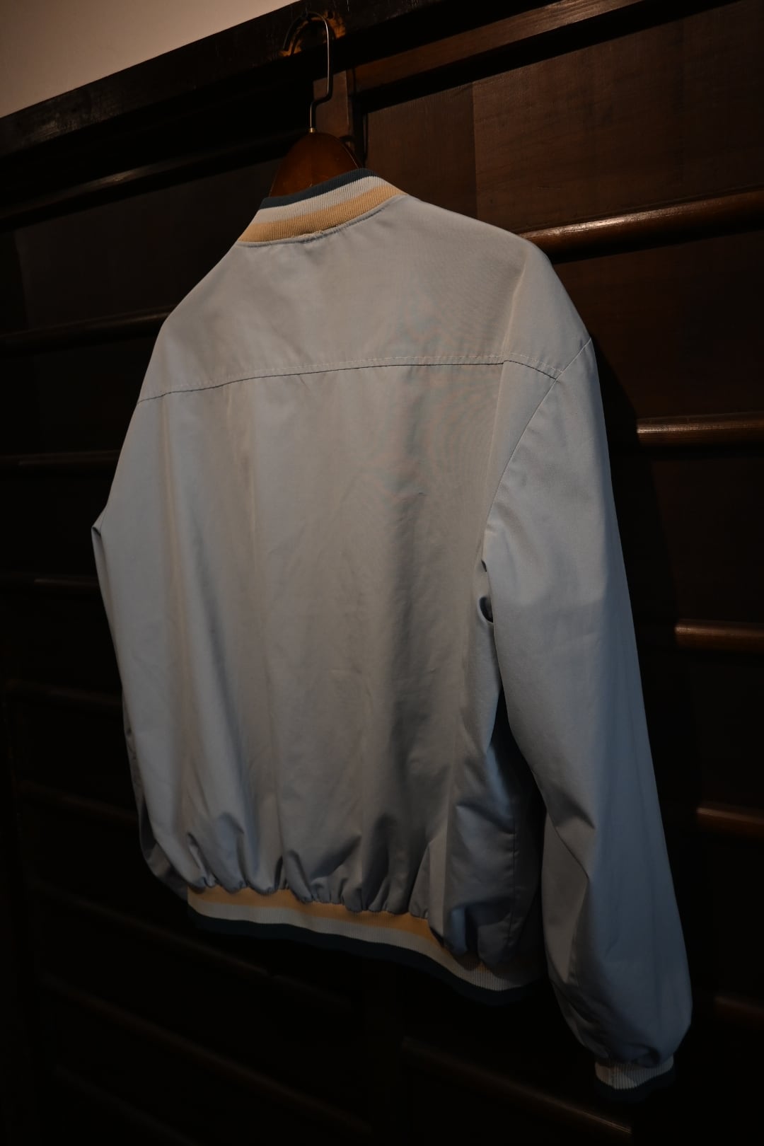 淡いライトブルーサックスブルー系のボディに、リブ仕様の襟・袖・裾が特徴的なクラシックなデザイン。