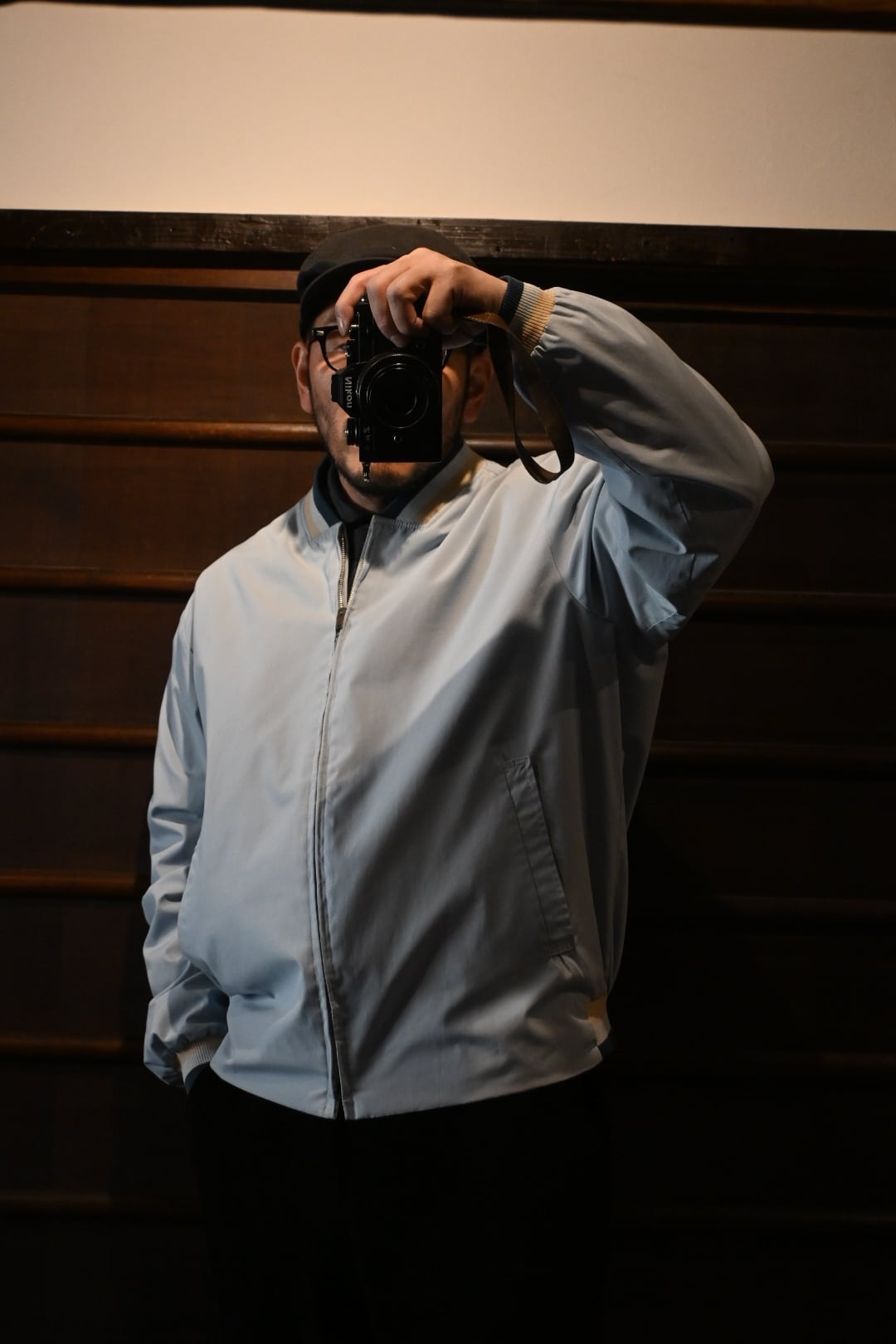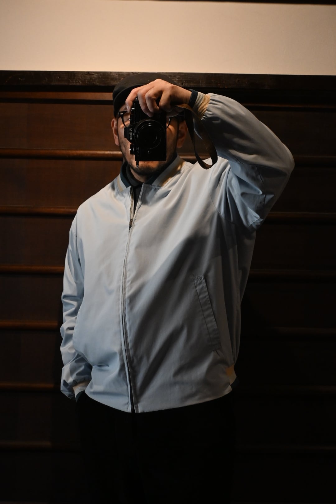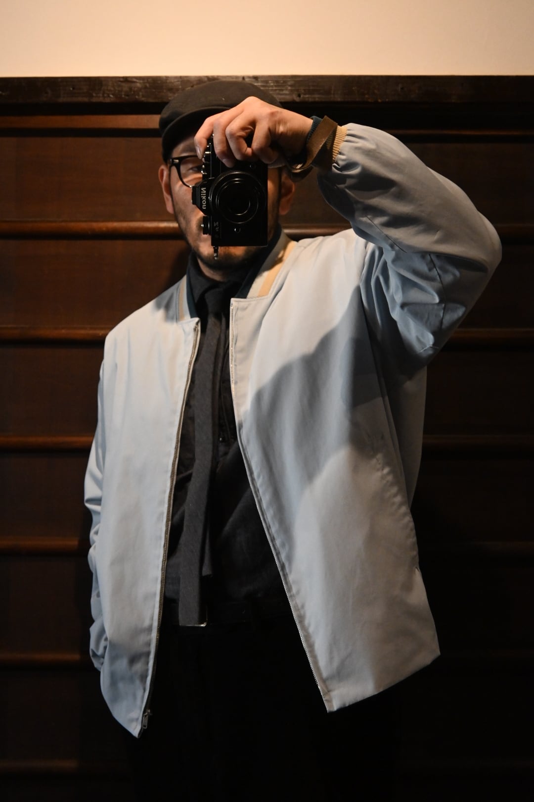 淡いライトブルーサックスブルー系のボディに、リブ仕様の襟・袖・裾が特徴的なクラシックなデザイン。