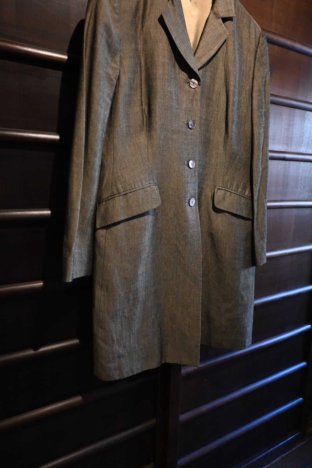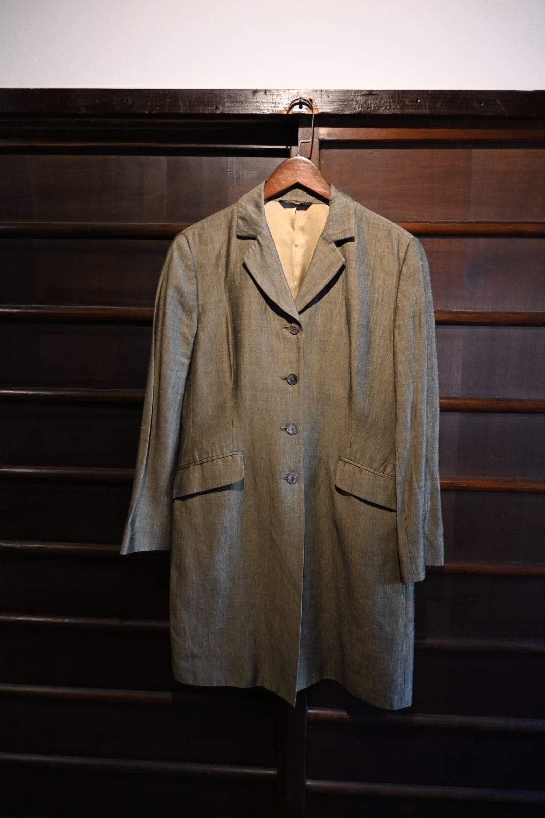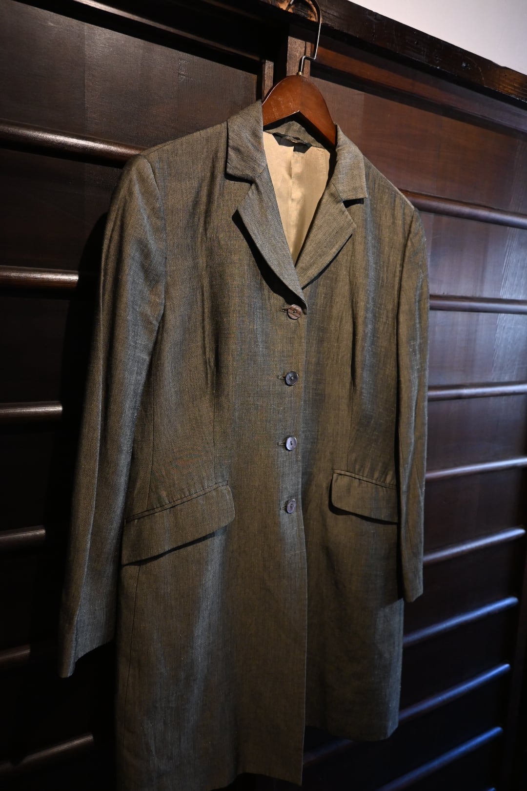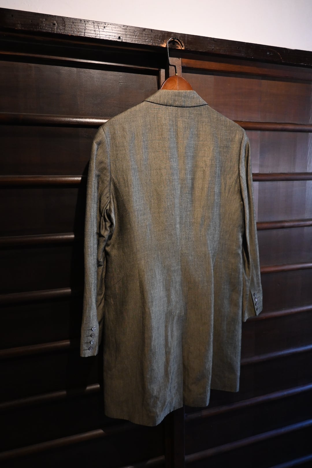 落ち着いたオリーブ系カラーの上品な生地を使用したクラシックな一着。