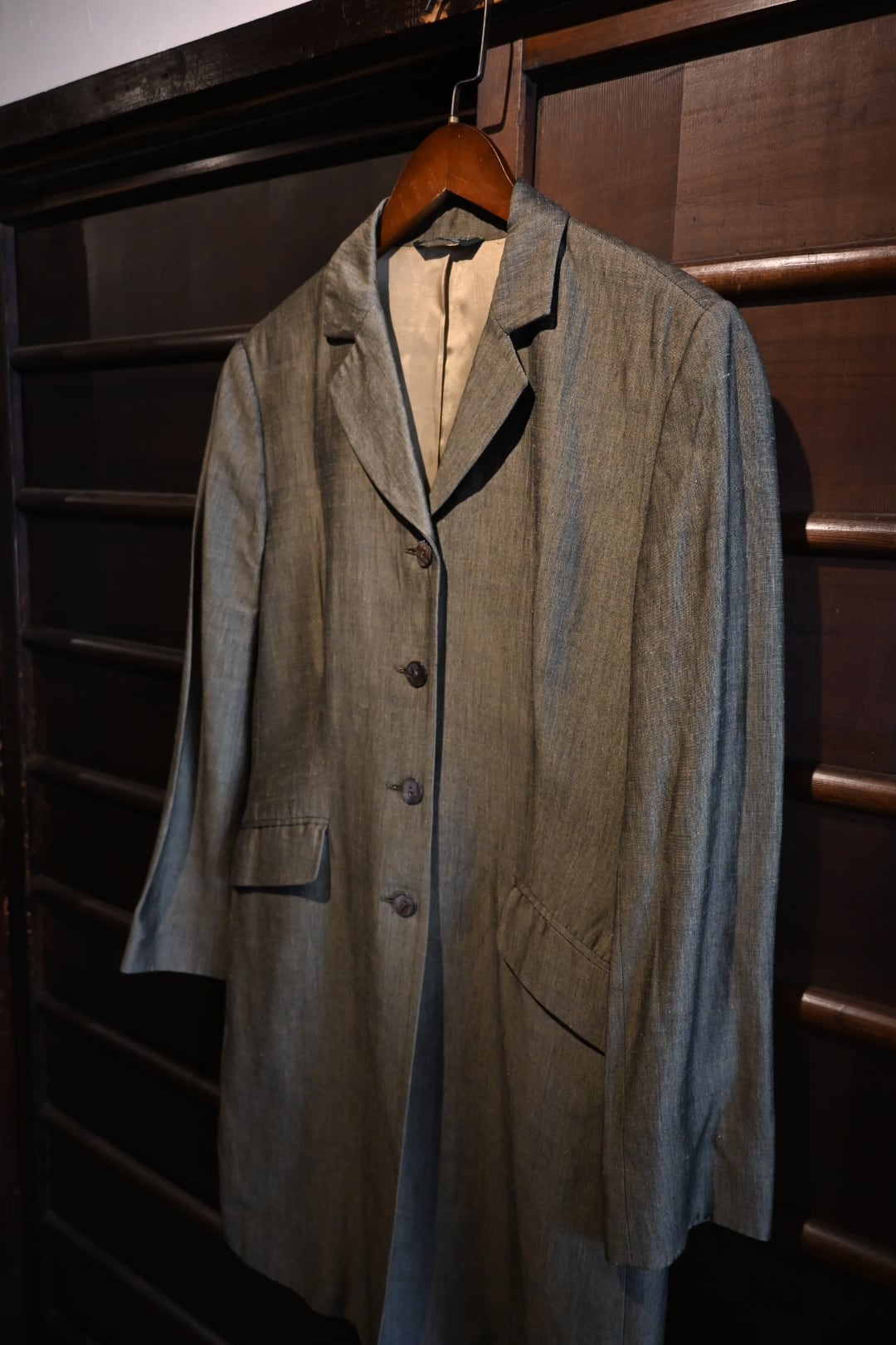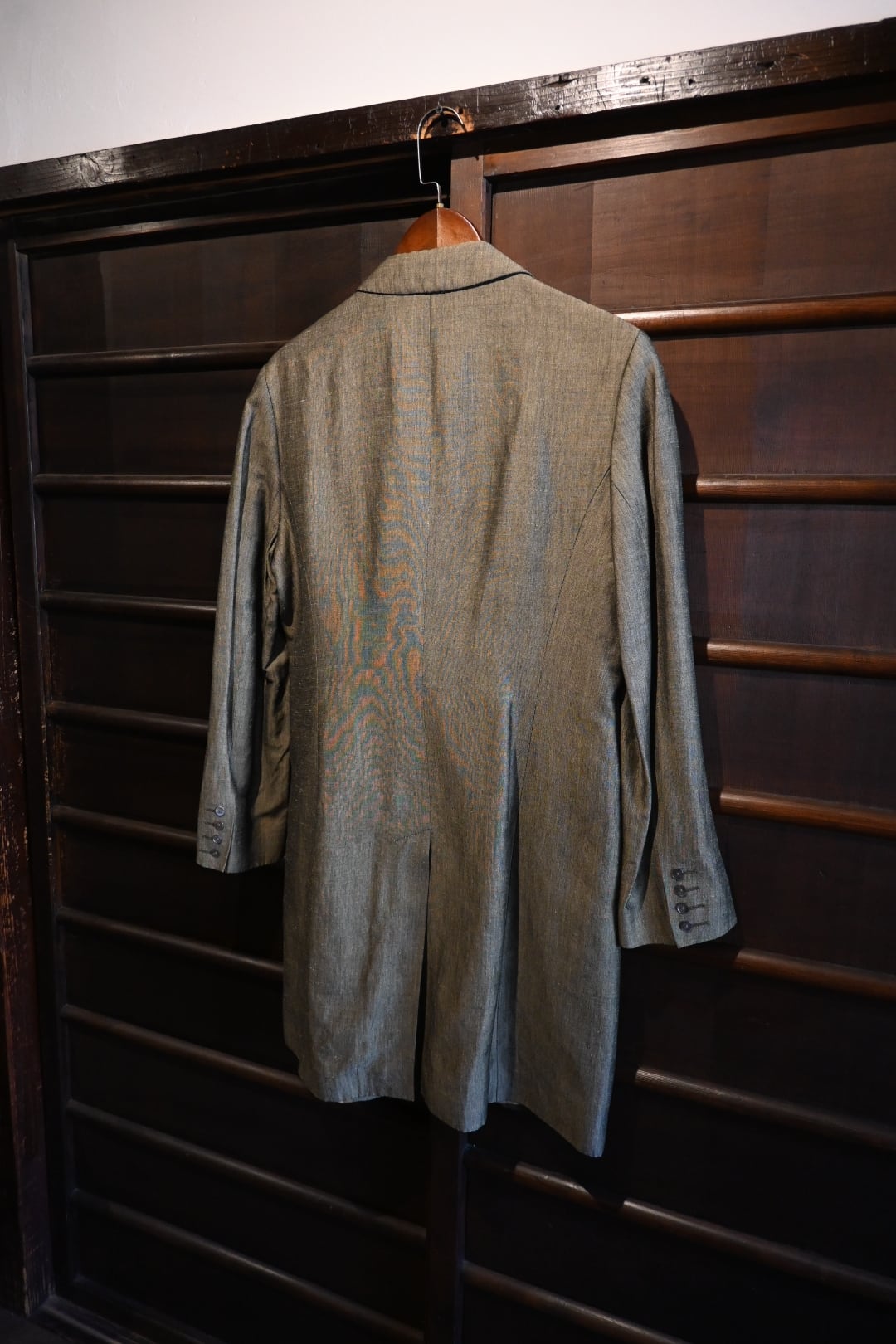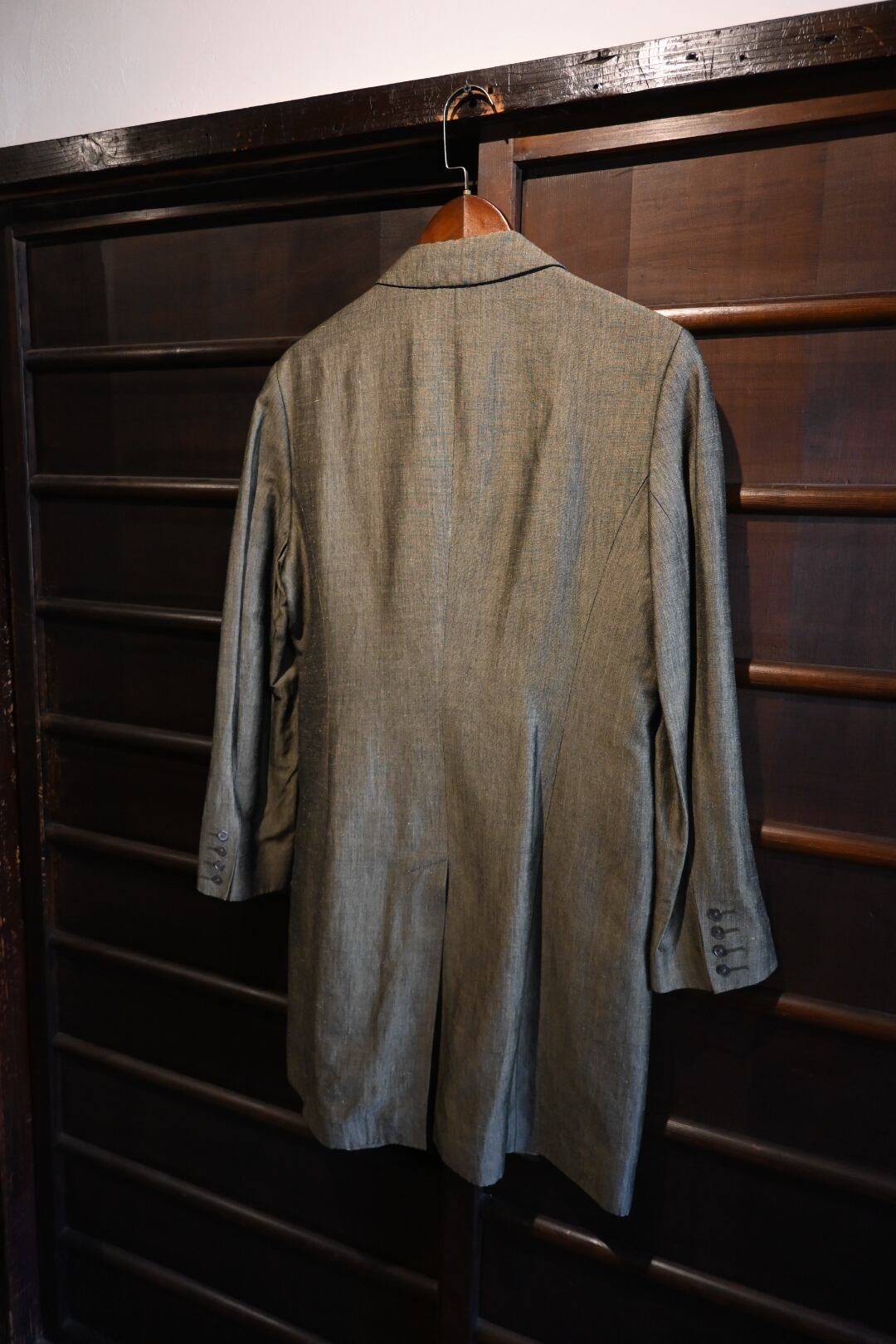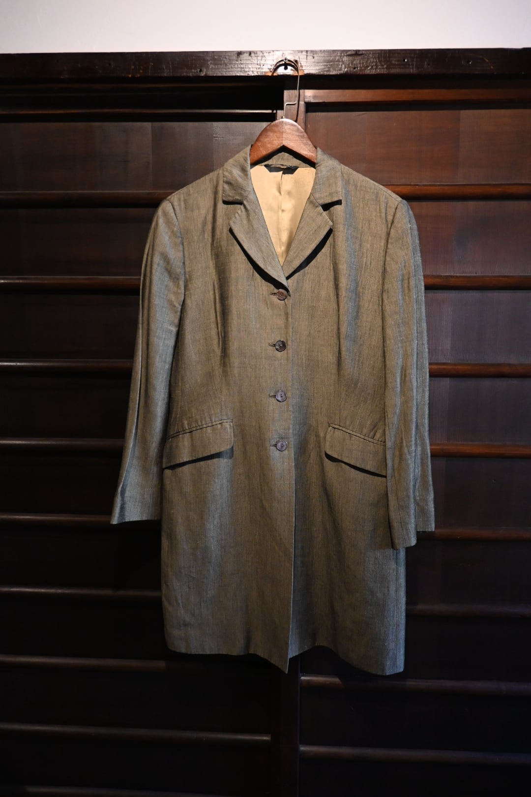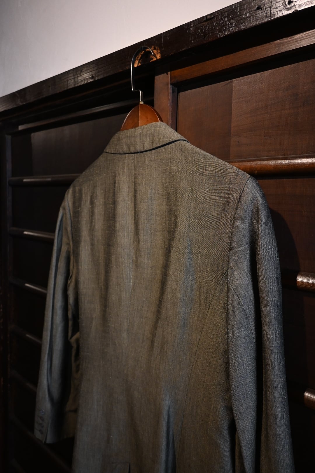 落ち着いたオリーブ系カラーの上品な生地を使用したクラシックな一着。