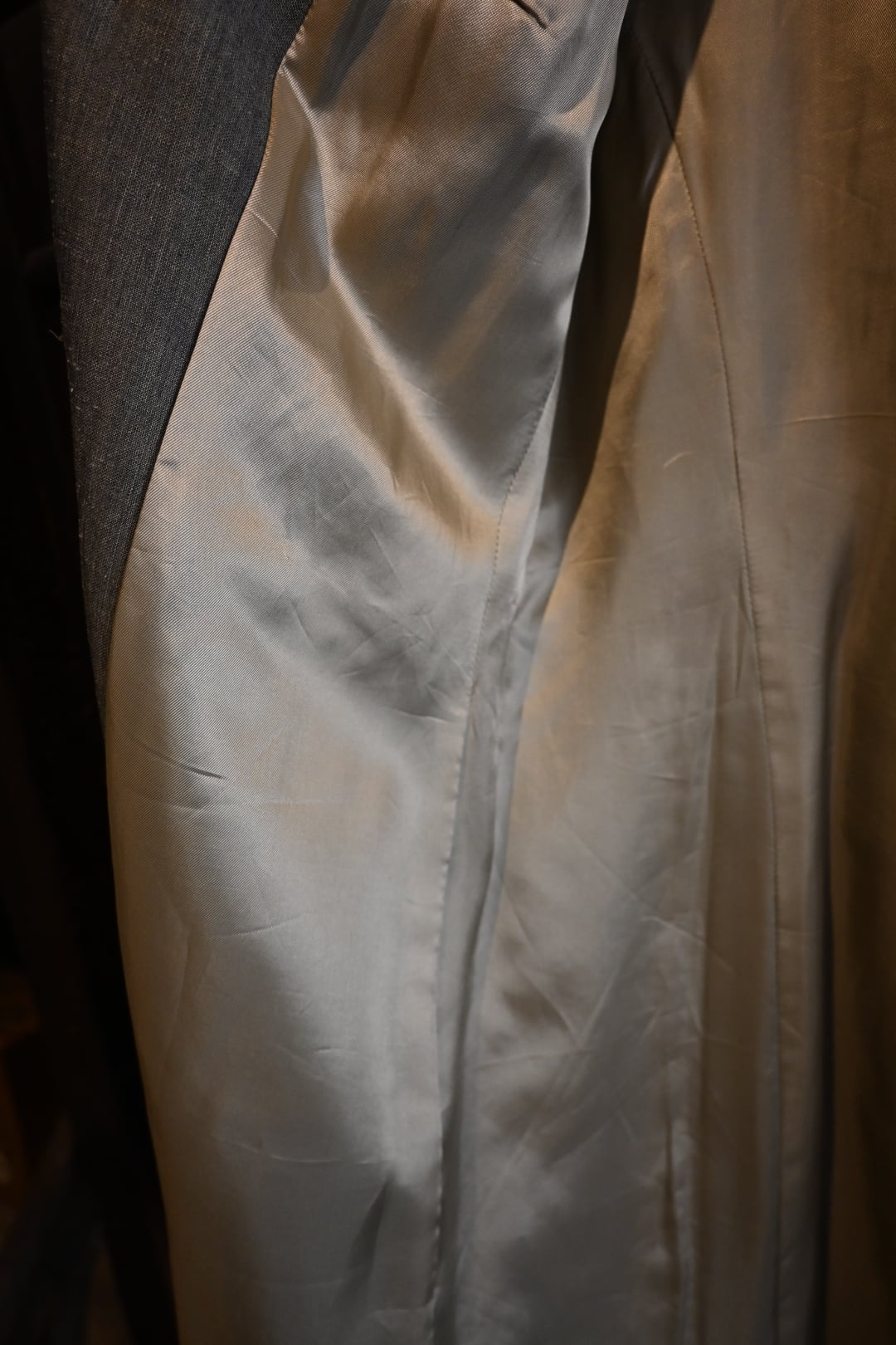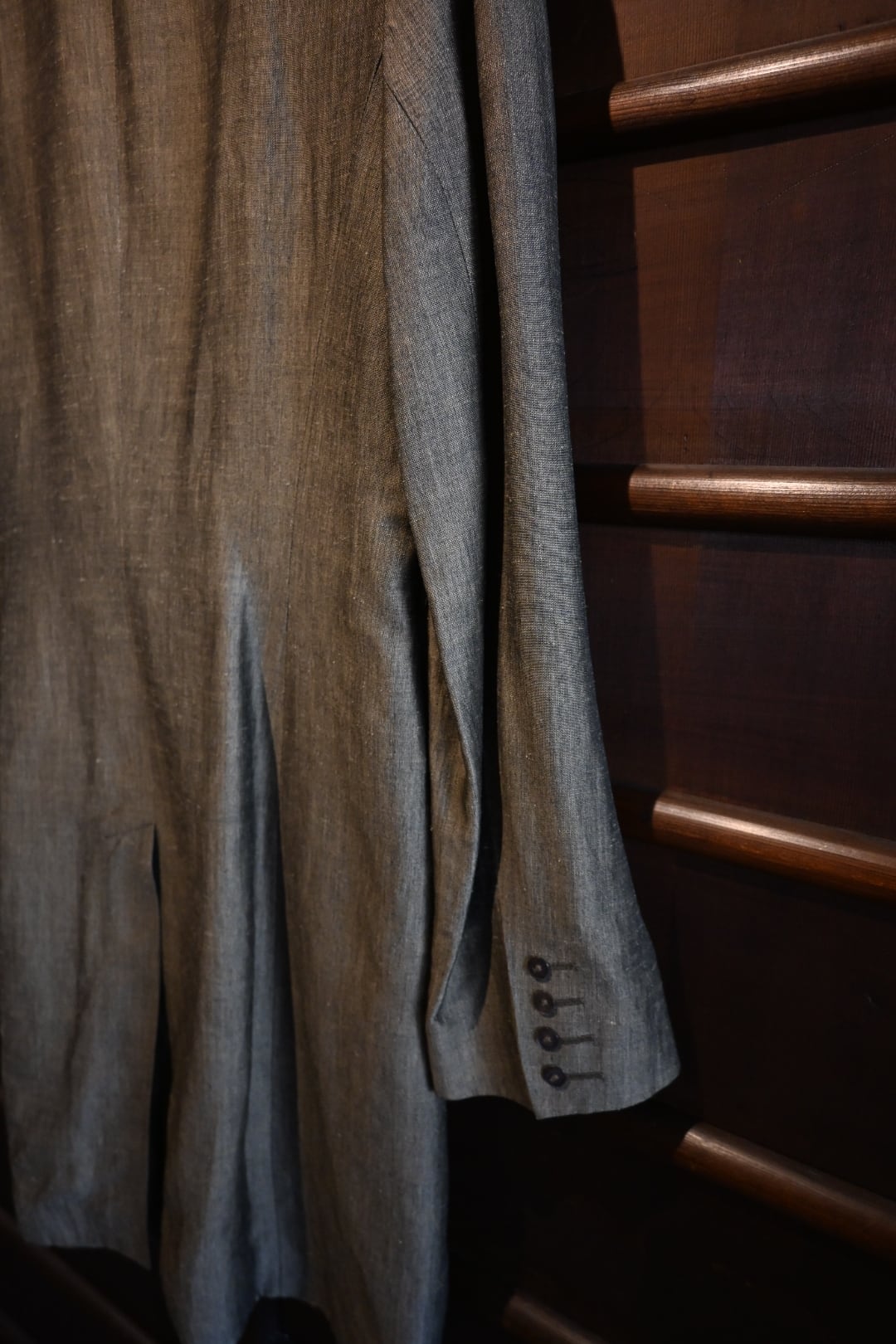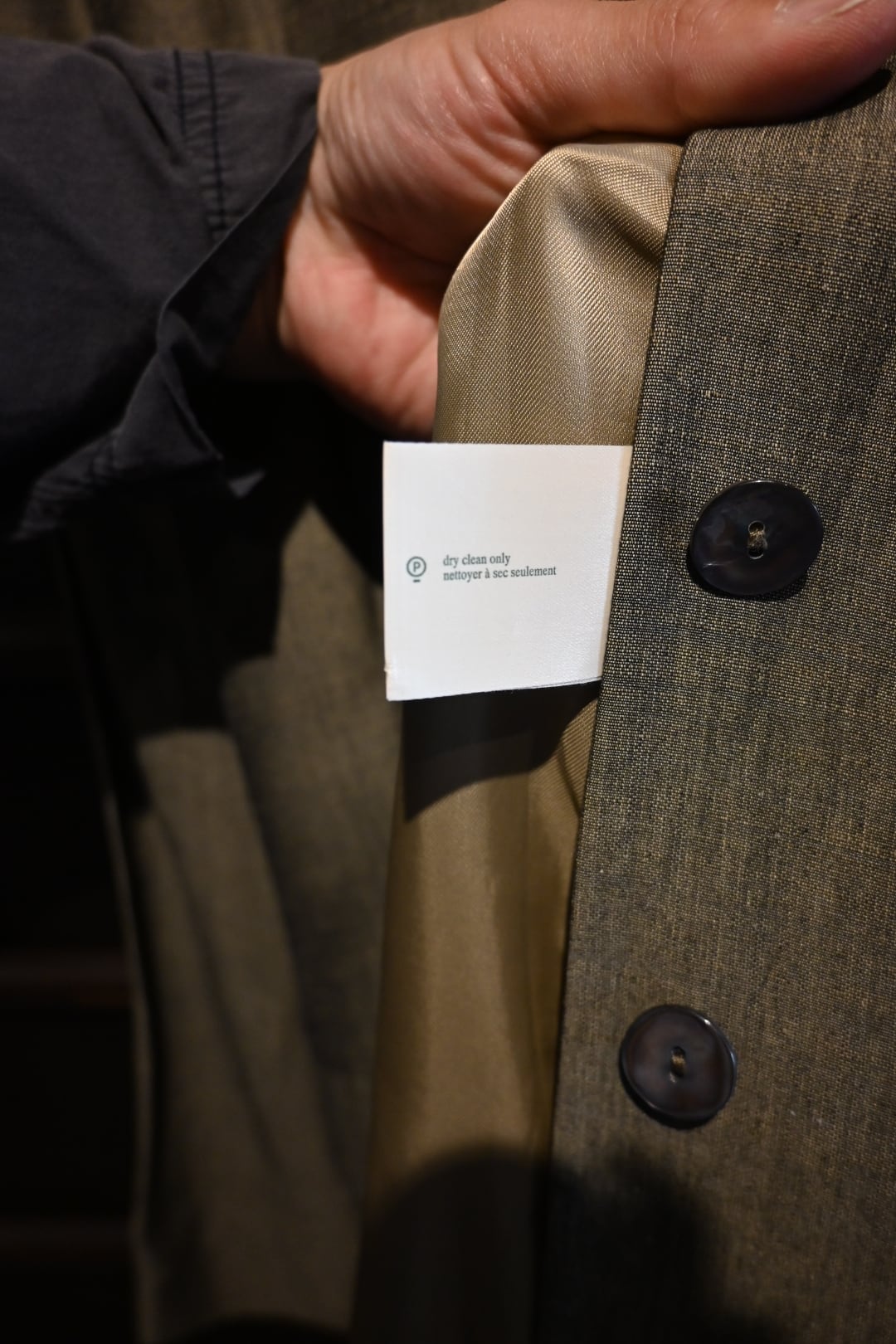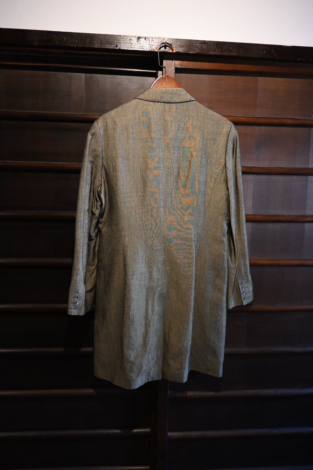 落ち着いたオリーブ系カラーの上品な生地を使用したクラシックな一着。