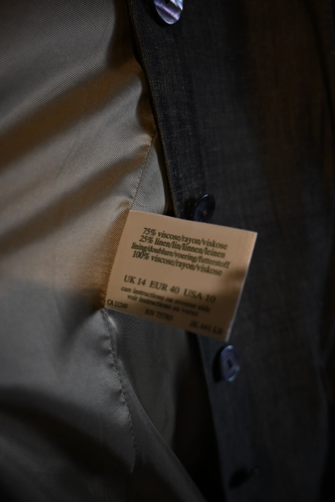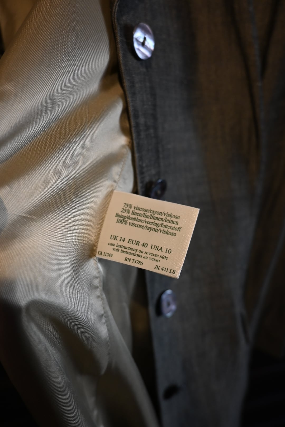 裏地はビスコース100%で滑りがよく、春や秋の軽いアウターとして活躍しますよ。