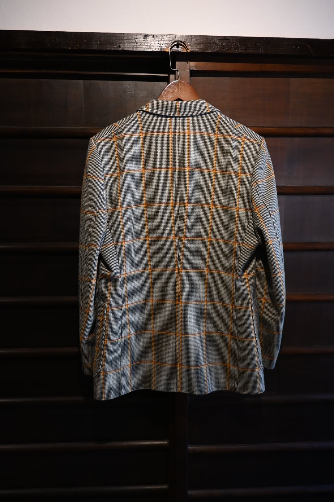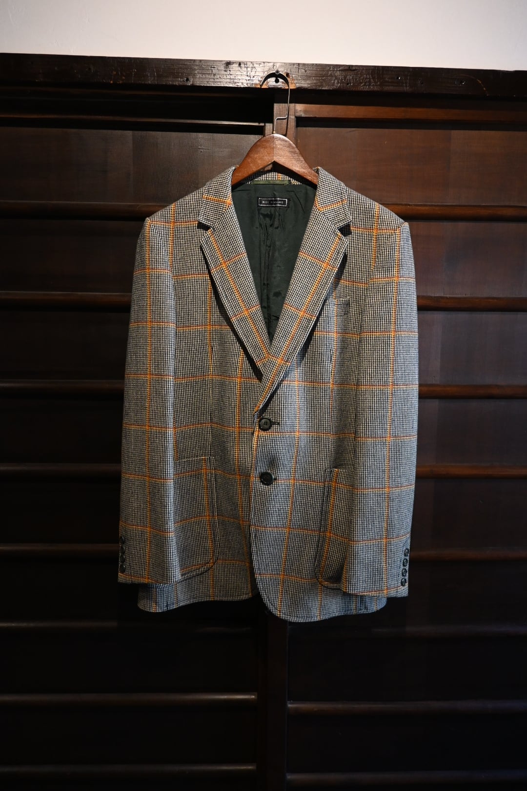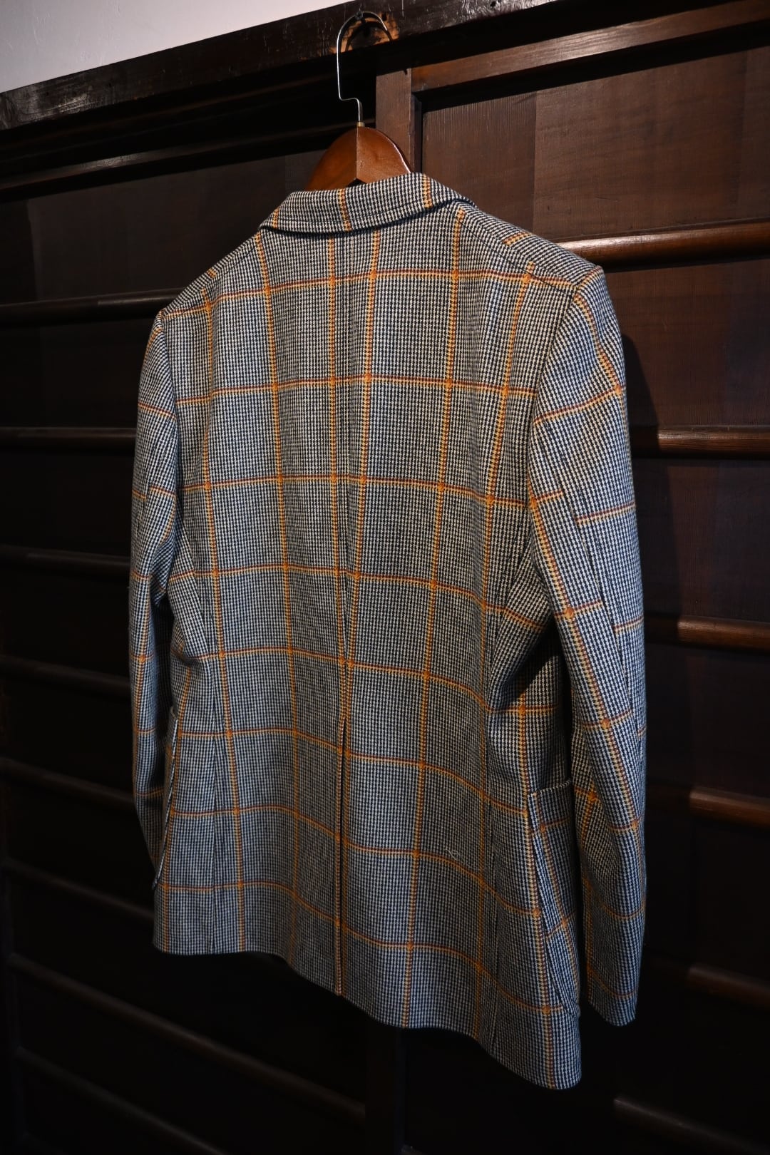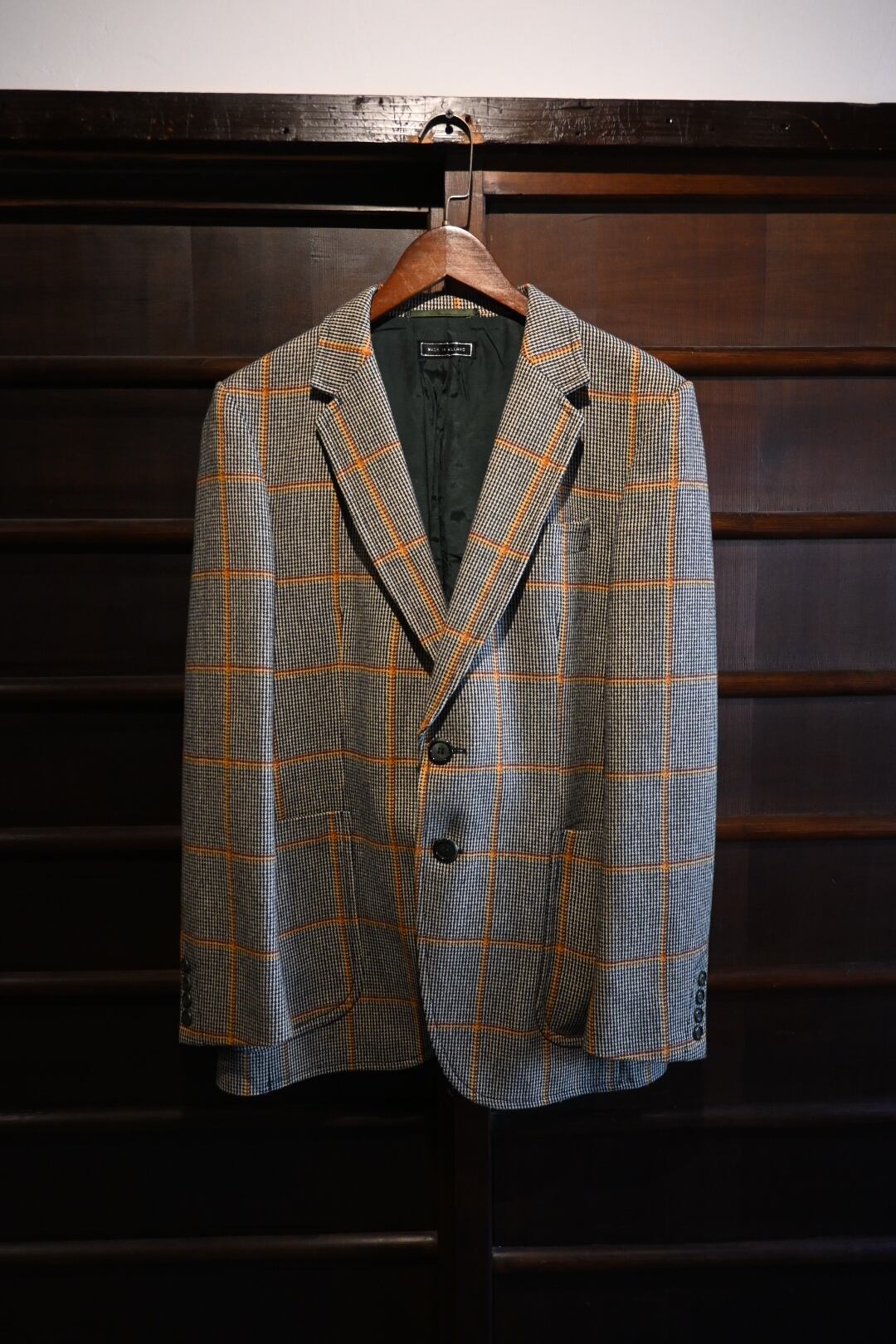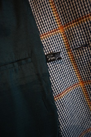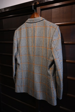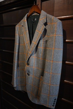クラシックなハウンドトゥースベースにオレンジのウィンドウペーンチェックが入った英国調デザインで、落ち着いた雰囲気の中にも存在感のある一着です。