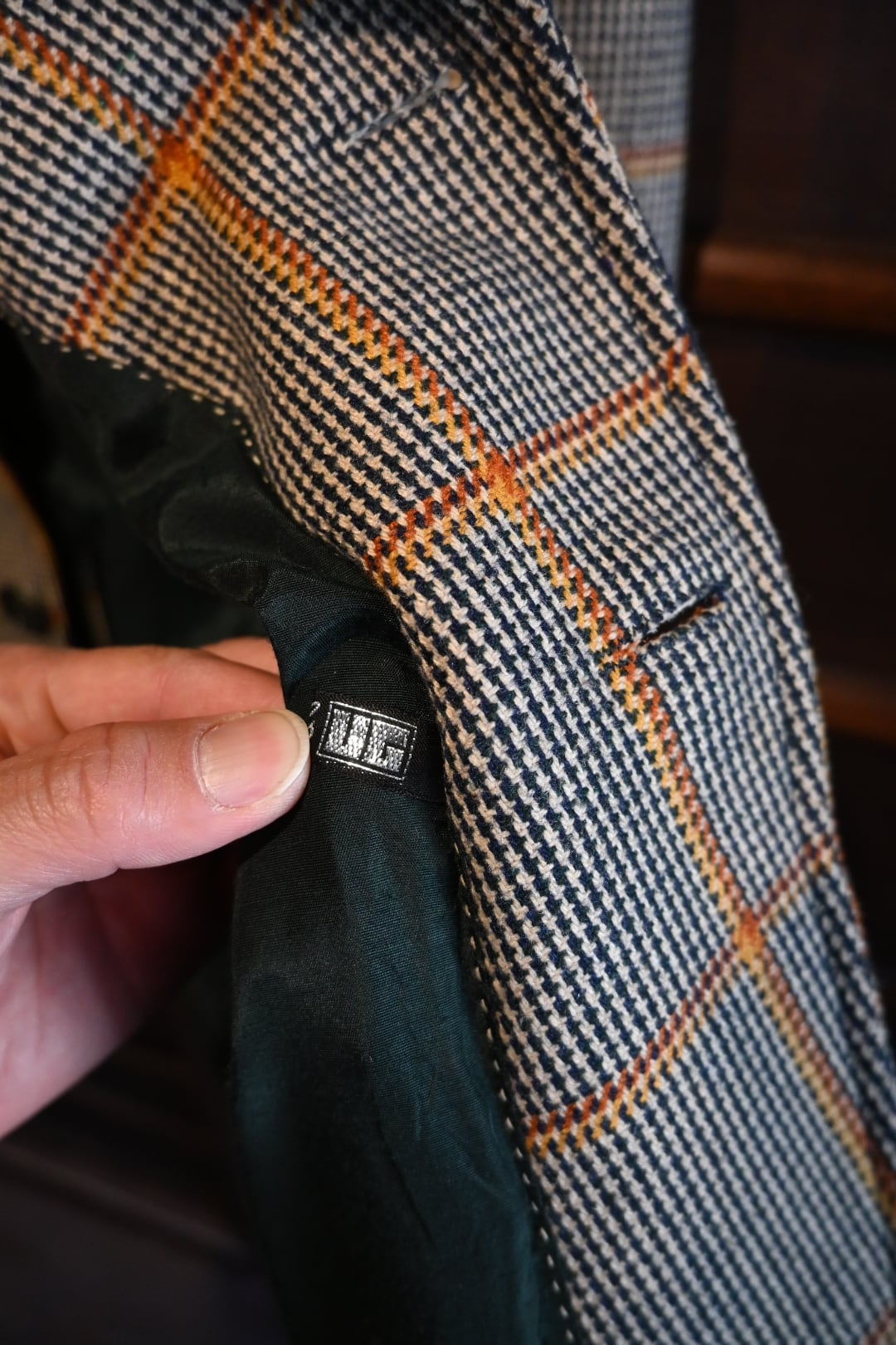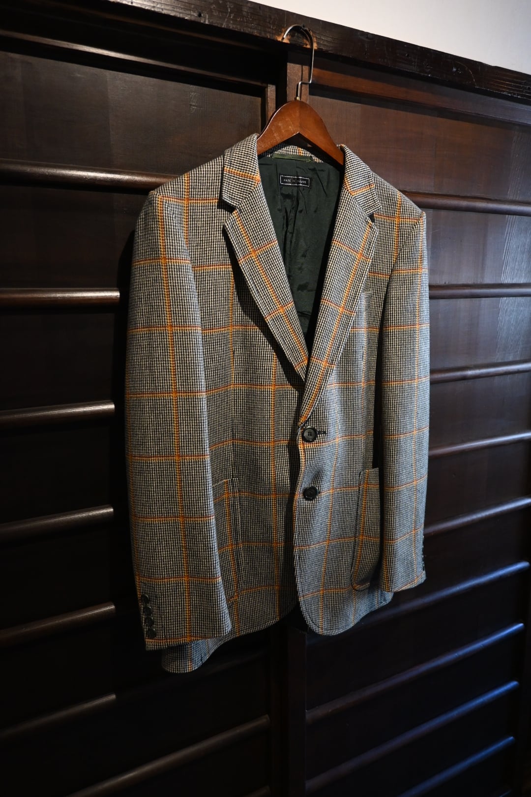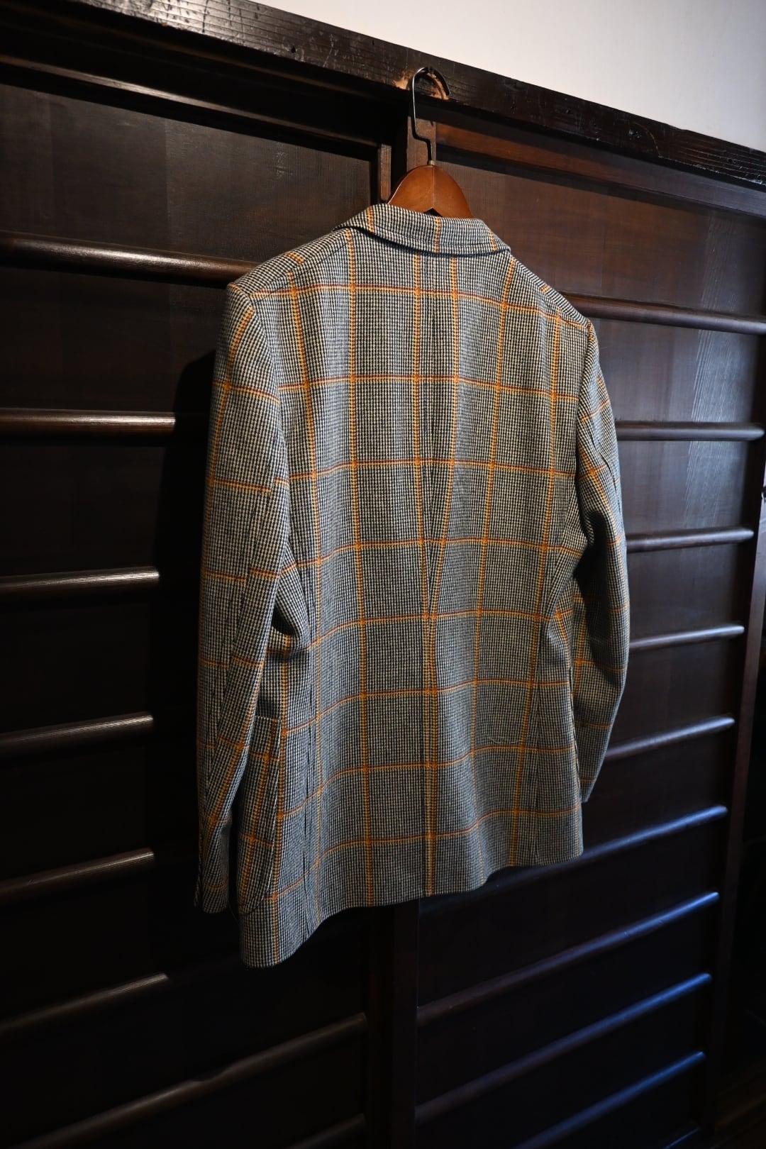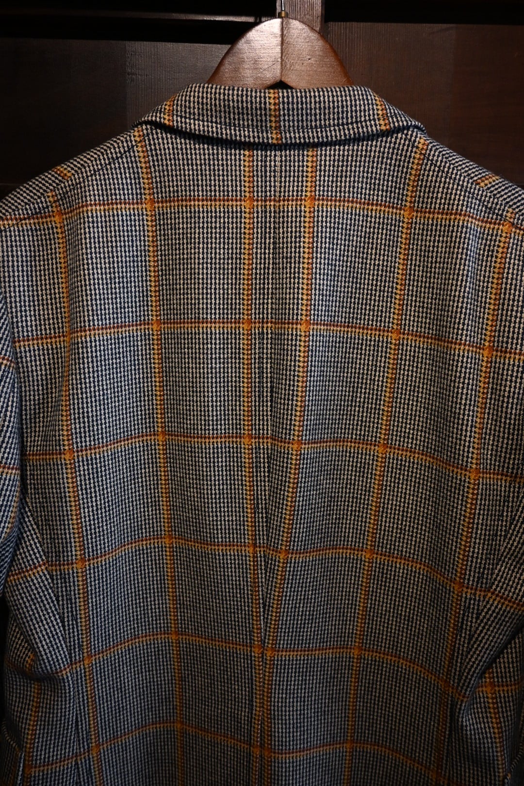 クラシックなハウンドトゥースベースにオレンジのウィンドウペーンチェックが入った英国調デザインで、落ち着いた雰囲気の中にも存在感のある一着です。