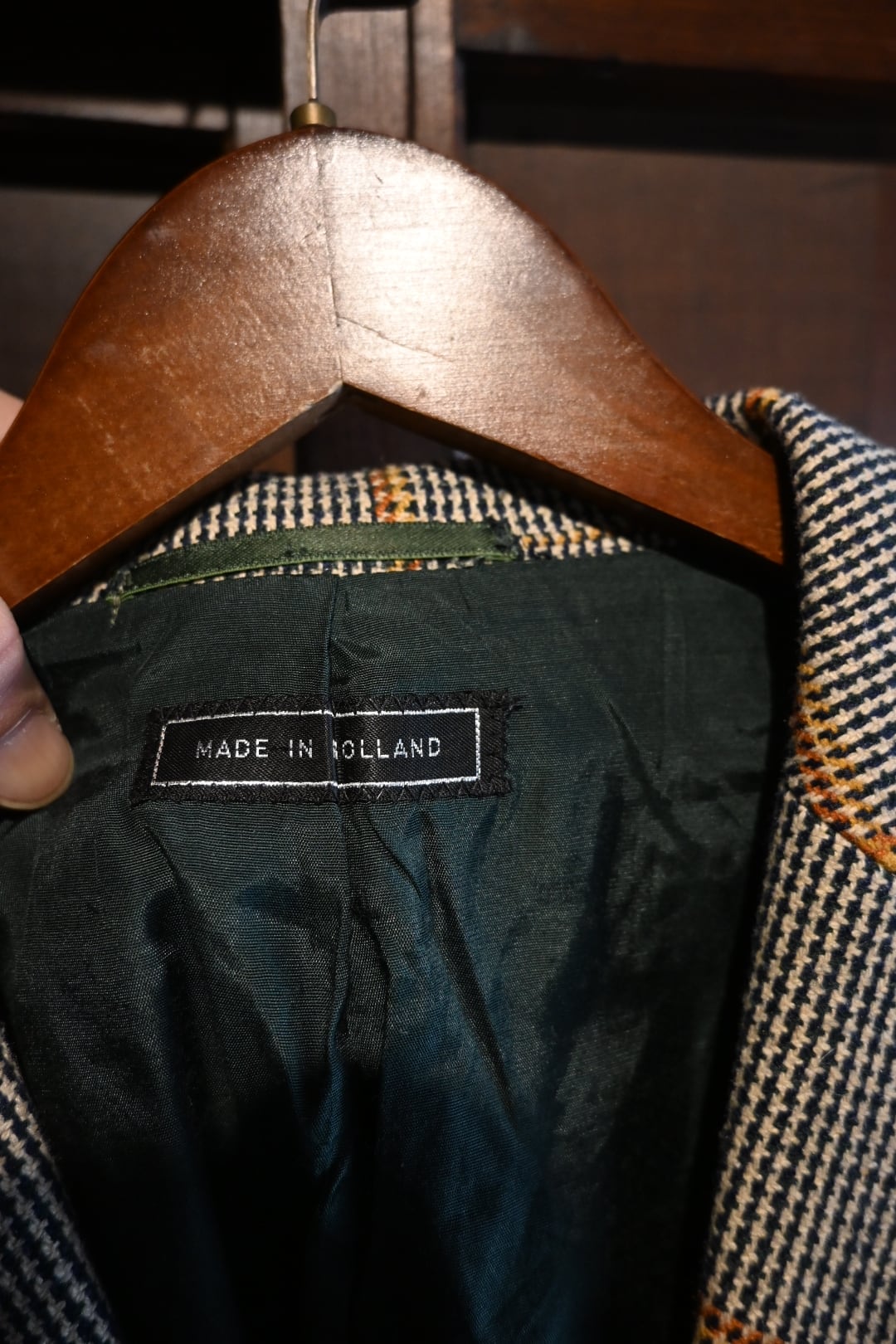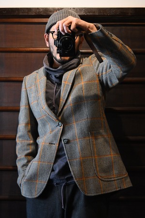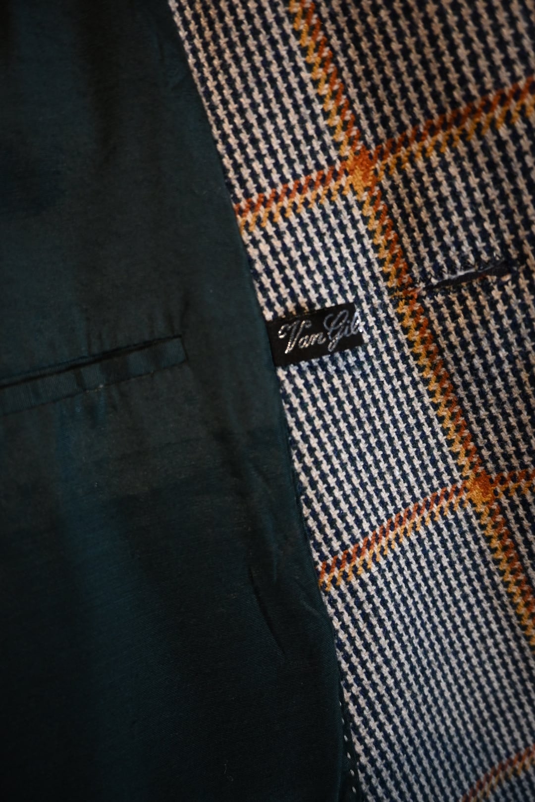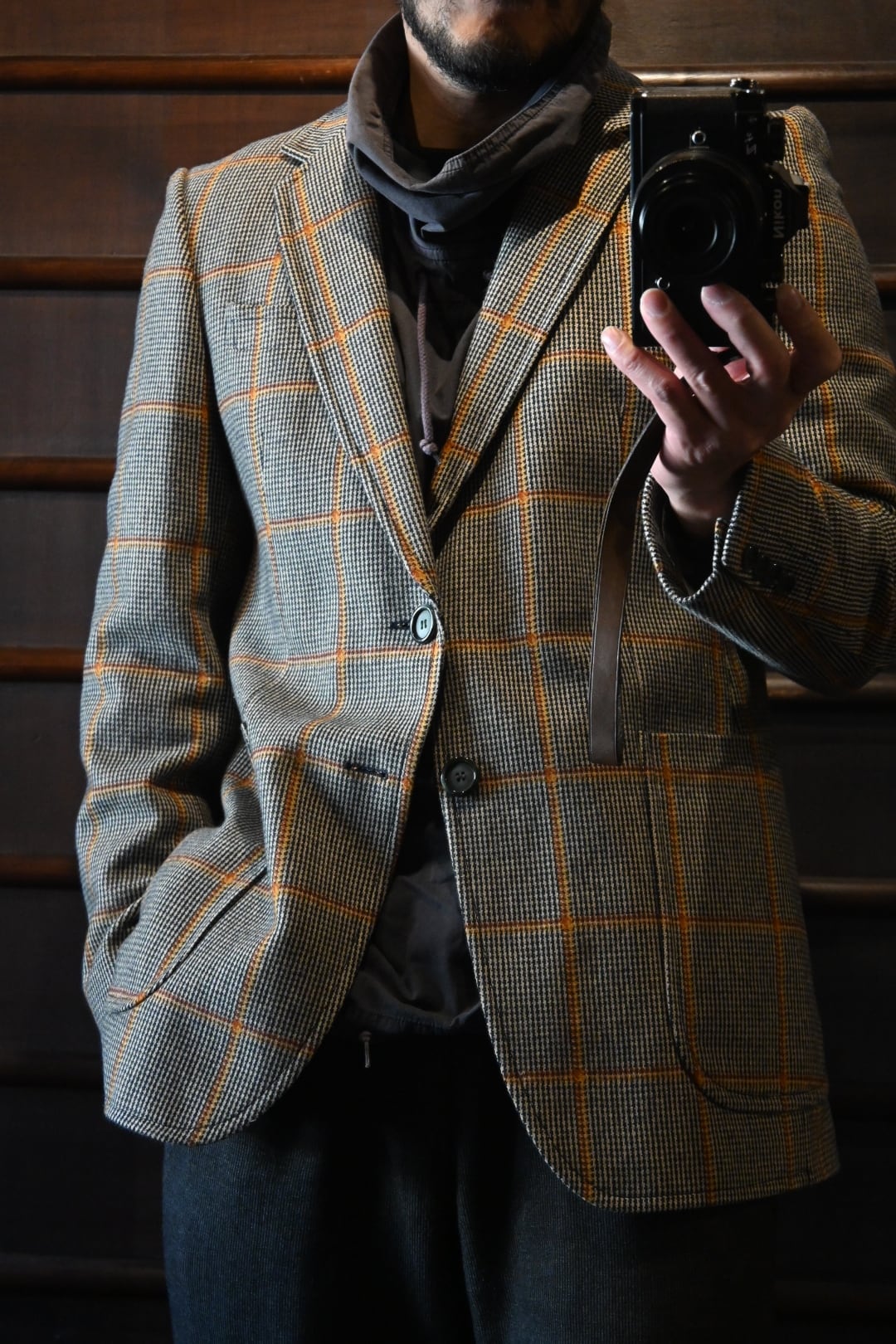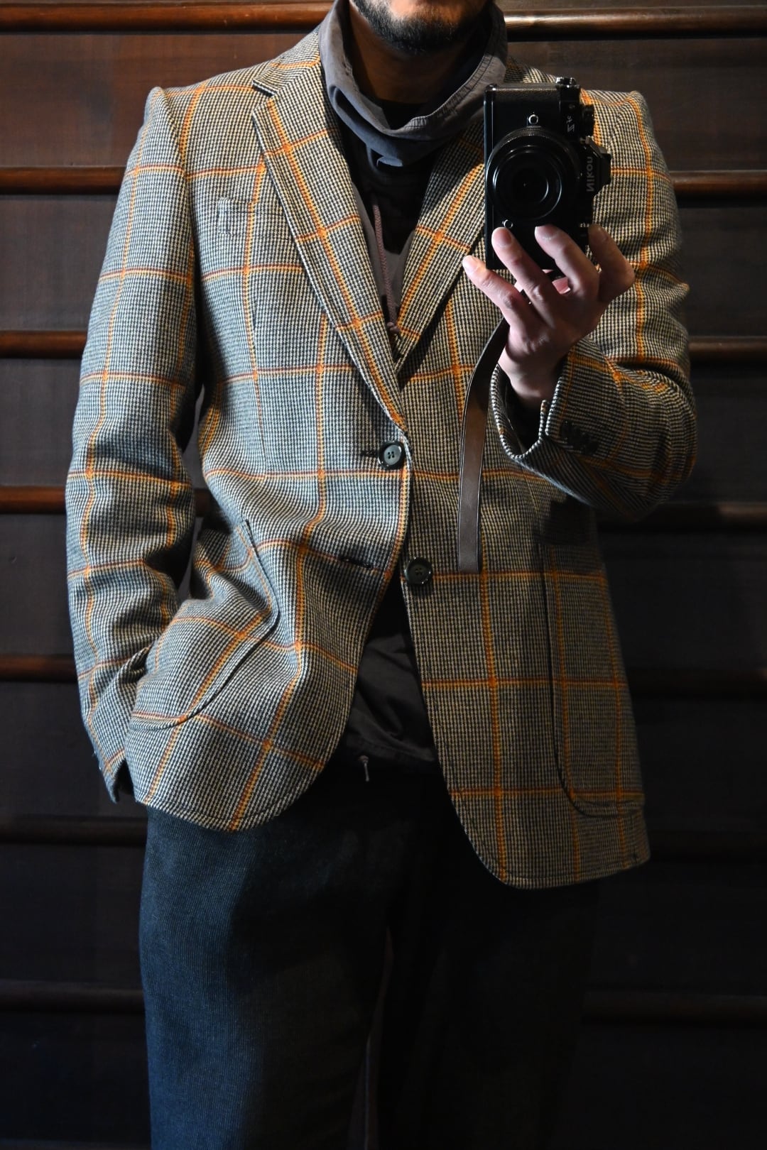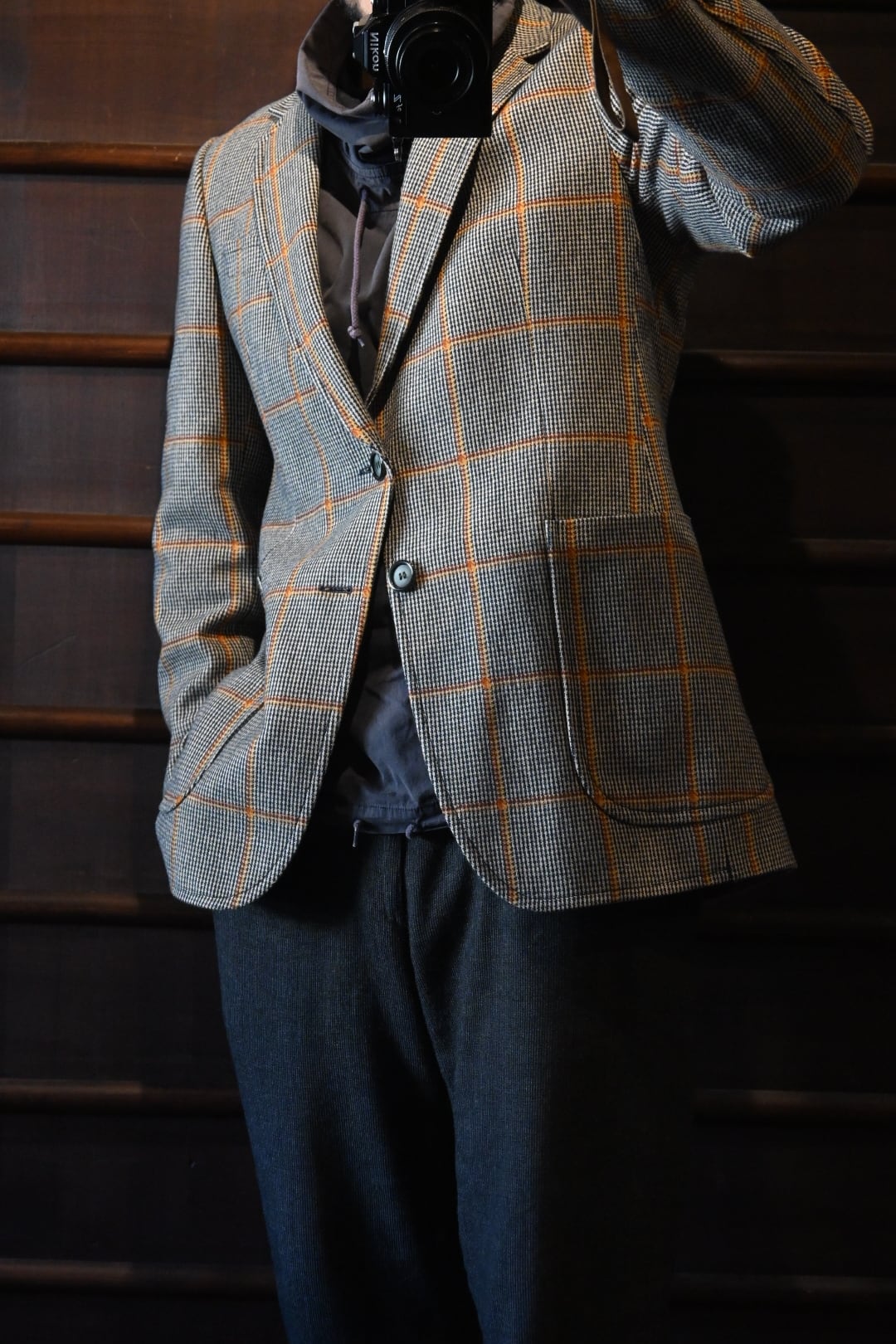 クラシックなハウンドトゥースベースにオレンジのウィンドウペーンチェックが入った英国調デザインで、落ち着いた雰囲気の中にも存在感のある一着です。