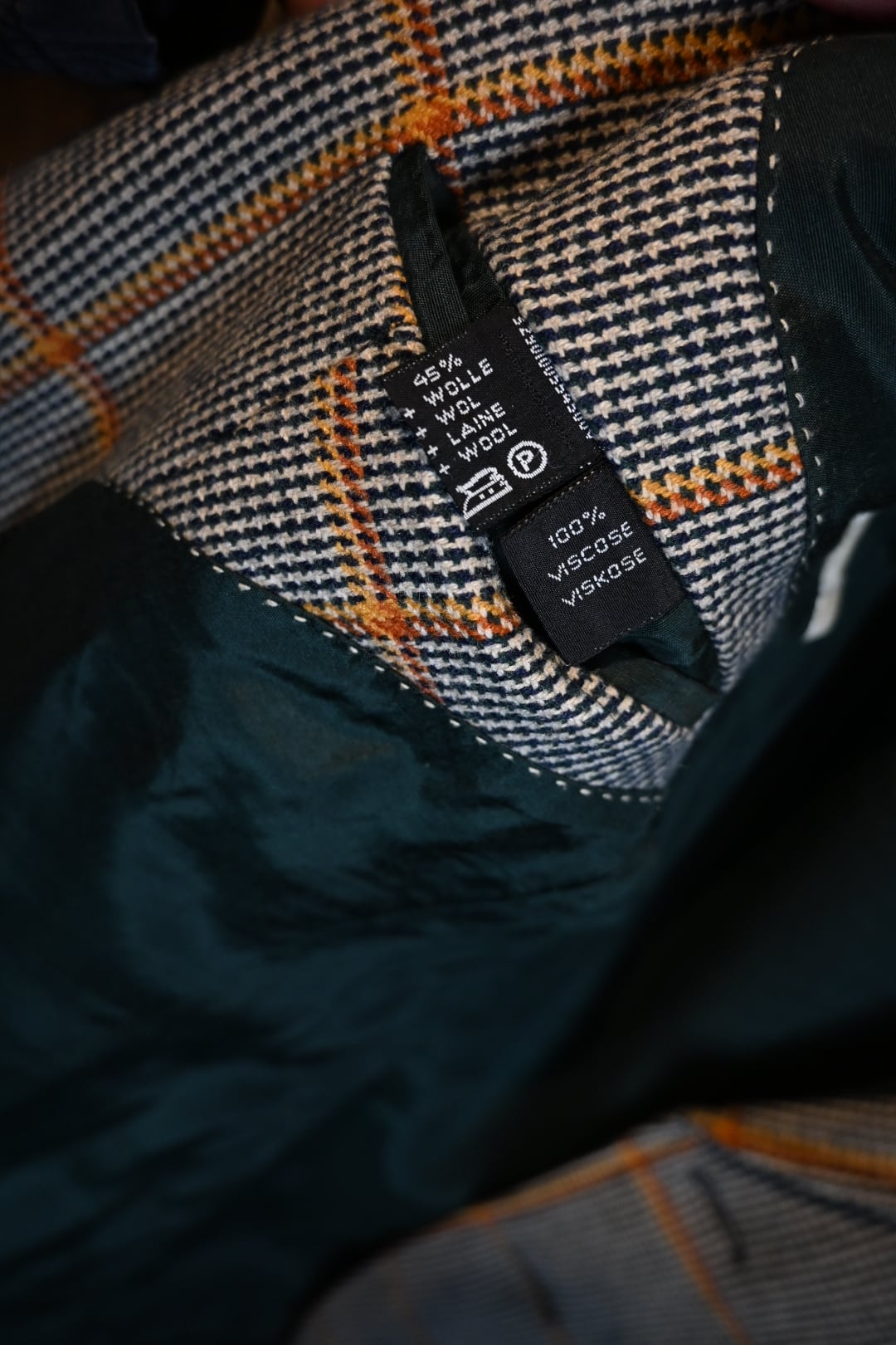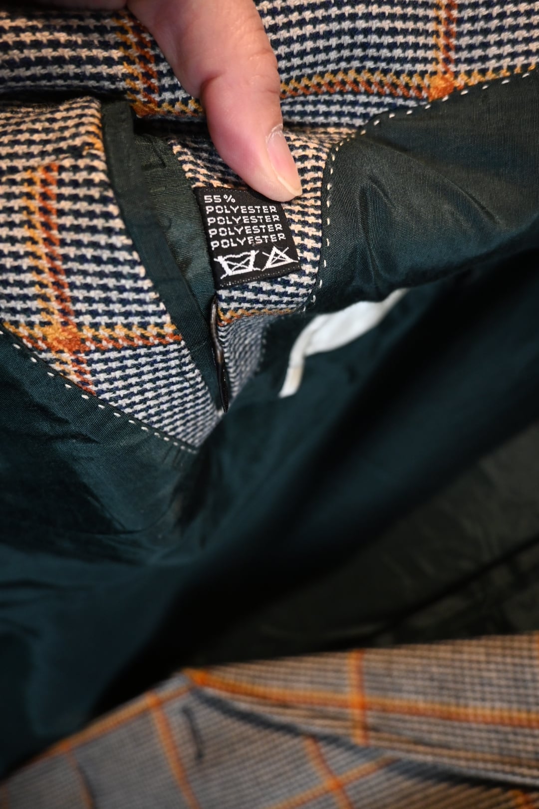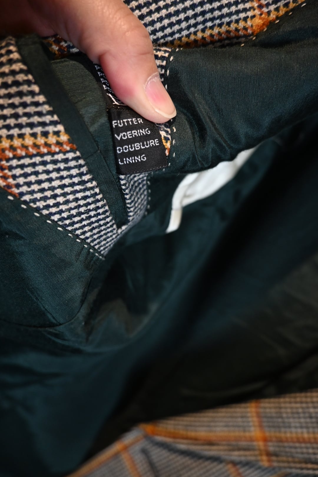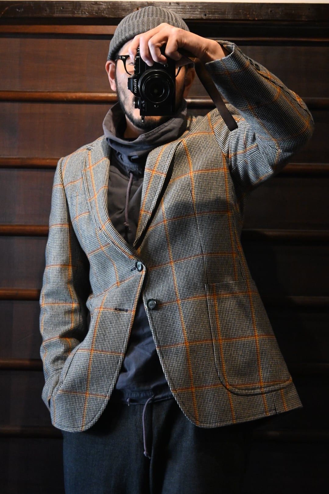 クラシックなハウンドトゥースベースにオレンジのウィンドウペーンチェックが入った英国調デザインで、落ち着いた雰囲気の中にも存在感のある一着です。