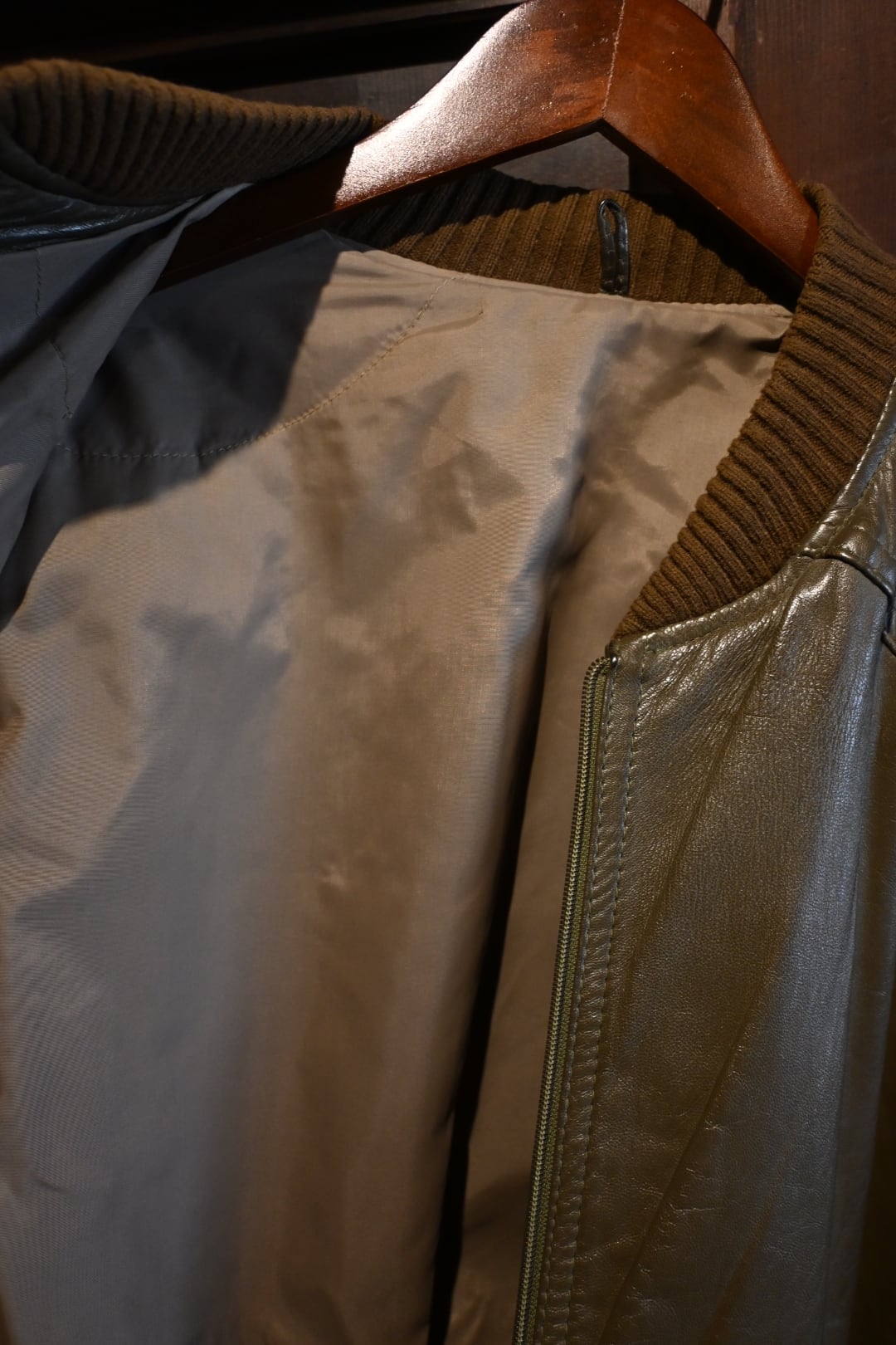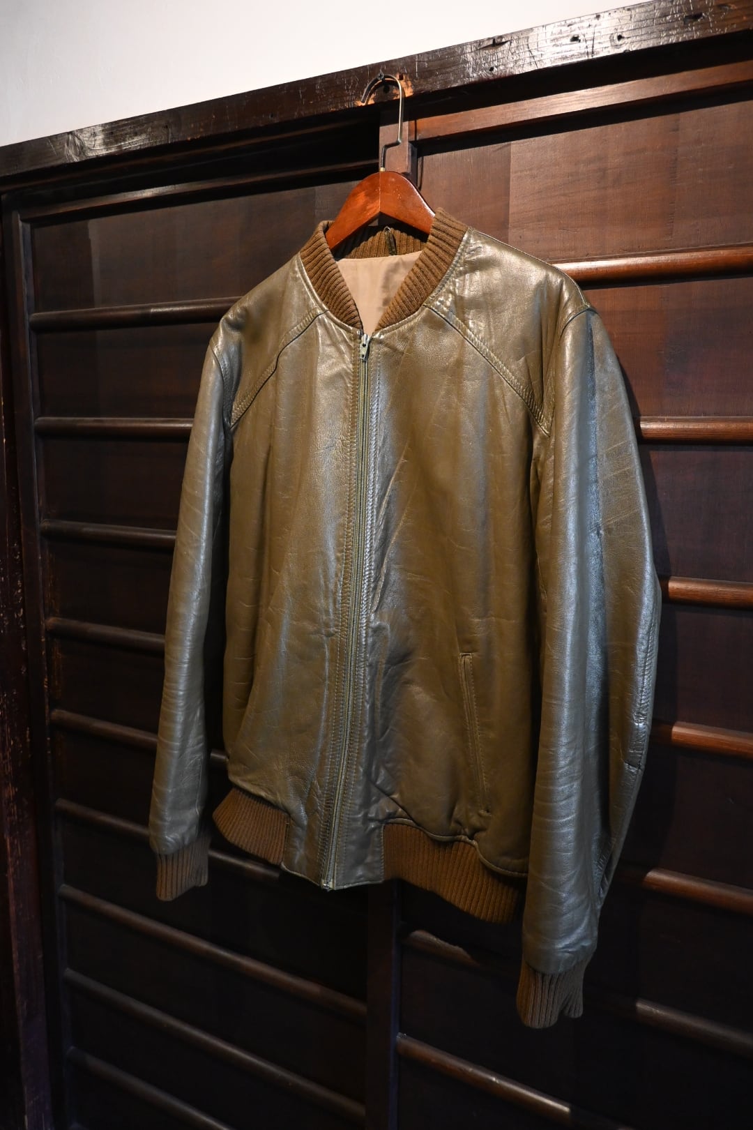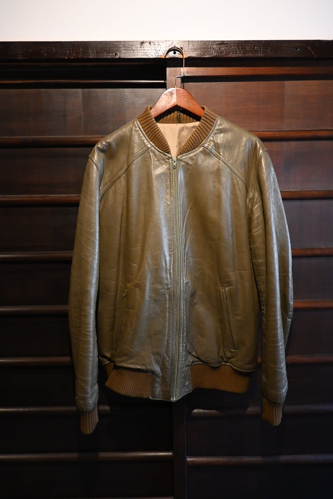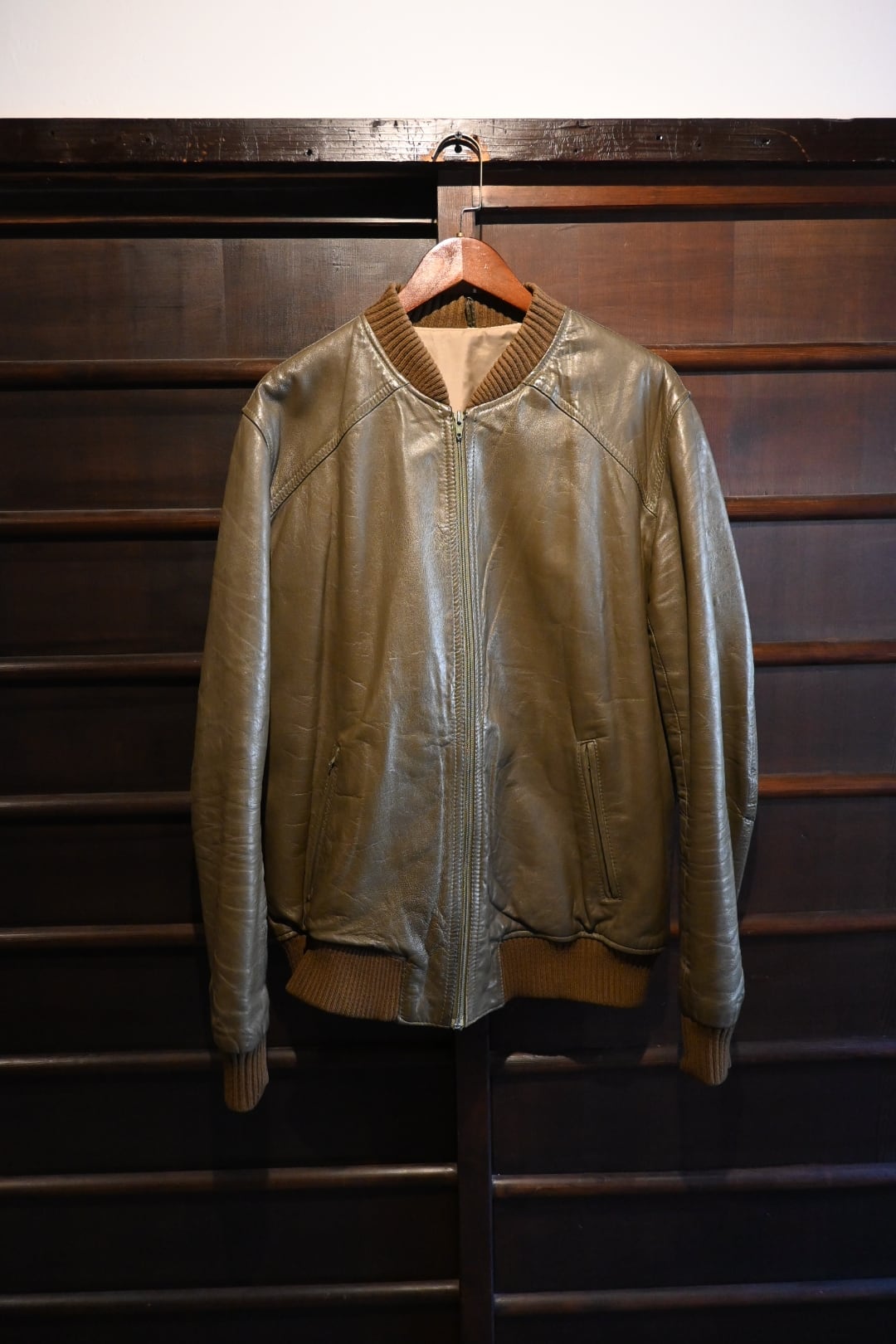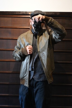 オリーブグリーン〜ブラウン系カラーの上質なスムースレザーを使用した、クラシックなボマージャケットタイプ。