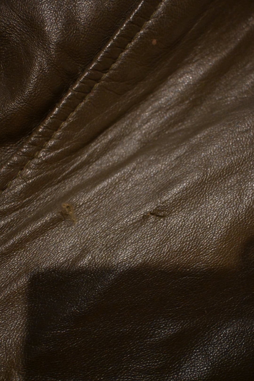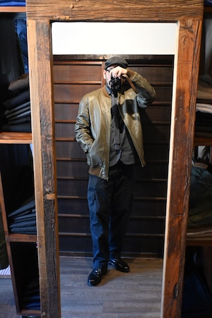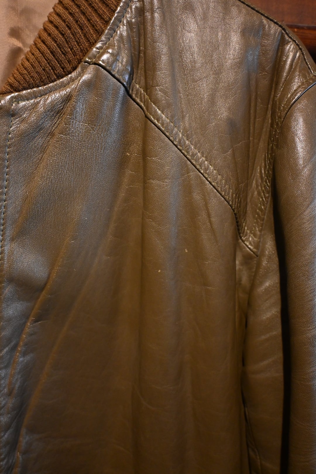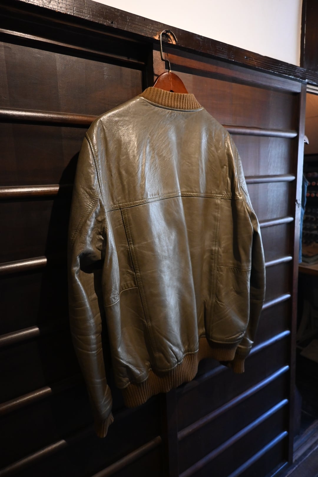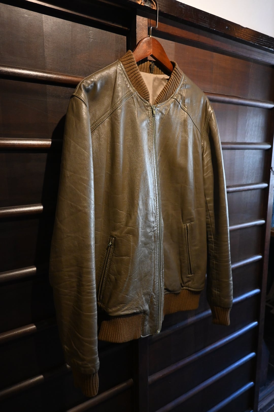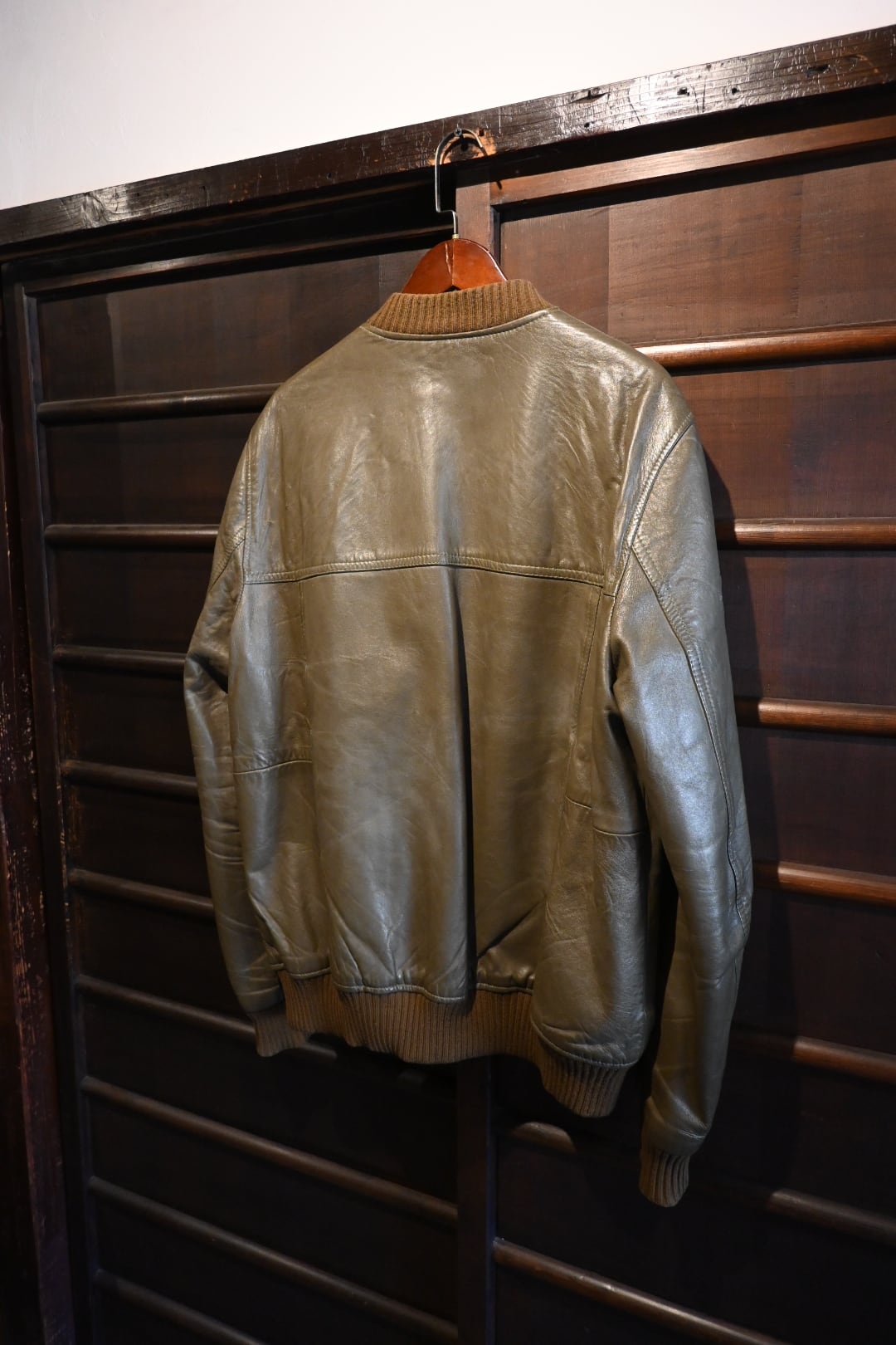 オリーブグリーン〜ブラウン系カラーの上質なスムースレザーを使用した、クラシックなボマージャケットタイプ。
