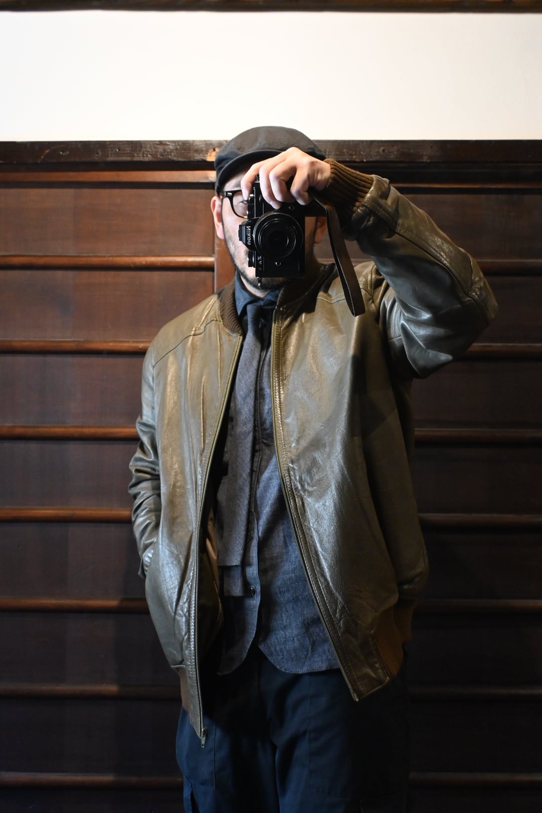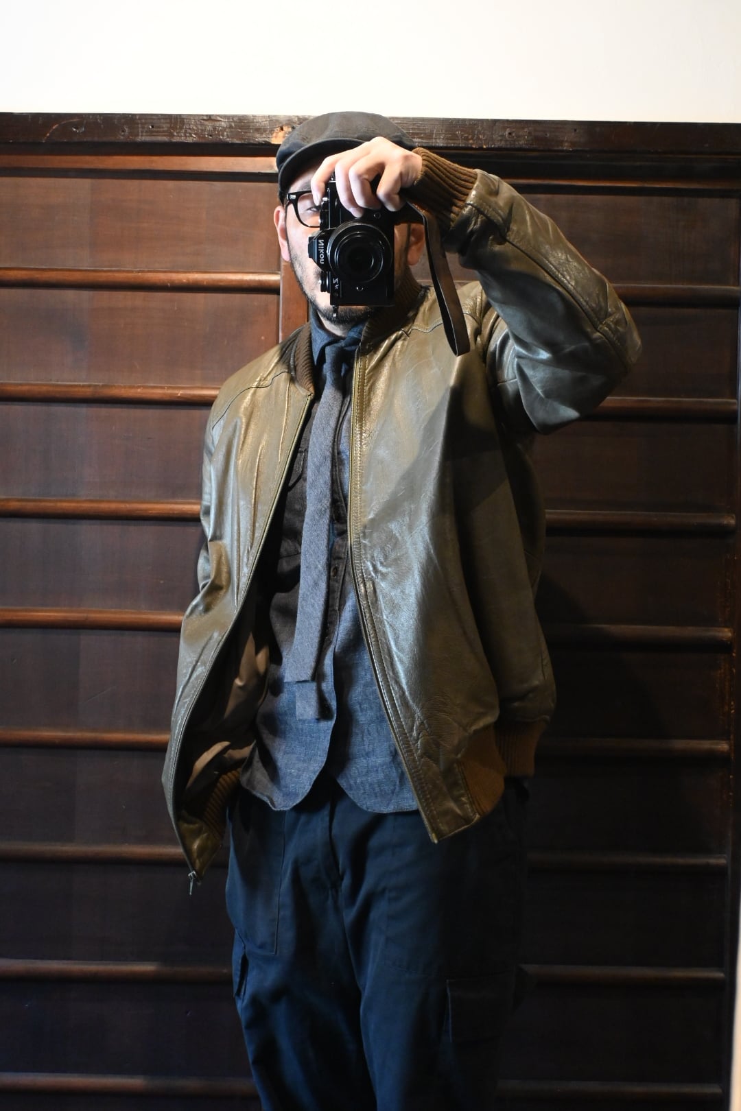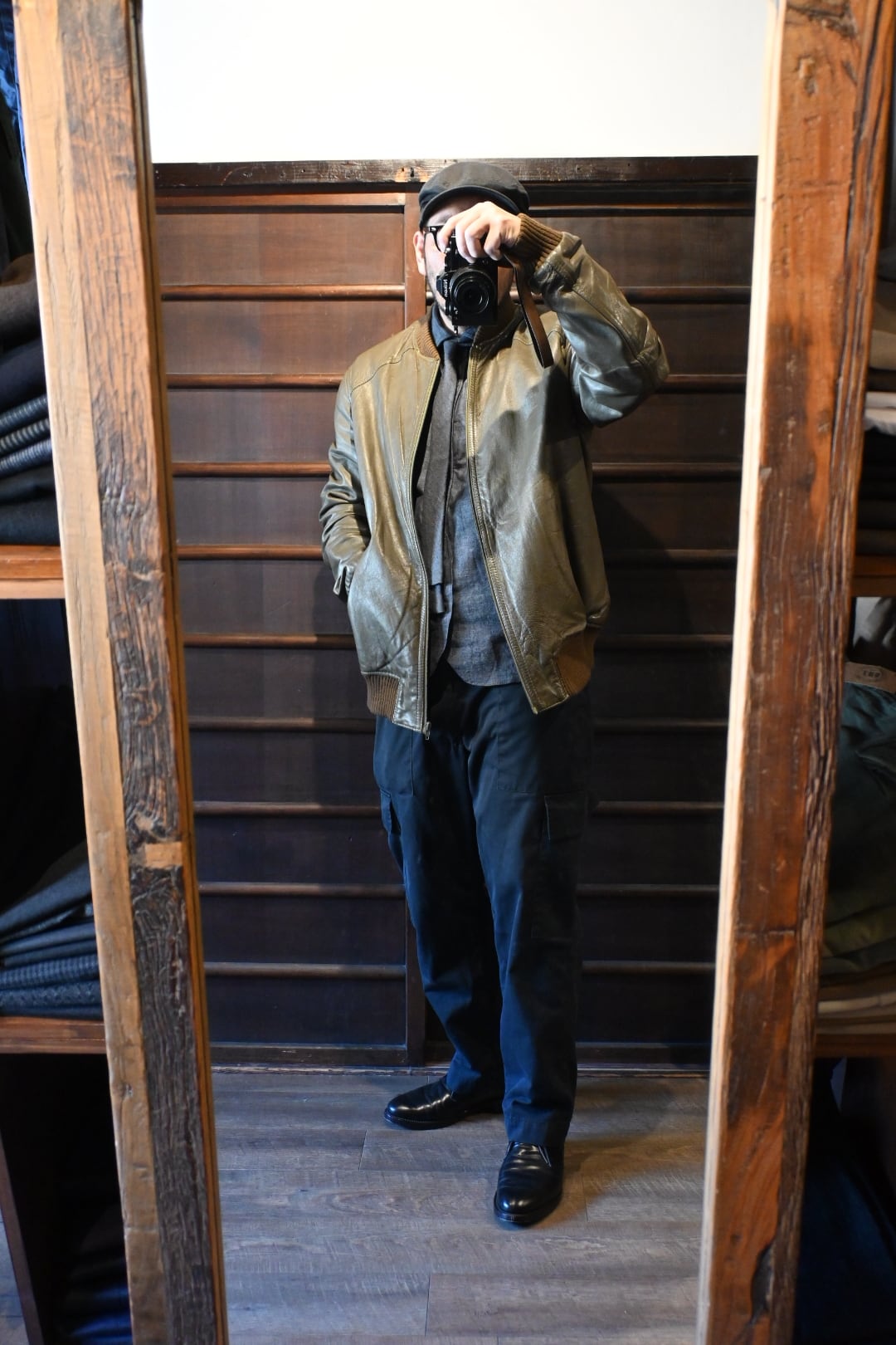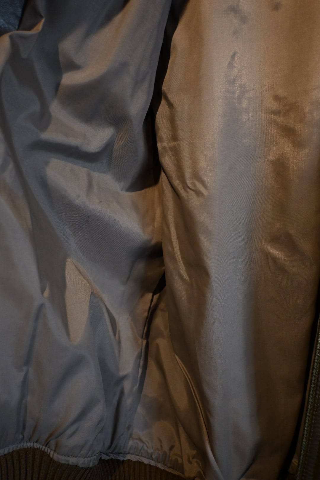 オリーブグリーン〜ブラウン系カラーの上質なスムースレザーを使用した、クラシックなボマージャケットタイプ。