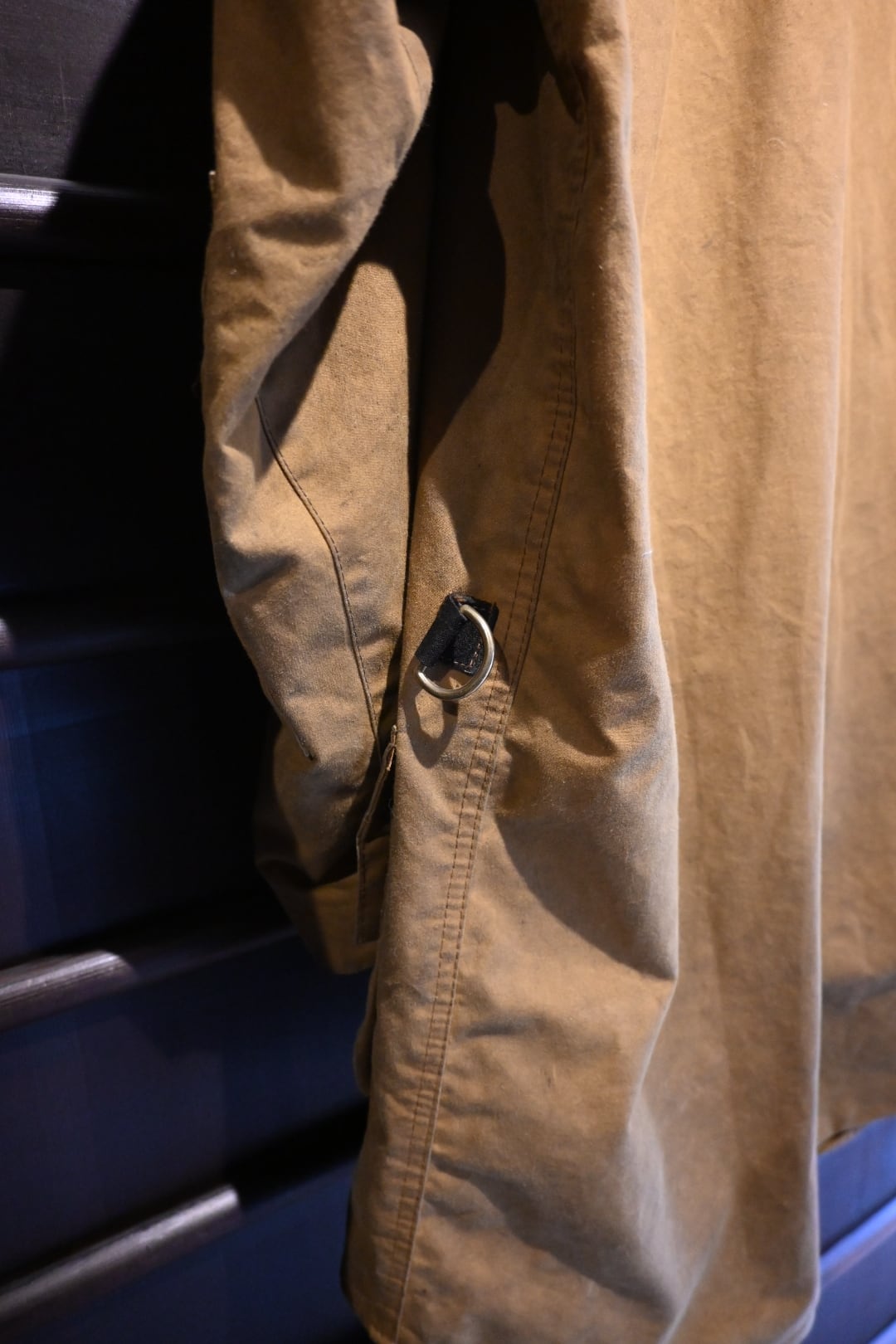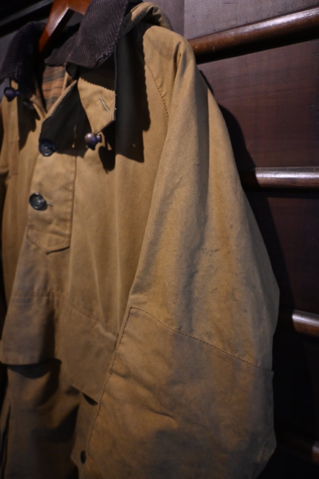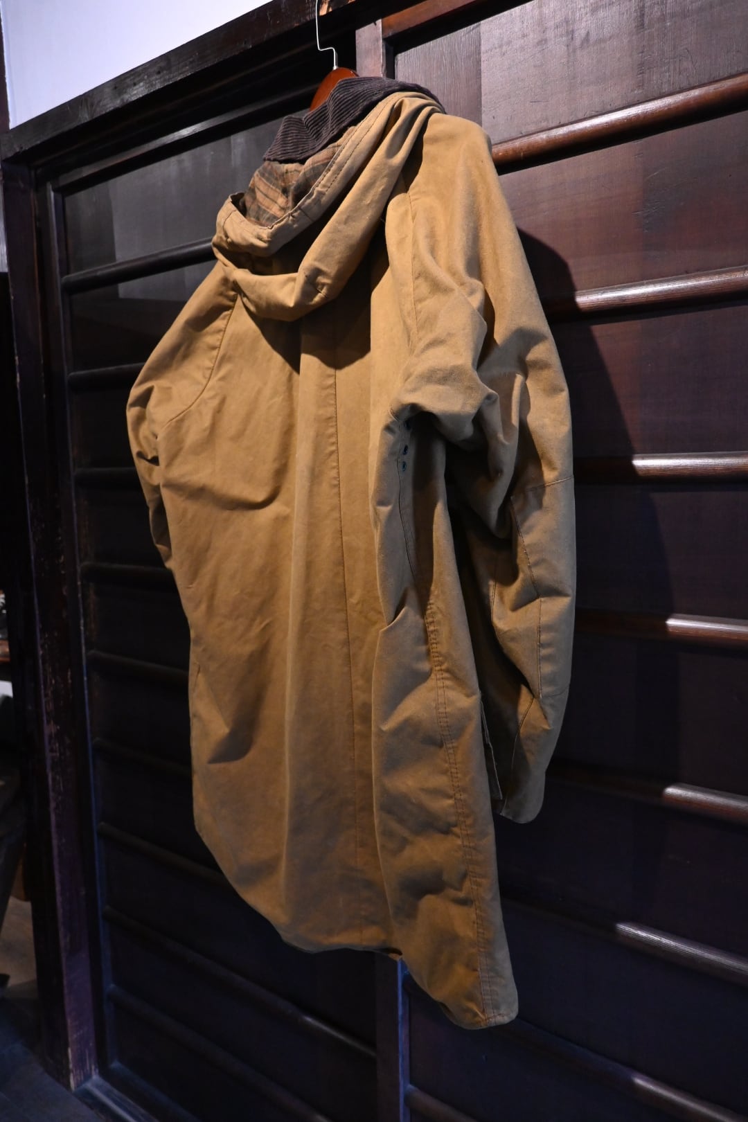 オイルドコットン特有の風合いがしっかり出ており、経年変化、アタリ・色ムラも含めて雰囲気抜群の一着。